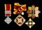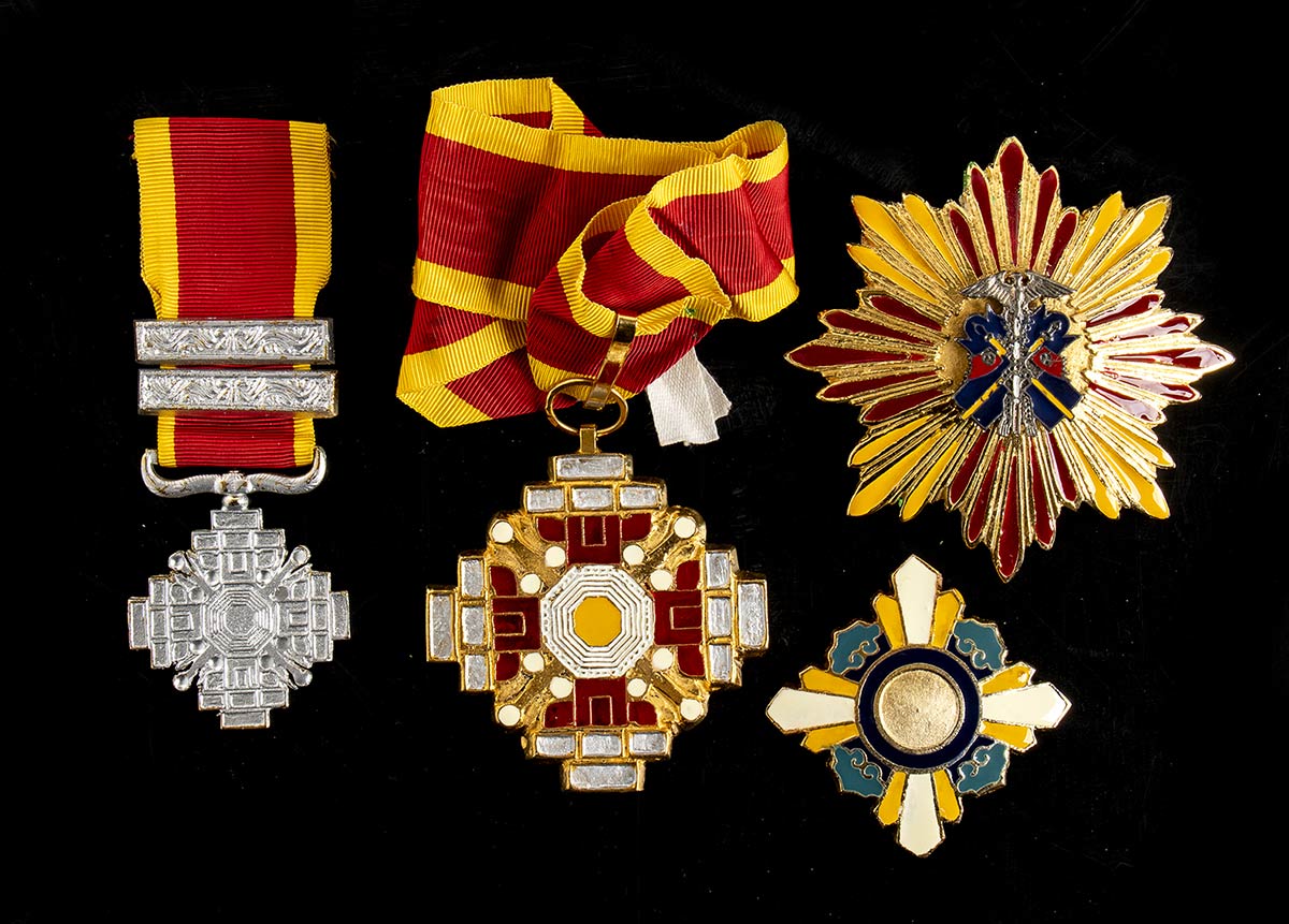 Lotto composto da 4 differenti copie di onorificenze e medaglie dell'Impero cinese, dal Manchukuo occupato, usate sul set del film L'ULTIMO IMPERATORE di Bernardo Bertolucci, del 1974. Realizzate in metallo bianco e smalti, copie di produzione cinematografica. Misure varie, dai 40mm ai 90mm. Buone condizioni