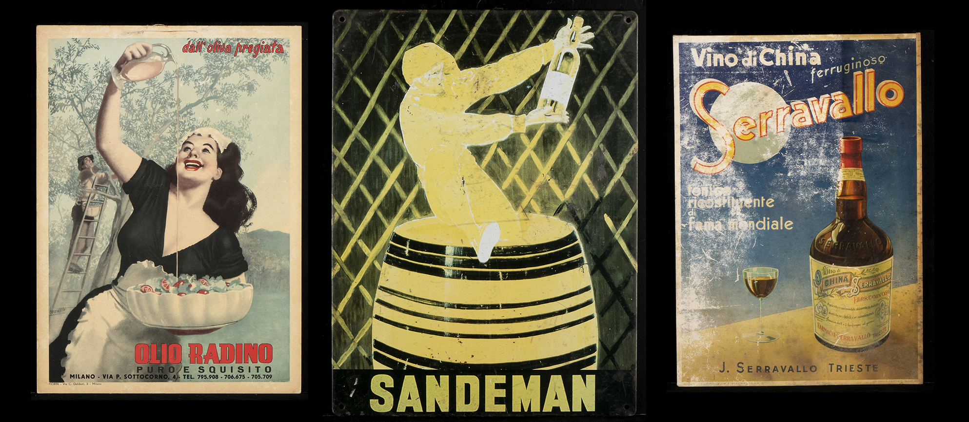 Cartoncino OLIO RADINO firmato Boccasile cm.25x35, liquore SANDEMAN in latta litografata cm.30x40, Vino di China Ferruginoso SERRAVALLO di Trieste cartoncino cm.23x32. Originali, anni '30. Condizioni B-C