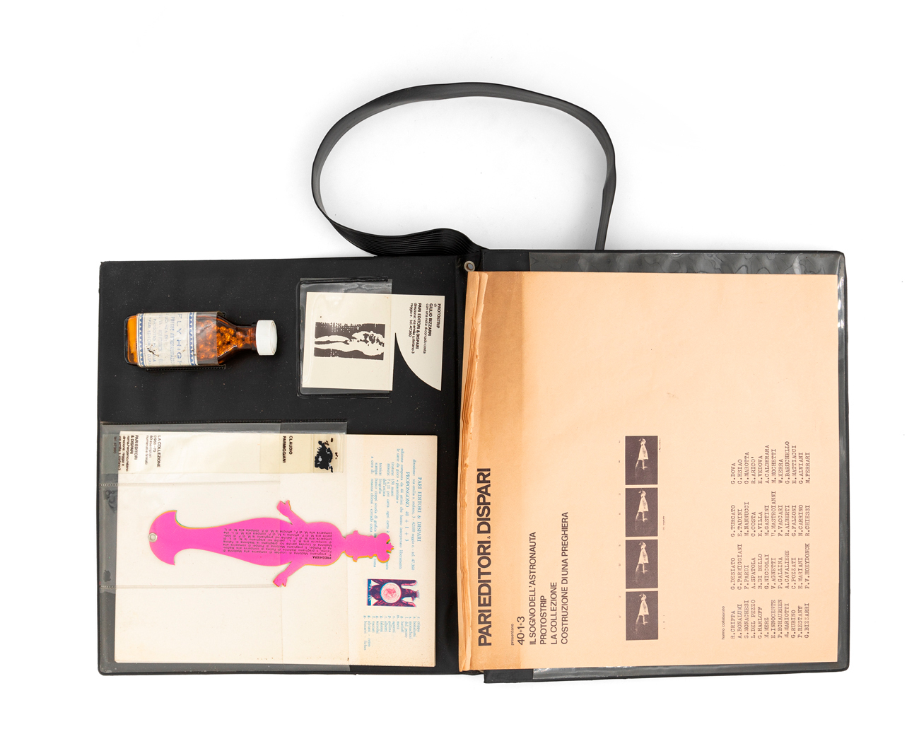 Si allega un contenitore a tracolla edito da Pari Editori & Dispari a presentazione delle edizioni '40+1+3', 'Il sogno dell'astronauta' di Paul Van Hoeydonck, 'Protostrip' di Giulio Bizzarri, 'Collezione' di Claudio Parmiggiani, 'Rubino e le apparizioni' di Giovanni Rubino