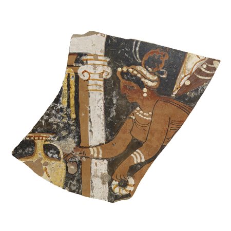 Frammento di vaso chiuso con busto di figura femminile recante offerte di fronte a un naiskos contenente un'hydria