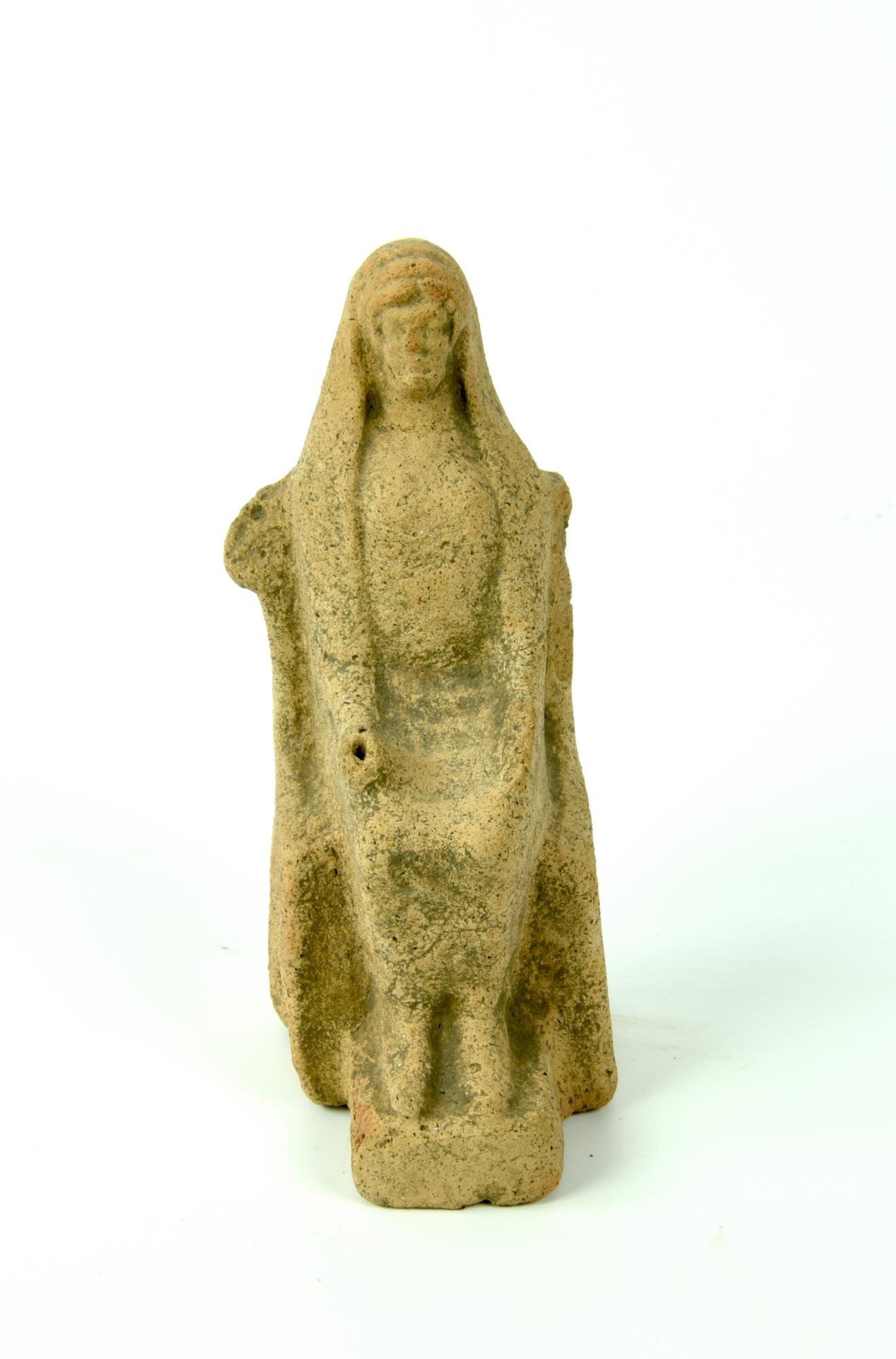 Figura di divinità femminile, ieraticamente assisa su un trono dall'alto schienale e provvisto di suppedaneo, rappresentata in posizione frontale col velo che copre i capelli e scende lungo i fianchi, le braccia appoggiate sulle ginocchia. Un piccolo foro nella mano destra fa supporre che la dea reggesse un fiore od un frutto oggi perduto