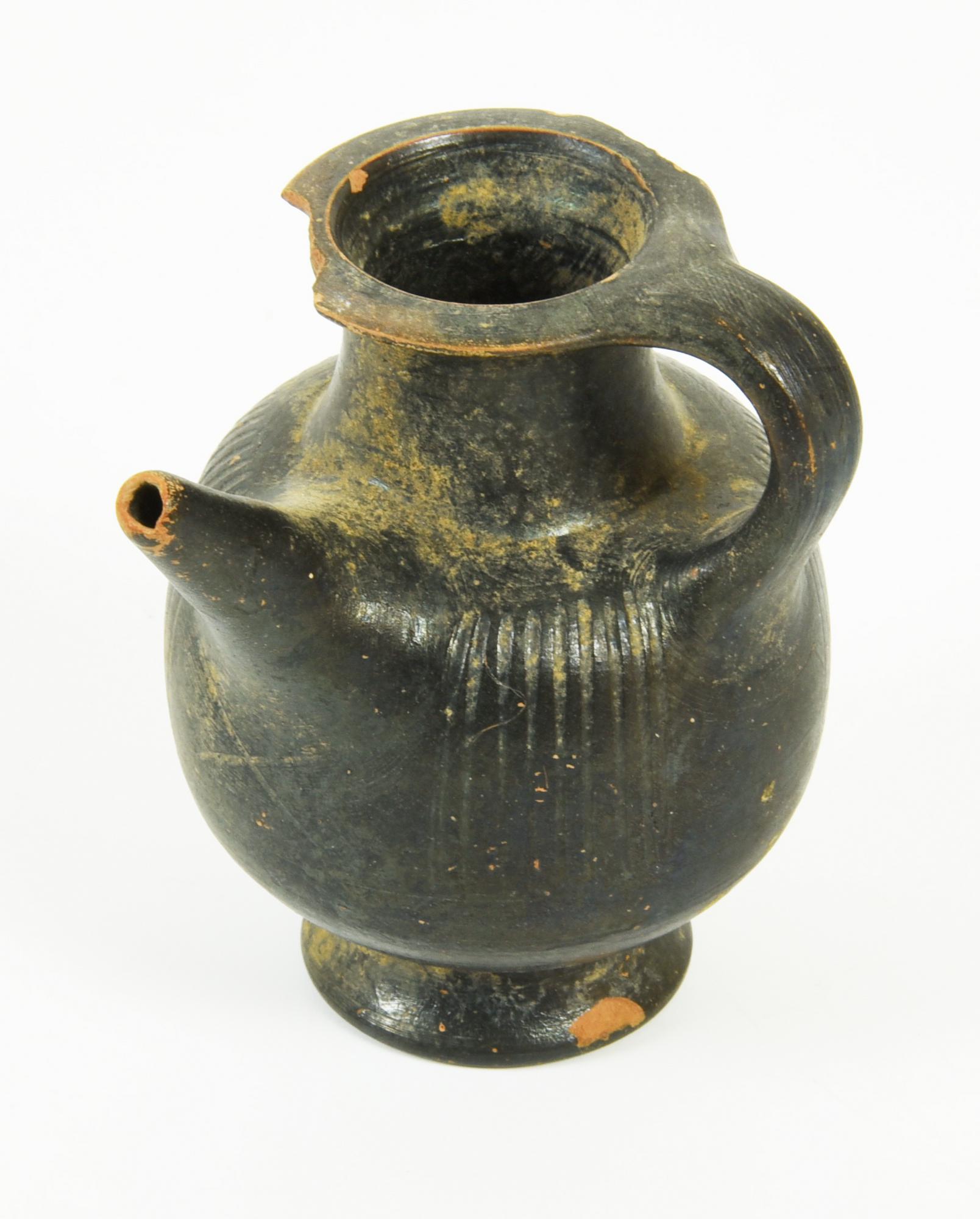 Guttus con orlo a tesa, breve collo cilindrico a profilo concavo, corpo globulare baccellato, piede troncoconico, versatoio conico impostato obliquamente sulla spalla, ansa a nastro verticale dall'orlo alla spalla