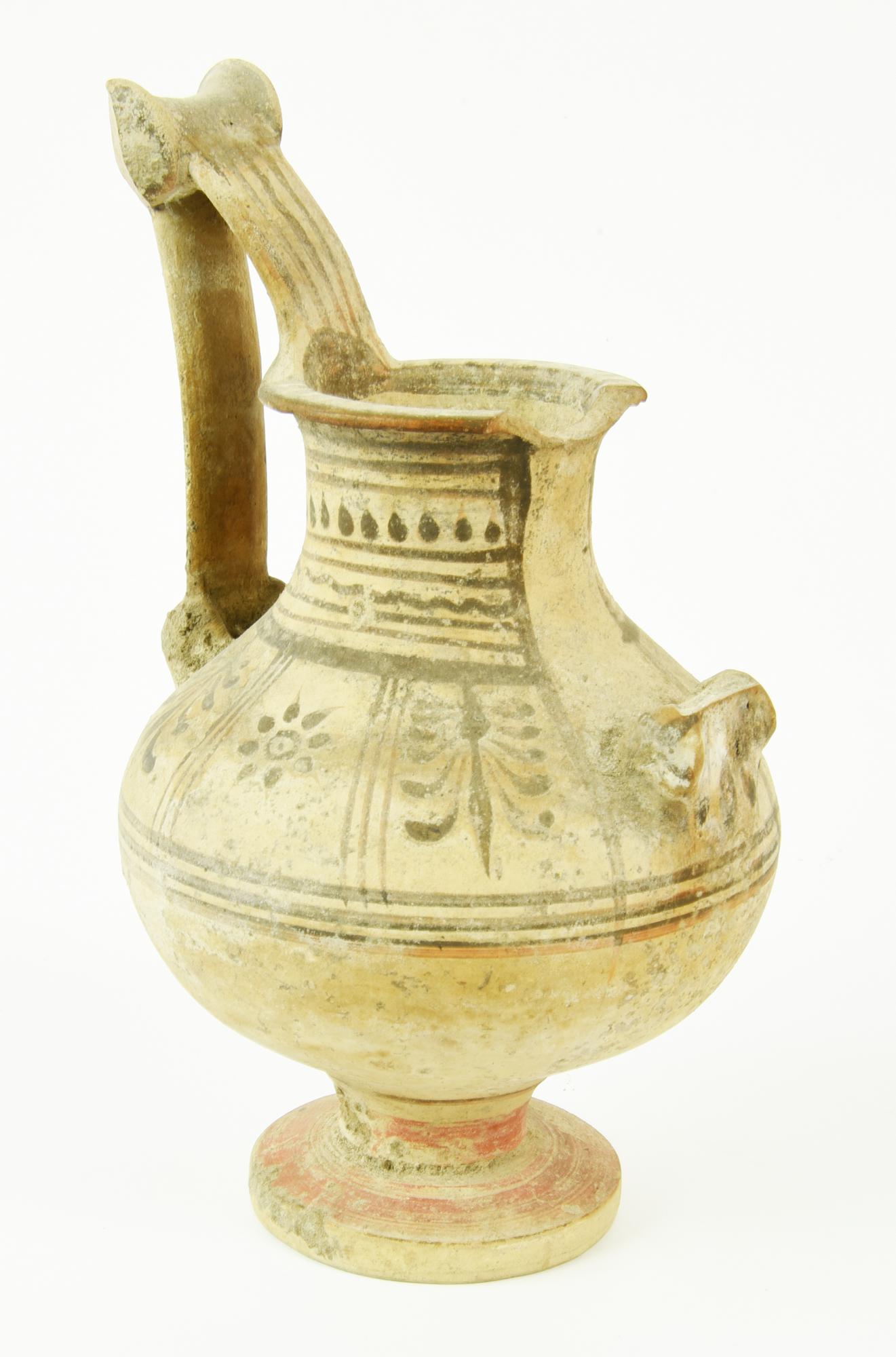 DECORAZIONE: labbro verniciato anche internamente in paonazzo, cosè come il piede ed i profili delle anse e delle rotelle, sul collo e sulla spalla campiture con motivi fitomorfi e geometrici, parte inferiore del corpo decorata a filetti alternati in bruno e paonazzo che si ripetono anche sul piede