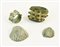 Due anelli, uno esagonale con rilievi paralleli, l'altro cilindrico con elementi cilindrici sporgenti, una conchiglia ed un volto femminile