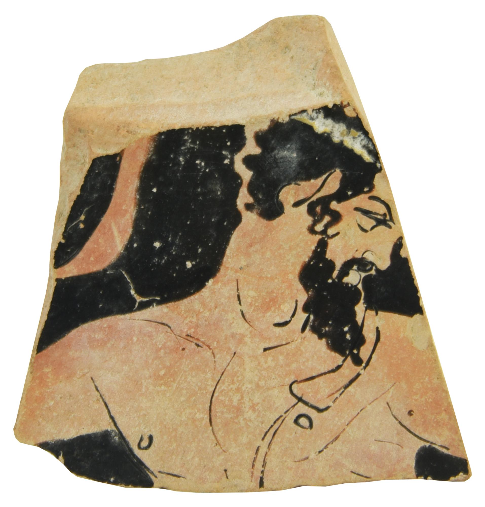 Frammento quadrangolare pertinente ad un cratere con la testa ed il torace di un satiro stante a destra e retrospicente, con lunghi capelli e barba ricciuta, tenia fra i capelli