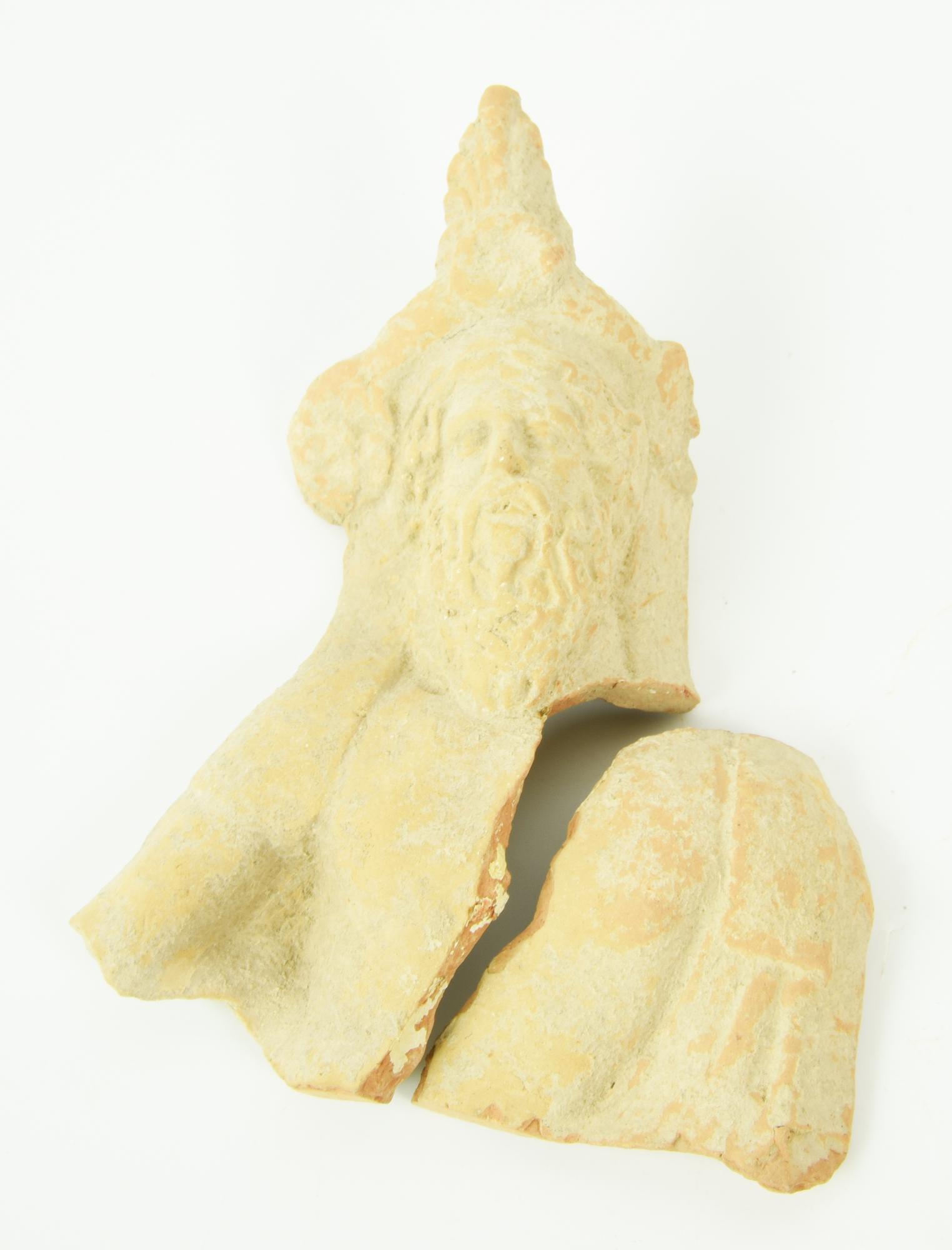 Busto maschile di uomo maturo, pertinente ad una statuetta di banchettante, l'uomo è raffigurato recumbente a destra, col torace scoperto, indossa una corona sormontata da una palmetta e desinente in due fiori di ibisco ai lati, ha lunghi capelli e folta barba che gli ricade sul petto; il volto pur nelle piccole dimensioni è realizzato con grande accuratezza