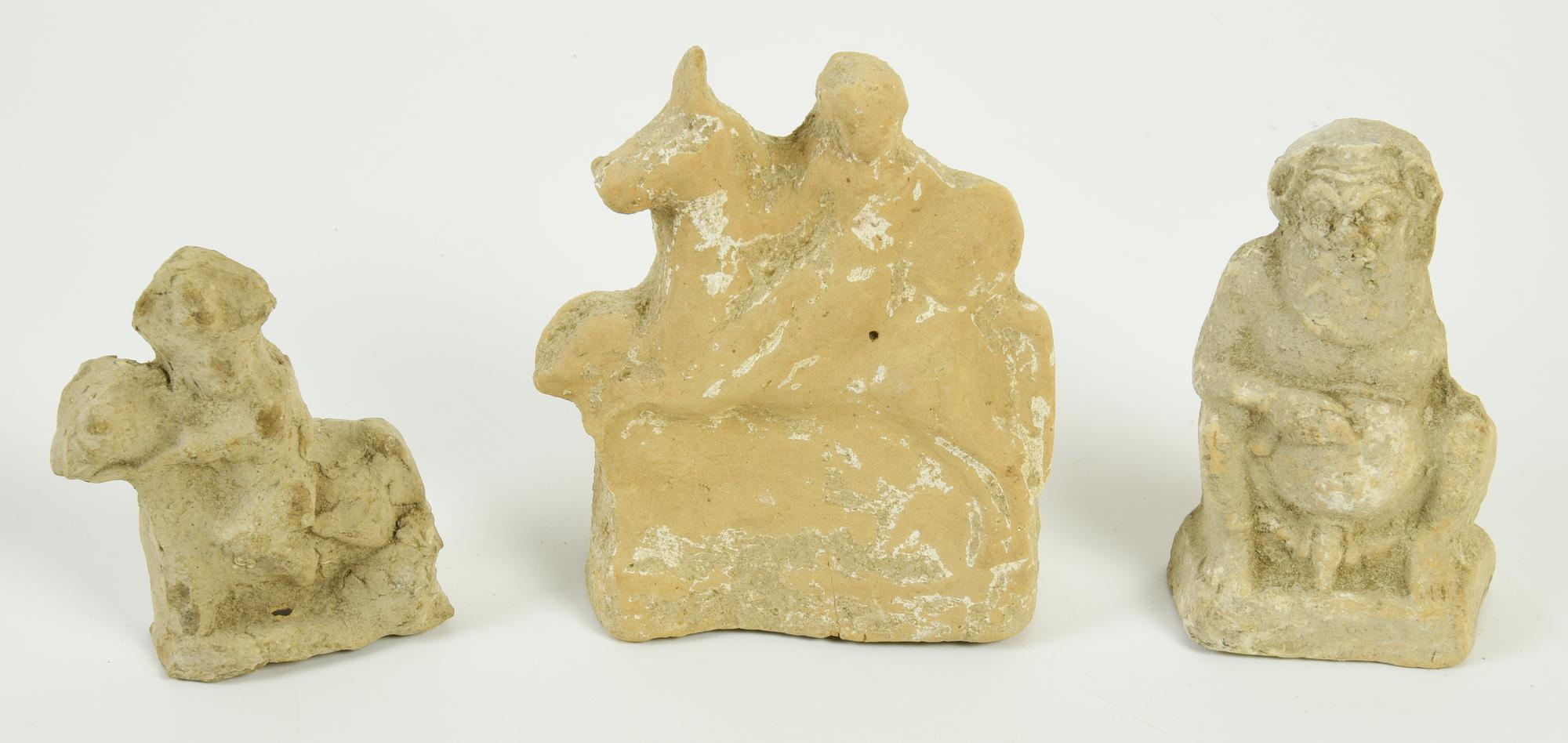 Statuetta di Sileno nudo, anziano, seduto in posizione accosciata, calvo con lunghe orecchie appuntite, folta barba, ventre prominente e sesso in evidenza; una statuetta raffigurante Europa, nuda, mentre viene rapita dal toro, qui raffigurato rampante ed una statuetta molto consunta di cavaliere