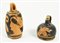 Due lekythoi una con corpo ovoide e piede ad anello decorata sul collo con falsa baccellatura, sotto l'ansa con palmetta aperta a ventaglio e profilo femminile volto a destra; lekythos ariballica con corpo lenticolare schiacciato e piede ad anello decorata con sfinge accosciata volta a destra