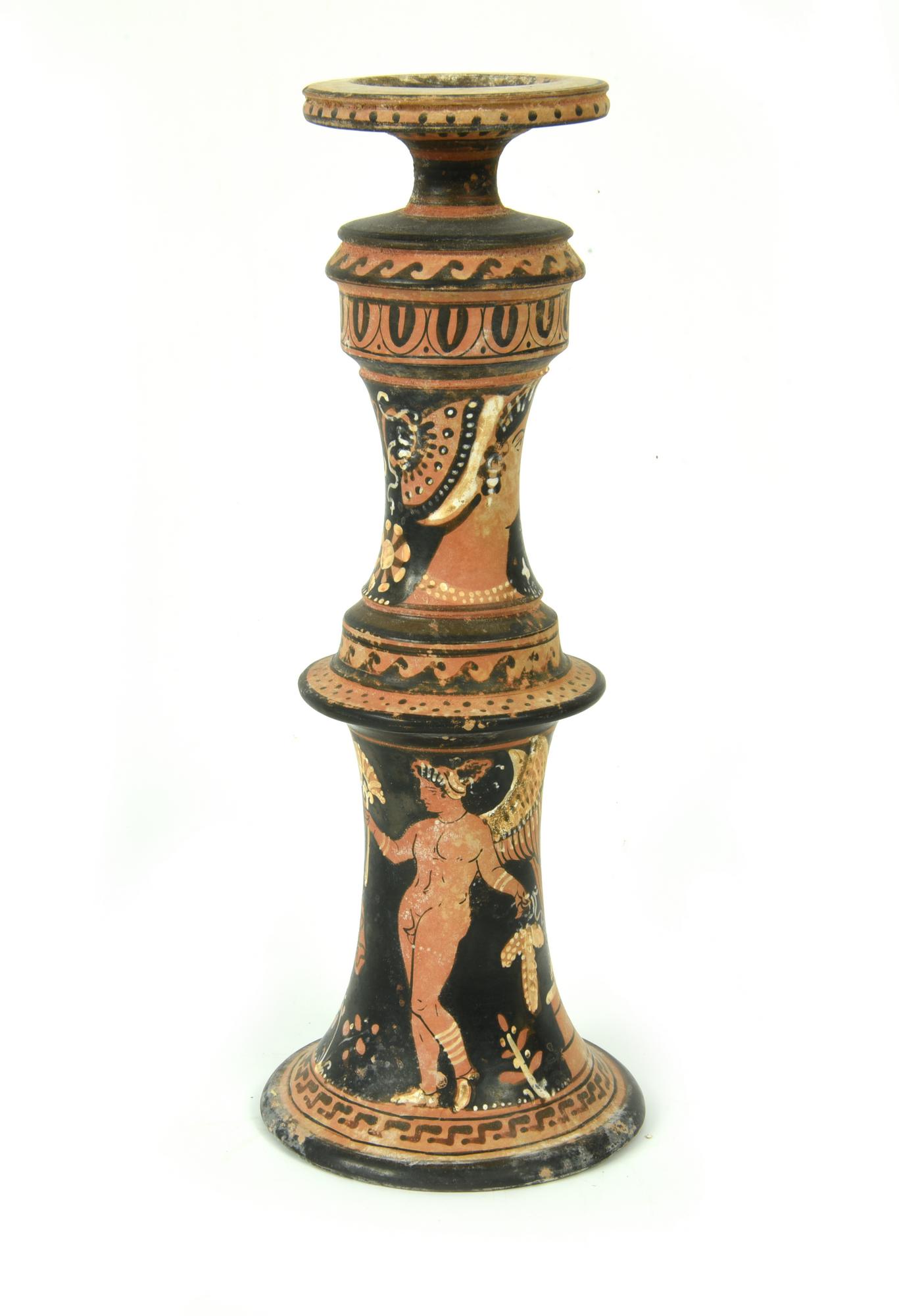 DECORAZIONE: elemento superiore decorato da due profili femminili affrontati con kekryphalos ricamato da cui fuoriesce un ciuffo di capelli, stephane radiata, orecchini pendenti e doppio filo di perle al collo. La scena è delimitata superiormente da un meandro ad onda destrorso ed un kyma ionico, inferiormente da un altro meandro ad onda destrorso. Nella parte inferiore dello stelo sono raffigurati un erote nudo gradiente a destra con kekryphalos, armille ai polsi ed alle caviglie che tiene flabello nella destra ed un grappolo d'uva nella sinistra; di fronte a lui una giovane donna con un chitone plissettato lungo fino a terra ed il mantello drappeggiato sul braccio sinistro, gradiente a sinistra con uno specchio nella sinistra ed una tenia nell'altra mano; fra i due un'ara col fuoco acceso; delimita la scena un meandro interrotto destrorso.