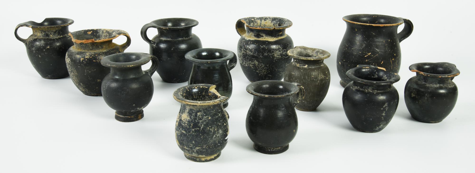 Dodici brocchette con labbro svasato, breve collo cilindrico a profilo concavo, corpo ovoide, fondo piatto o piede ad anello, ansa a nastro impostata verticalmente dal labbro alla spalla