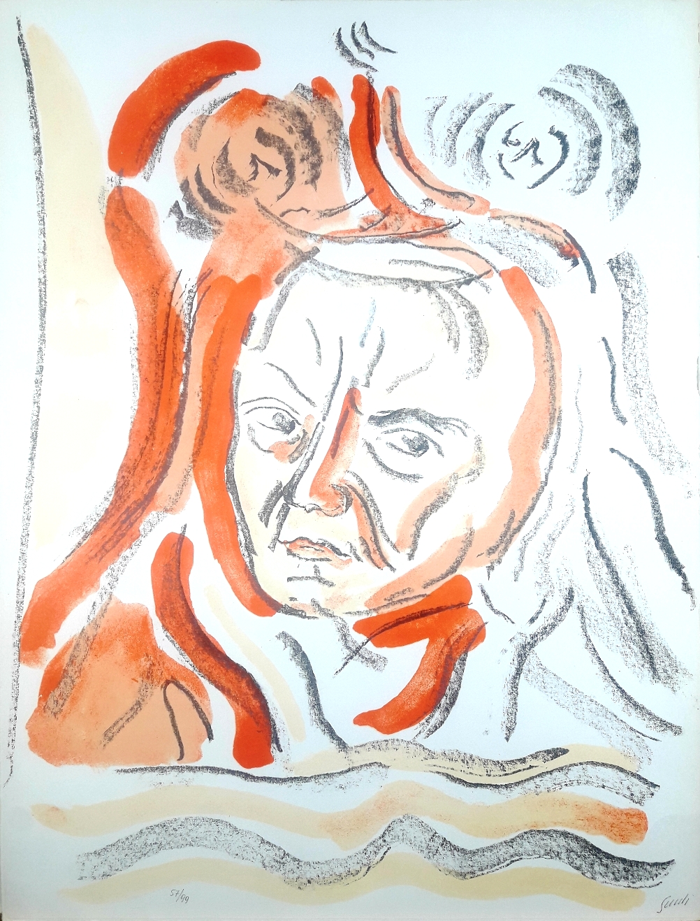 GUIDI VIRGILIO Roma 1891-Venezia 1984 “Autoritratto” litografia su cartoncino cm 48x64 del 1977. Timbro a secco e firma a matita sul fronte in basso a destra, tiratura 57/99 a sinistra.