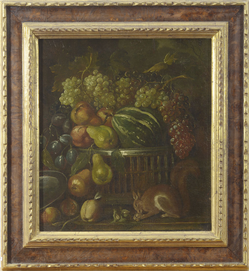 Lot 76 | Scuola italiana Natura morta con frutta e scoiattolo Olio su tela su tavolo...