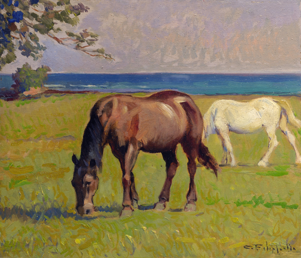 Cafiero Filippelli (Livorno, 1889 - 1973) CAVALLI AL PASCOLO Olio su compensato, cm. 24x27,5 Firma in basso a destra.