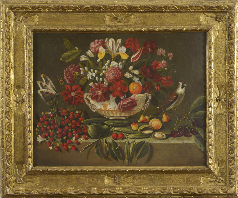Scuola fiamminga Natura di fiori e frutti cornice Olio su tela, in cornice...