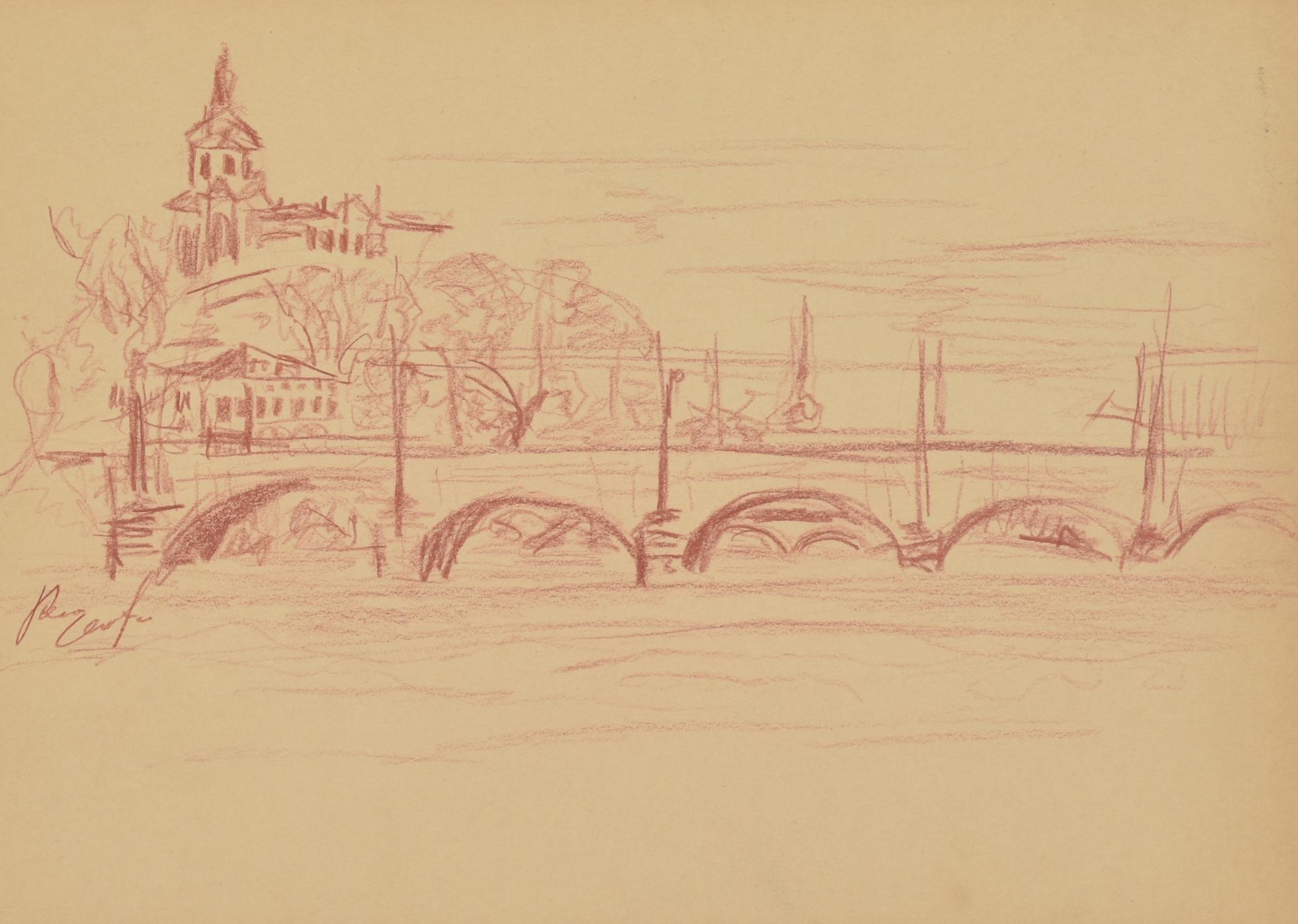 Piero Cerato TORINO. PONTE SUL PO sanguigna su carta, cm 25x35 firma L'opera...