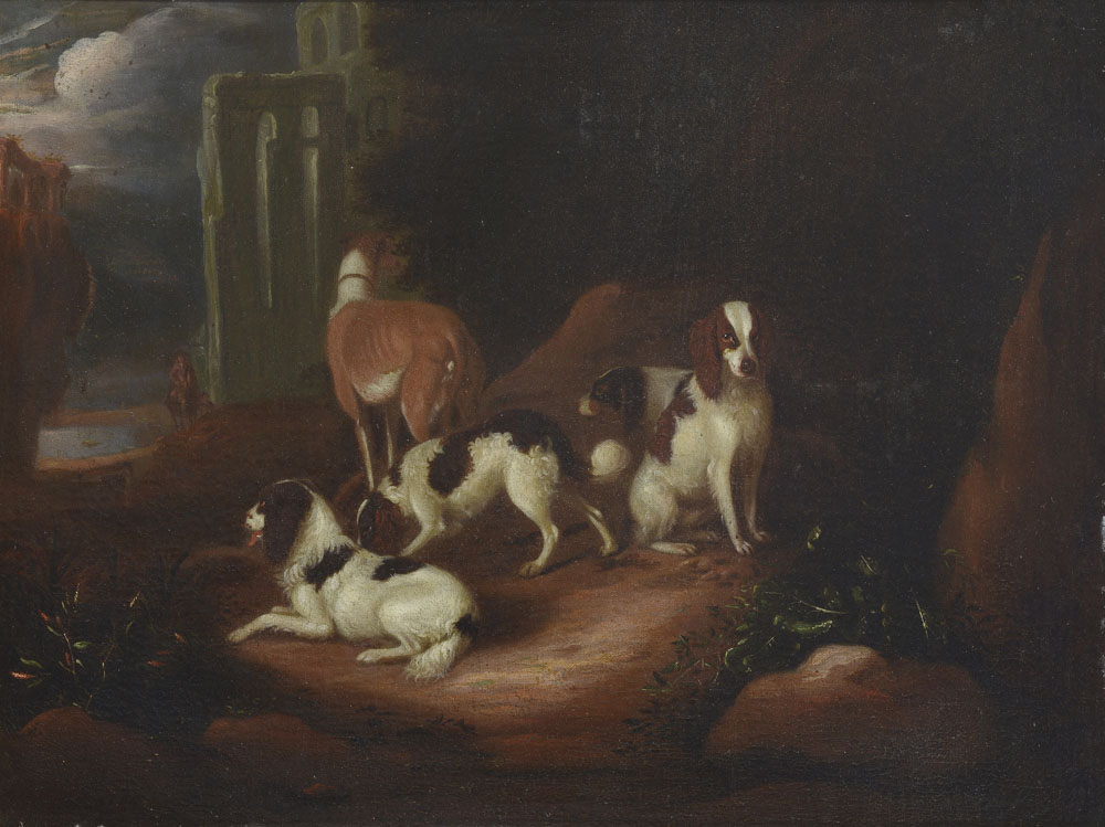 Beeldemaker specialised in representing landscapes with animals – dogs and foxes in particular – both posed portraits and during hunts. In this painting the protagonists are hunting dogs at rest, and it is possible to identify the breed: English Cocker Spaniels in the foreground and a Lurcher in the background. The human presence is limited to a horseman in the background.