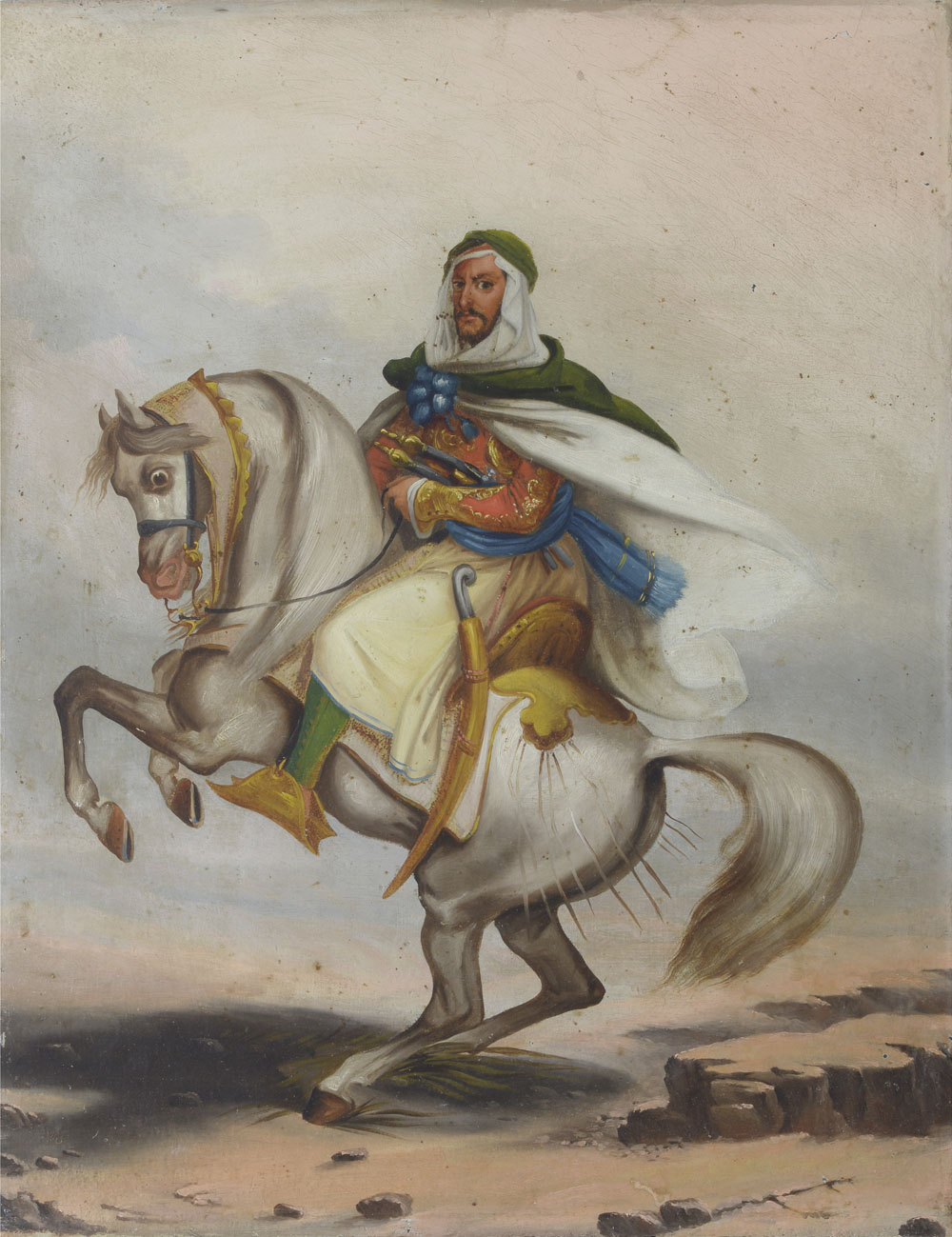 Scuola europea del XIX secolo Cavaliere berbero Olio su rame cm. 54x42,5