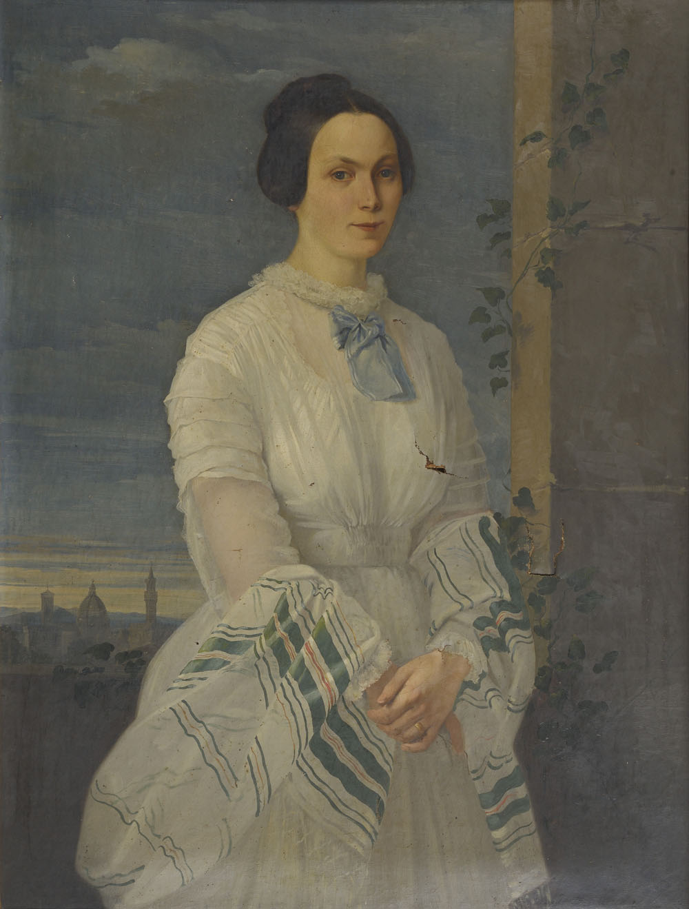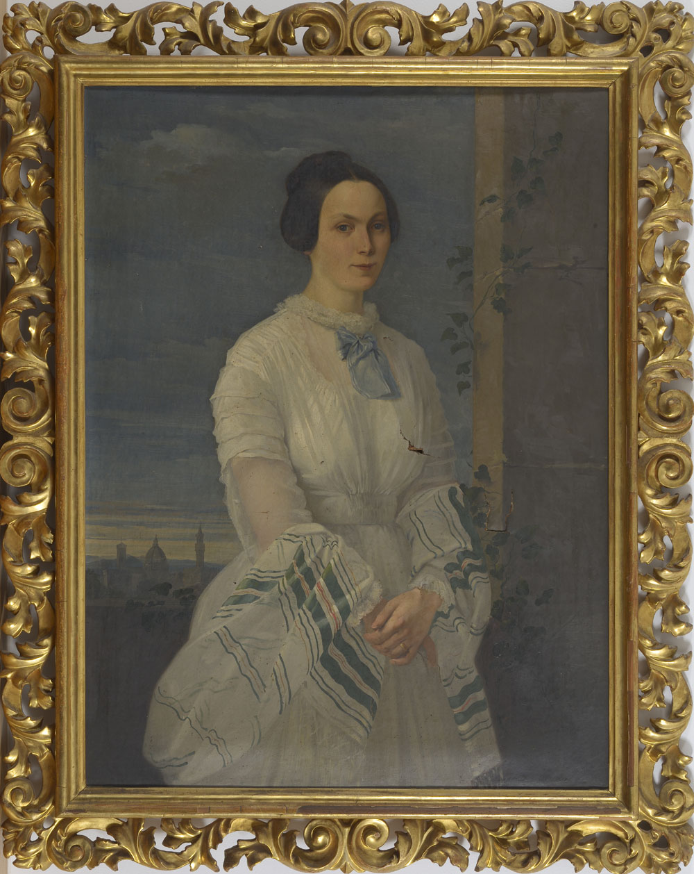 Scuola italiana della prima metà del XIX secolo Ritratto di gentildonna con veduta della città di Firenze