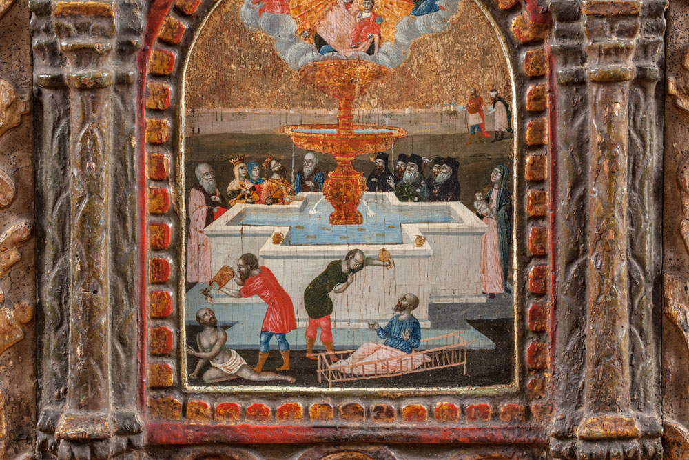Affascinante la complessa iconografia del dipinto; intorno alla grande vasca una dettagliata scena illustra in primo piano i malati che ricevono la guarigione miracolosa, i sacerdoti, un Imperatore Bizantino con la sua famiglia. La versione narrata dalle cronache di Callisto Niceforo descrive l’episodio in cui l’Imperatore Leone I (457-474 AD), ancora un semplice soldato, incontrò un cieco che gli chiese dell’acqua, allora una voce lo guidò alla Fonte , gli profetizzò che sarebbe divenuto Imperatore e lo ingiunse a costruire una chiesa in quel luogo, così come egli fece.