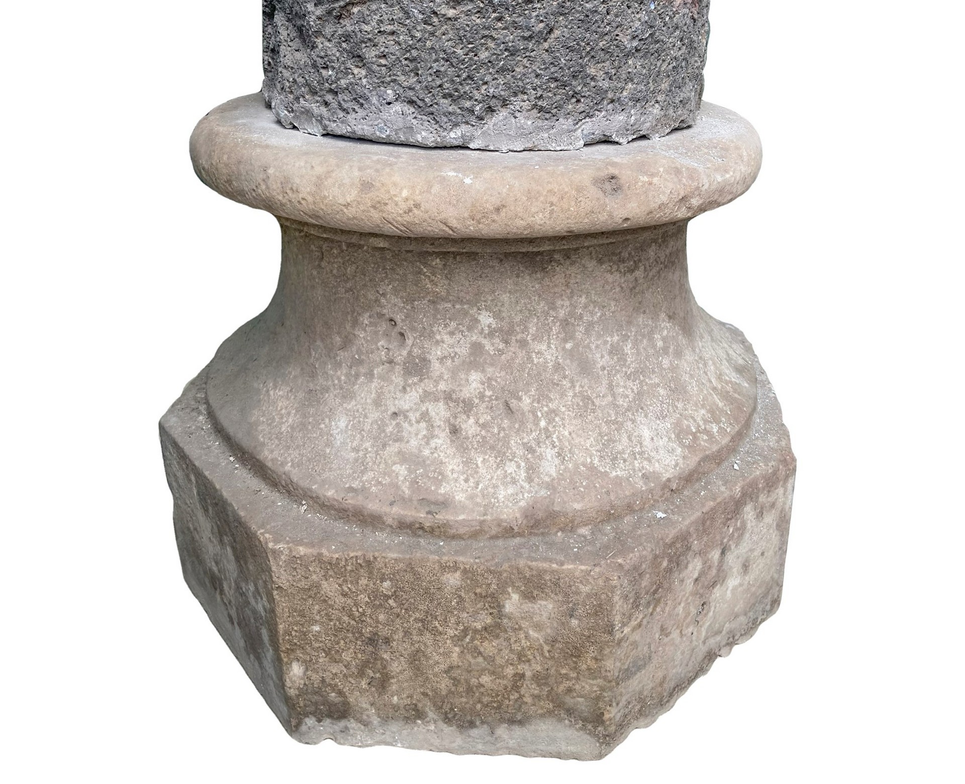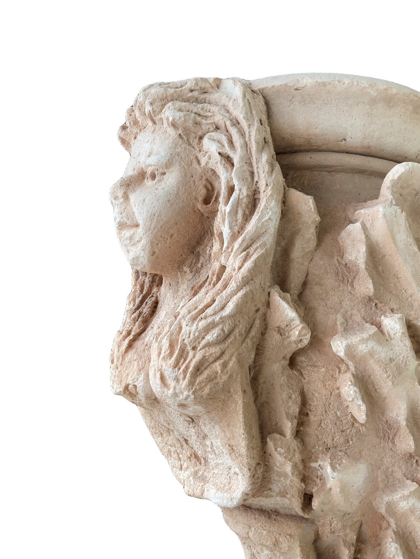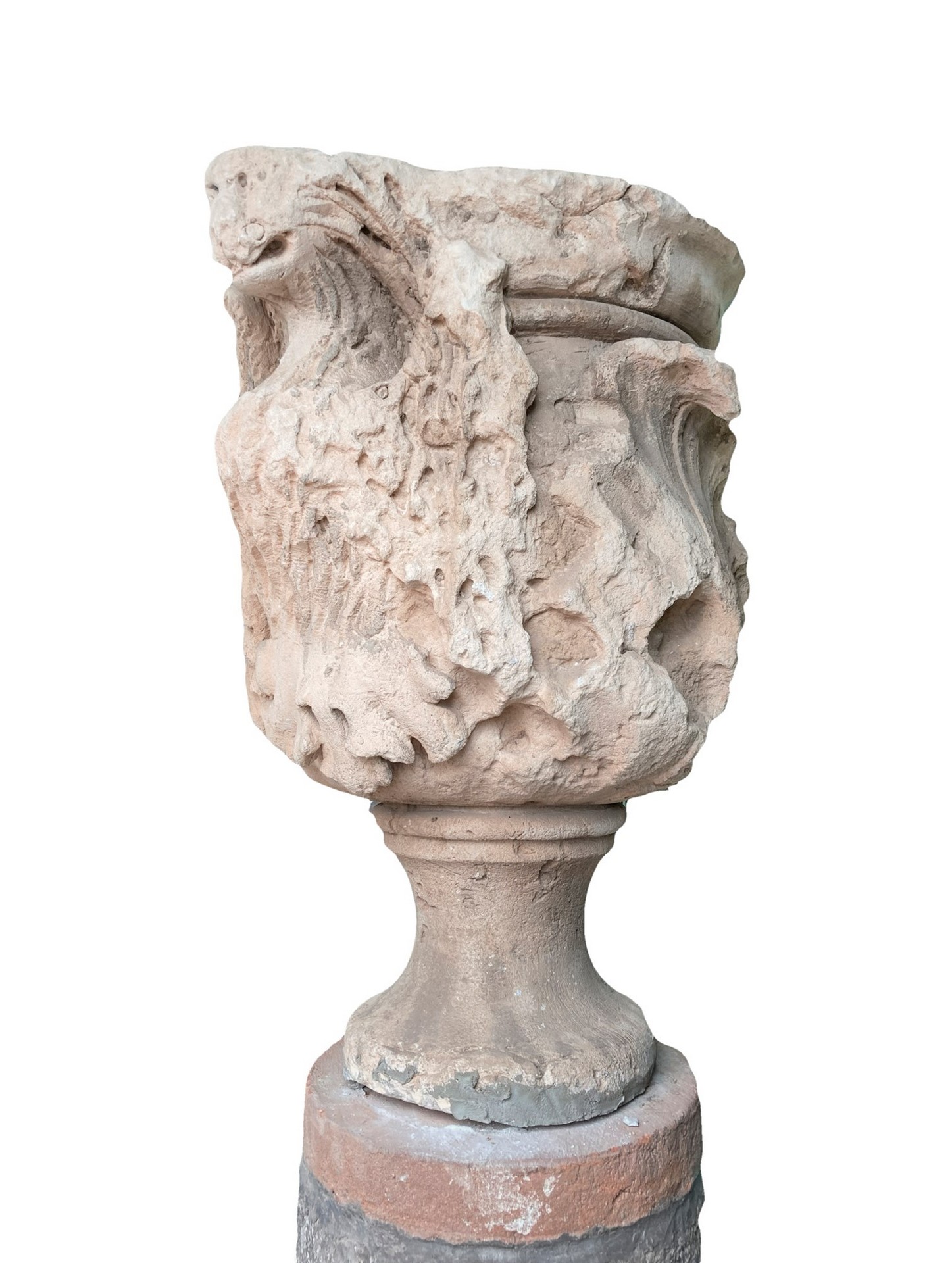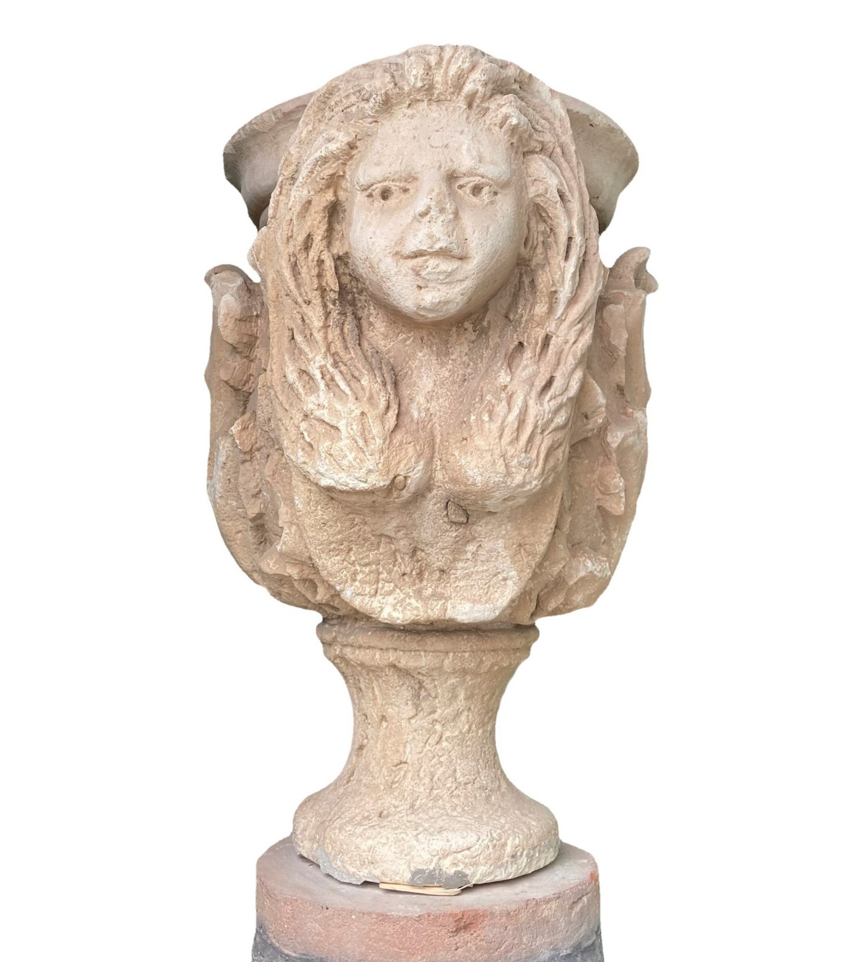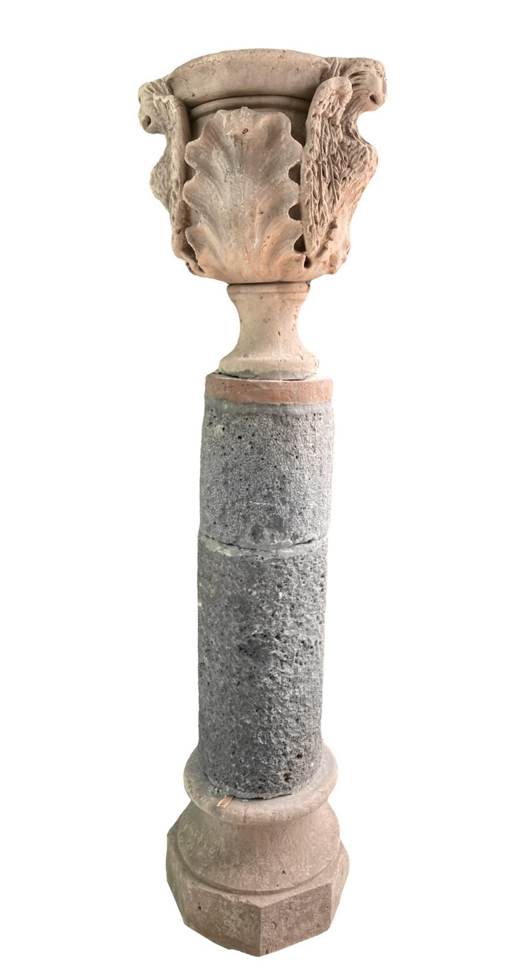 Coppia di colonne, sormontate da vasi del XVII secolo, raffiguranti donna e acquila, Early 18th century (post earthquake 1693) H cm 165 Pietra lavica e pietra arenaria del Val di Noto scolpite Ogni pilastro si erge su una base composta da plinto, toro e scozia, rispettando i canoni architettonici delle basi attiche. Il fusto di ogni pilastro è diviso in due rocchi; lungo la parte sommitale è poggiato un vaso adornato da sculture a basso rilievo: uno di essi raffigura un volto femminile, mentre il secondo mostra l'immagine di un'aquila.