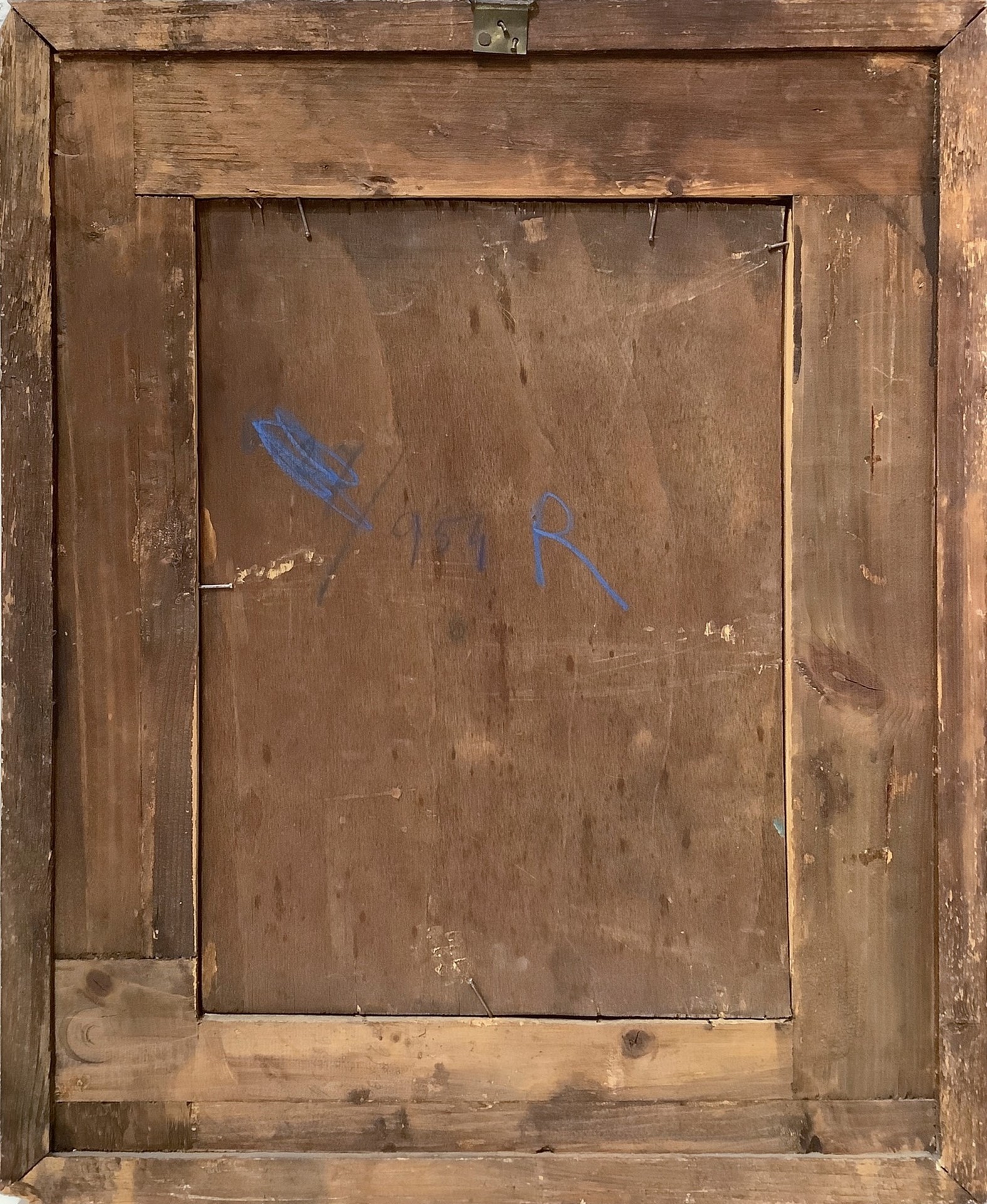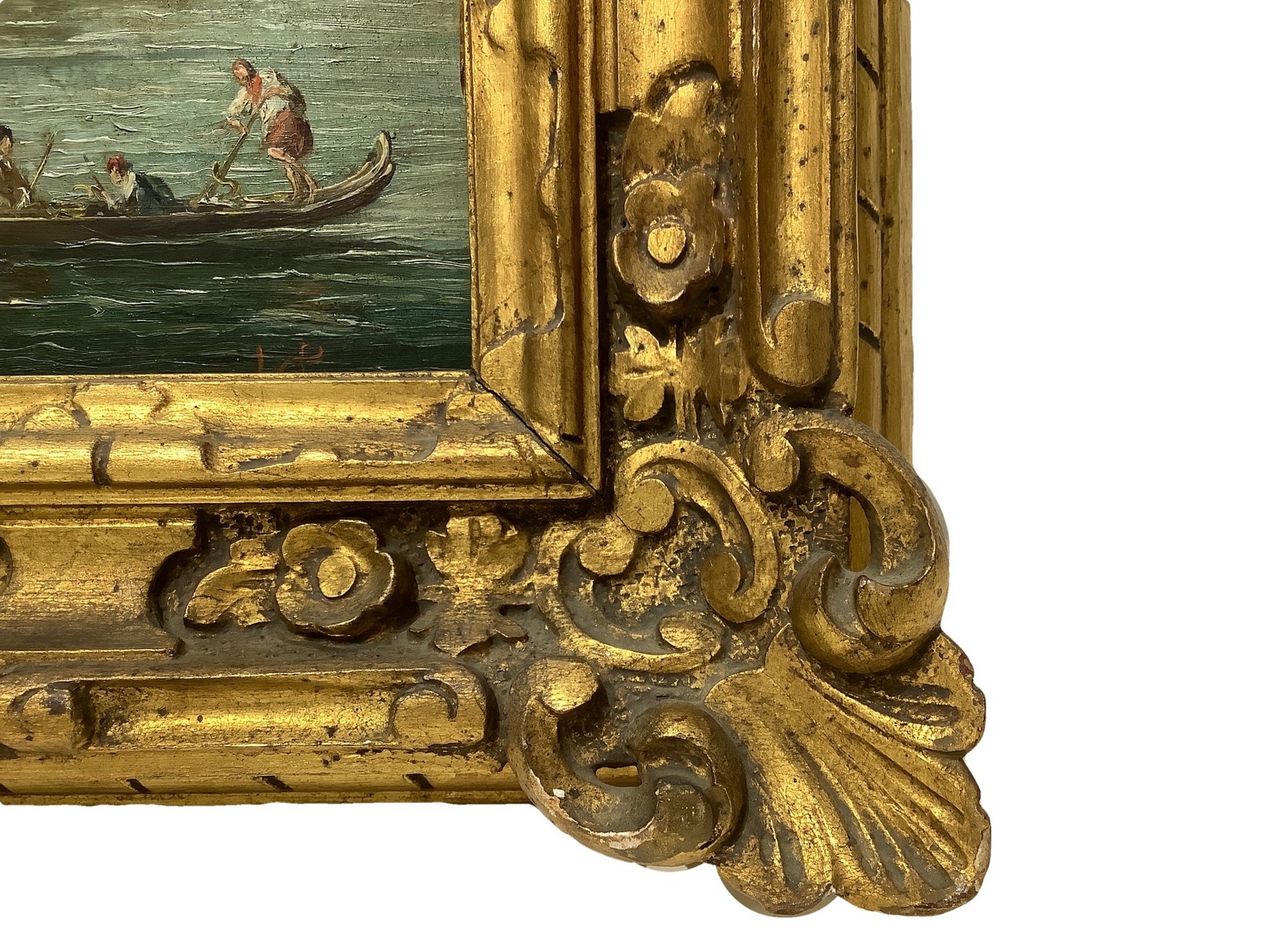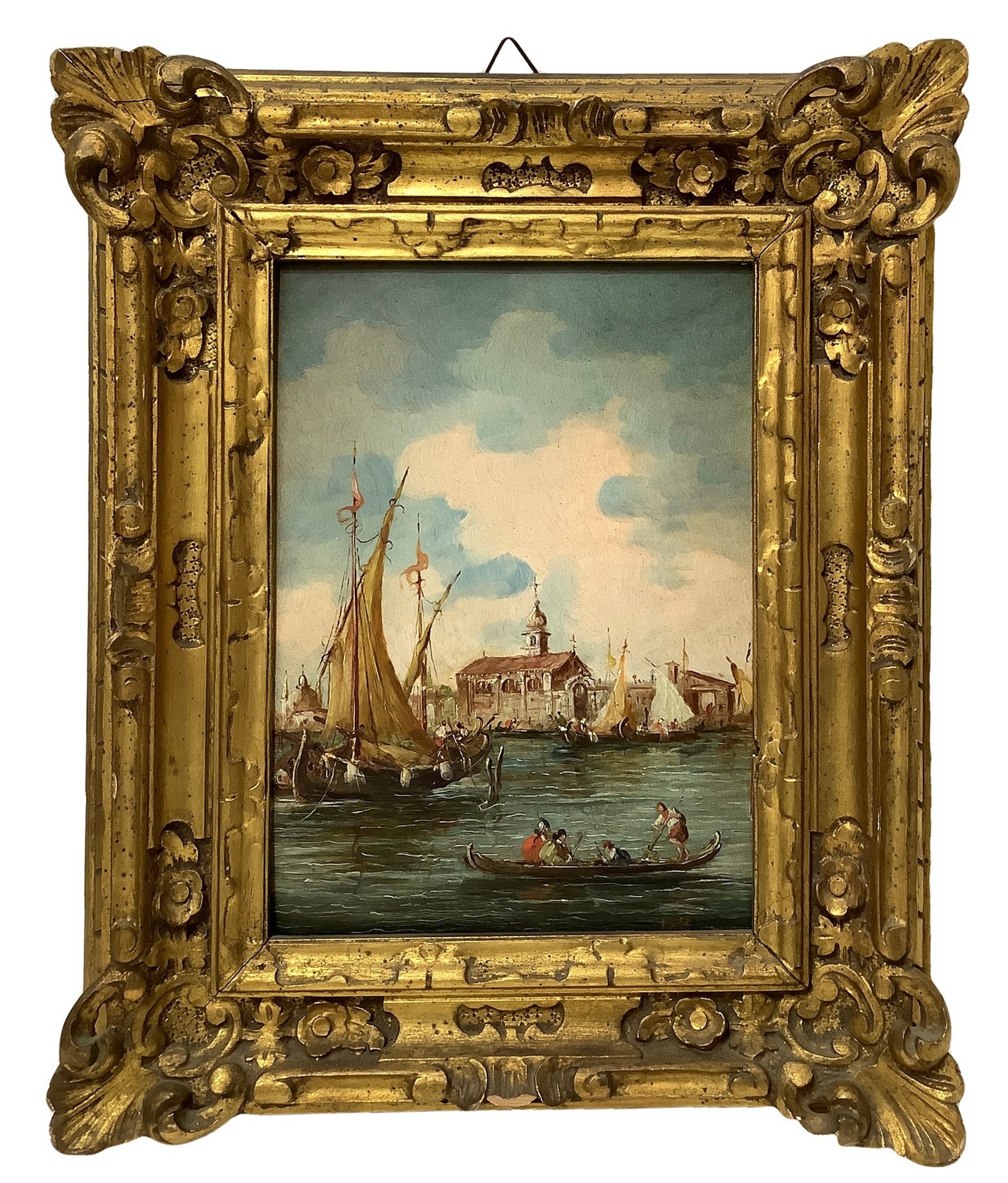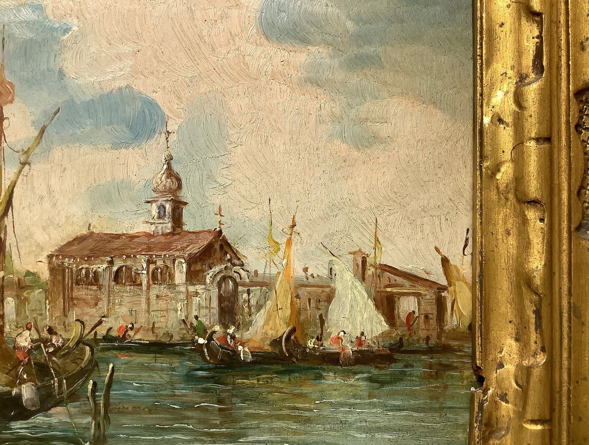 Ponga, Lucia, degli Ancillo (Venezia 1887-1966) - Laguna di Venezia animata con gondole e personaggi 35x25 cm, in cornice 50x40 cm Dipinto a olio su tavola