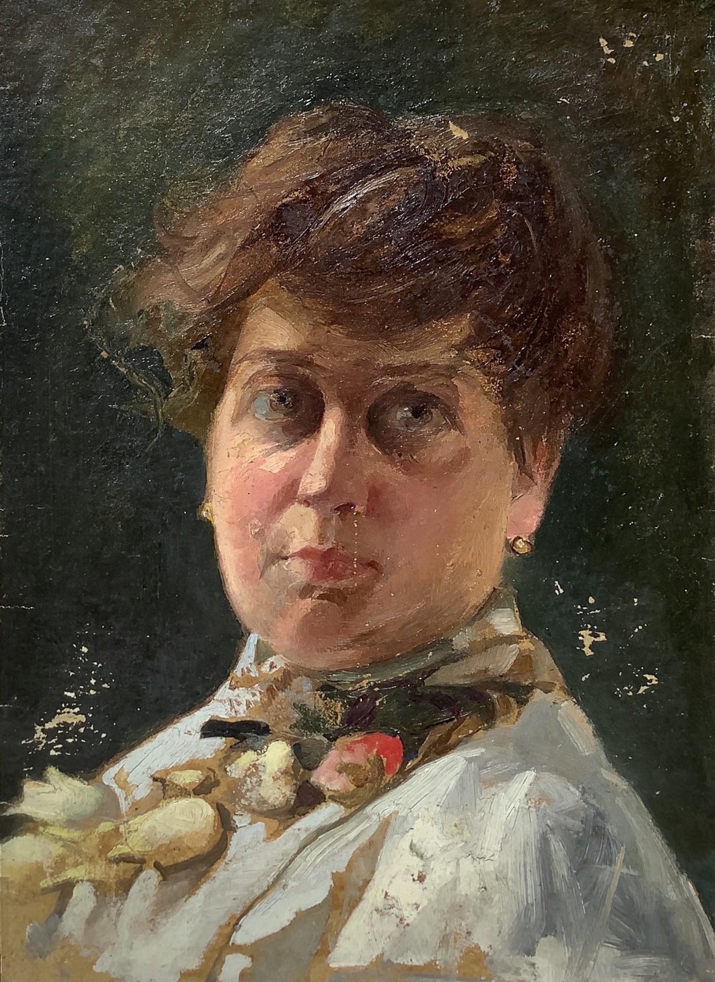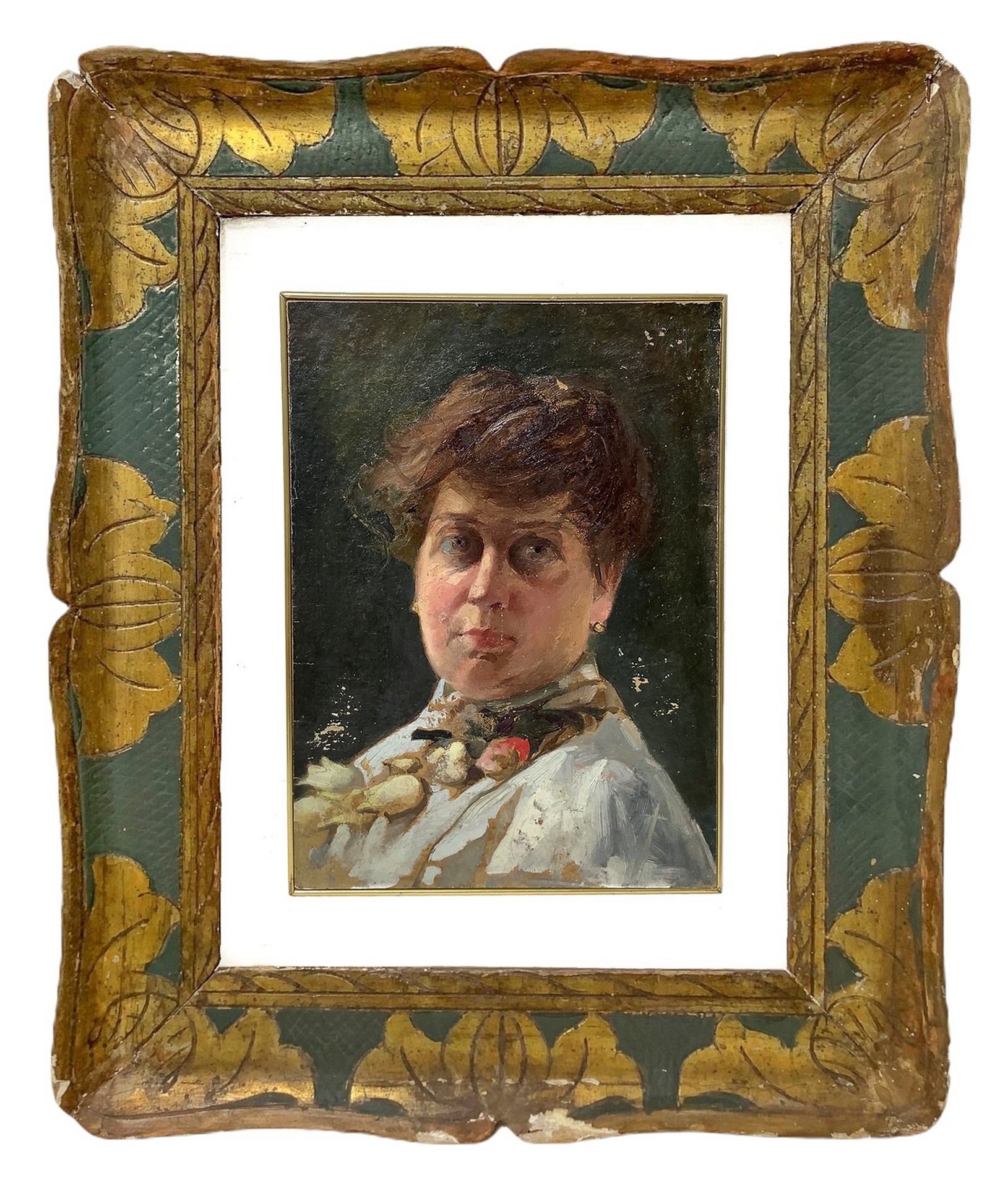 Mezzobusto di donna, Early 20th century 29x21 cm, in cornice 47x39 cm. Olio su cartoncino Bella cornice e vassoio laccata e dorata.