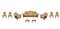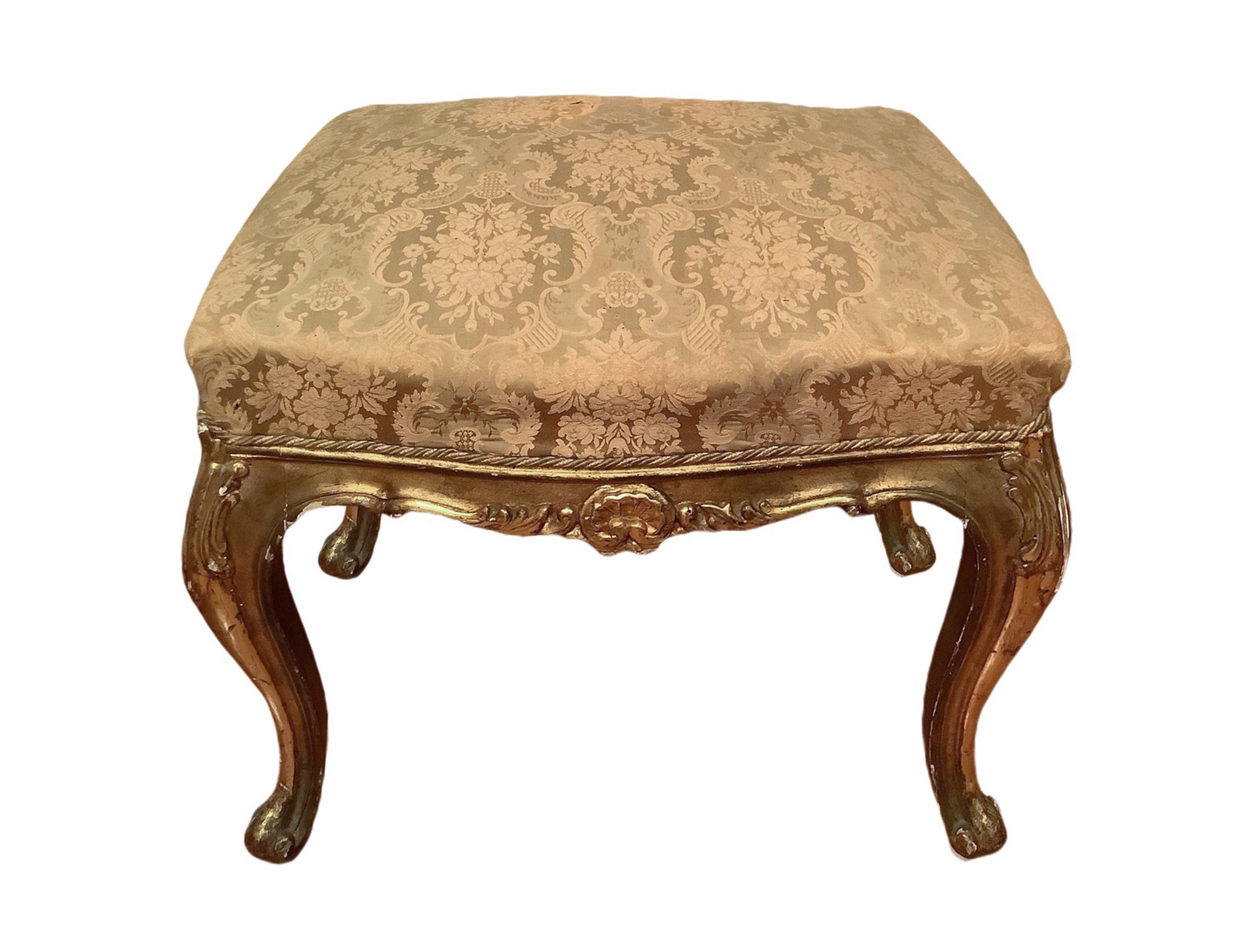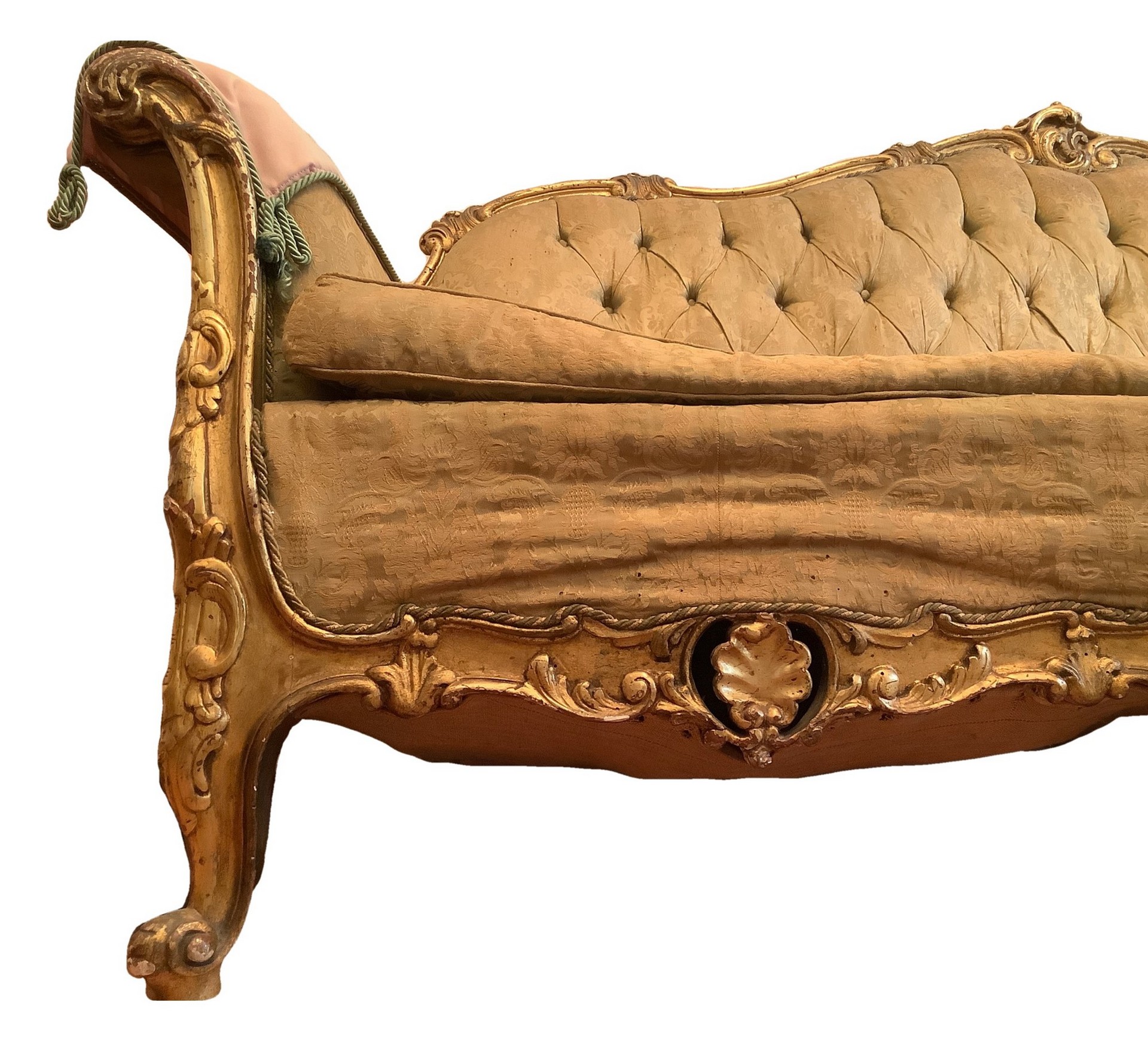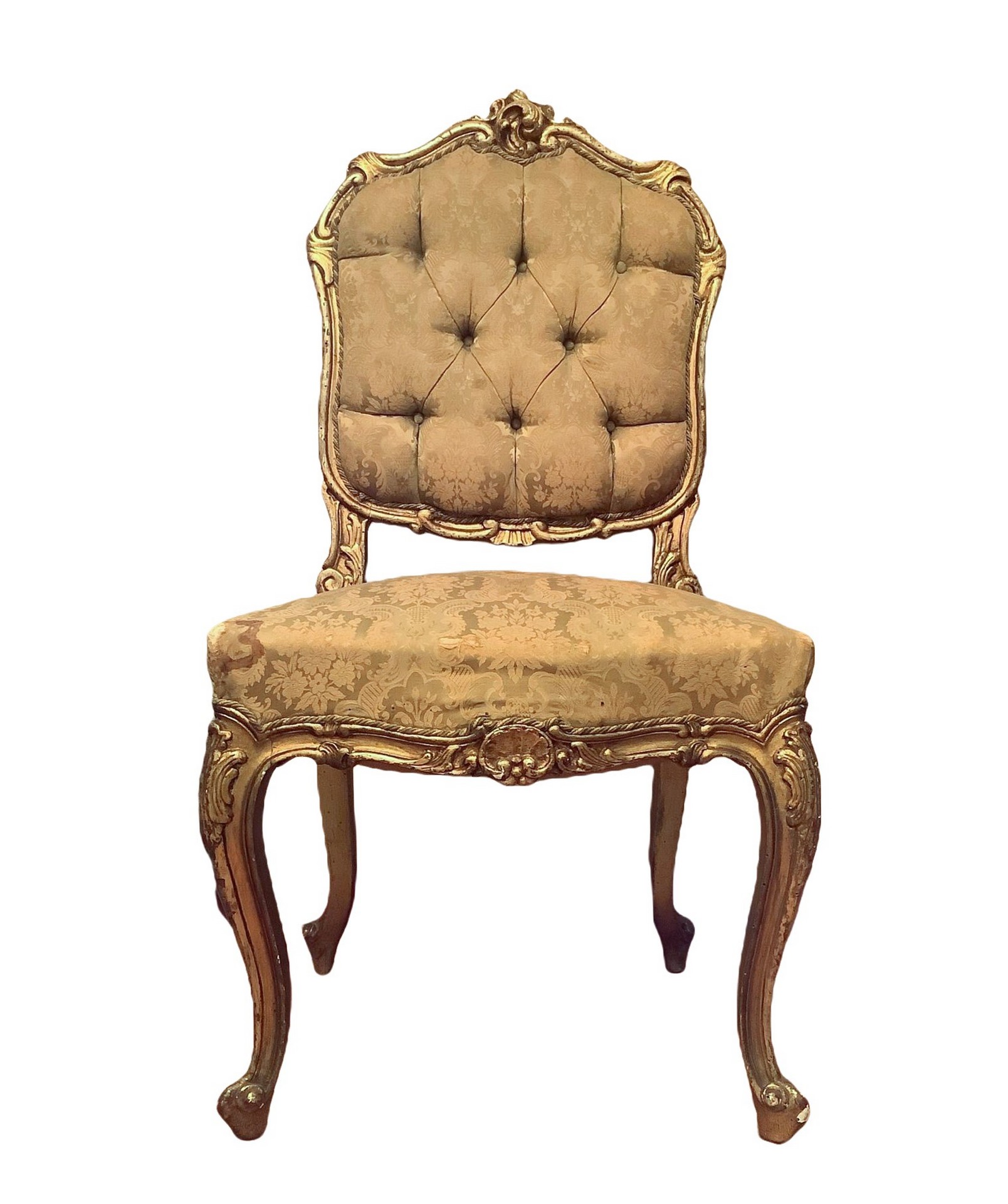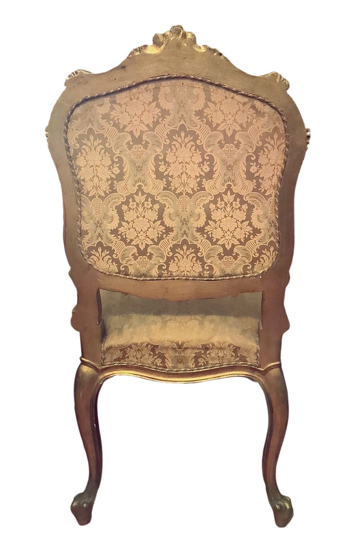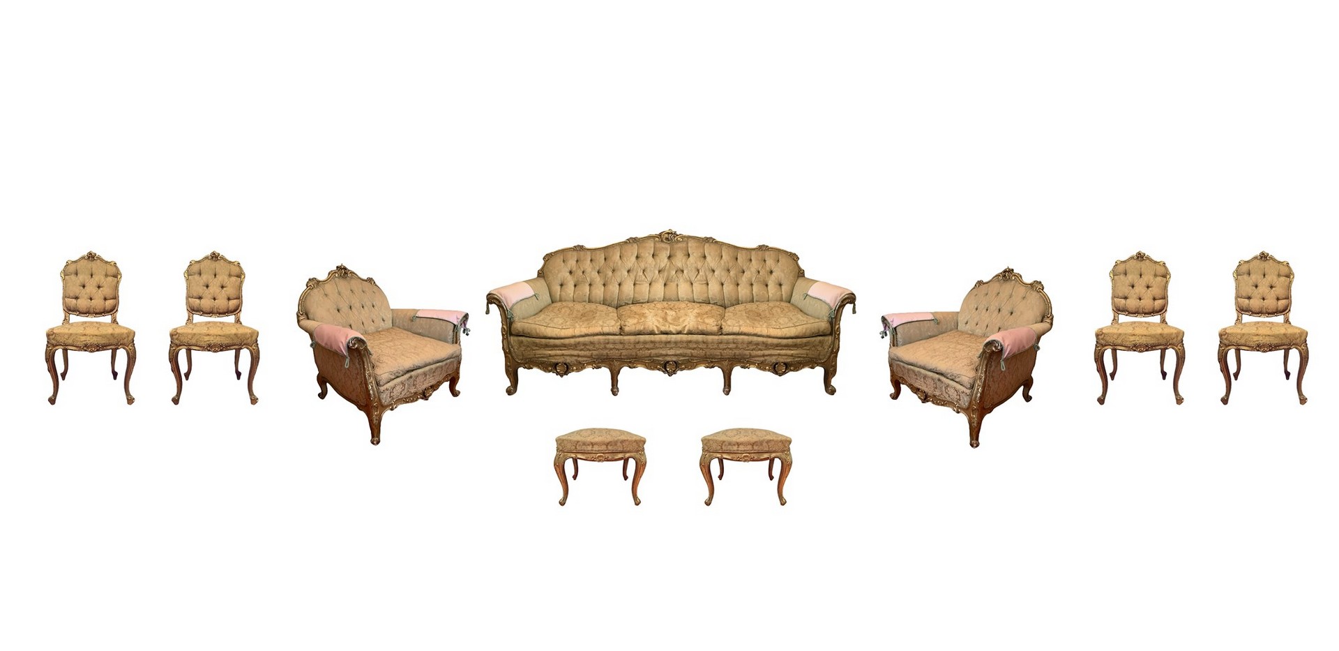 Salotto in legno dorato divano 100 cm x 2 m x 50 cm, poltrone 90x60 cm, sedie h 100x 50 cm, pouf h 40, l 50x40 cm, angoliera h 98 cm, b superiore 33 cm In legno dorato, composto da un divano, due poltrone, quattro sedie, due pouf, angoliera