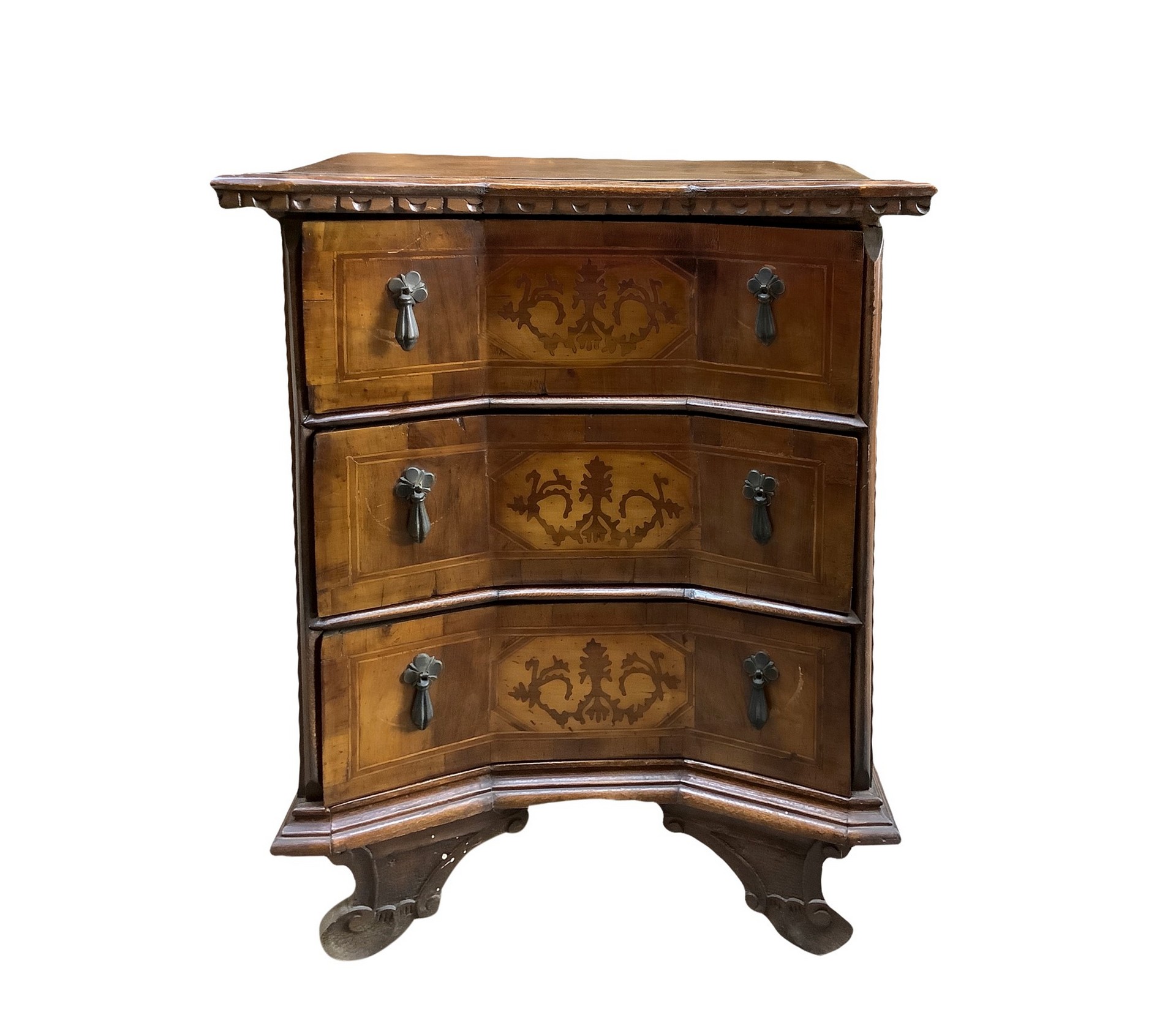 Comodino a tre cassetti in legno di noce Intarsi sul front