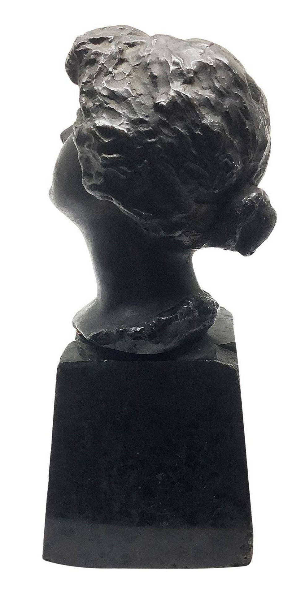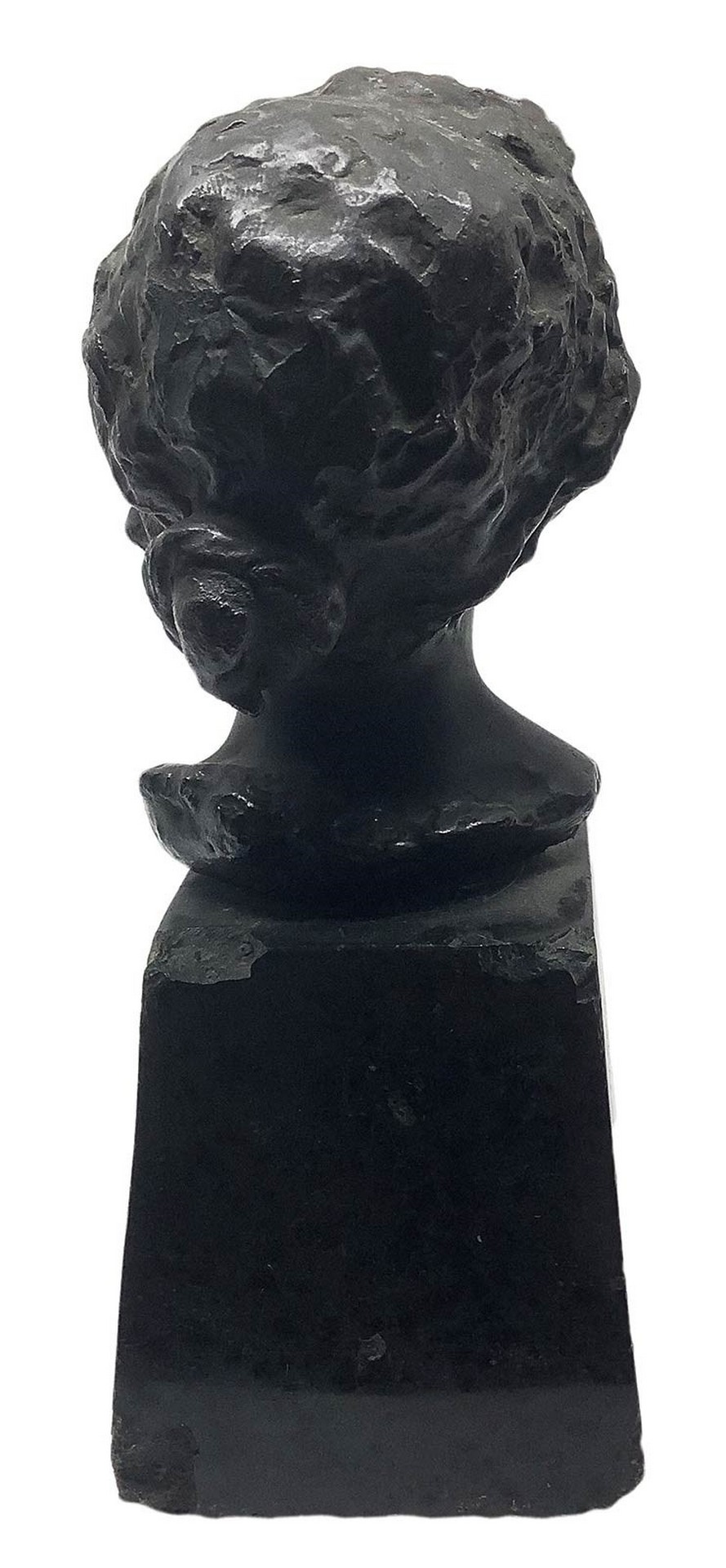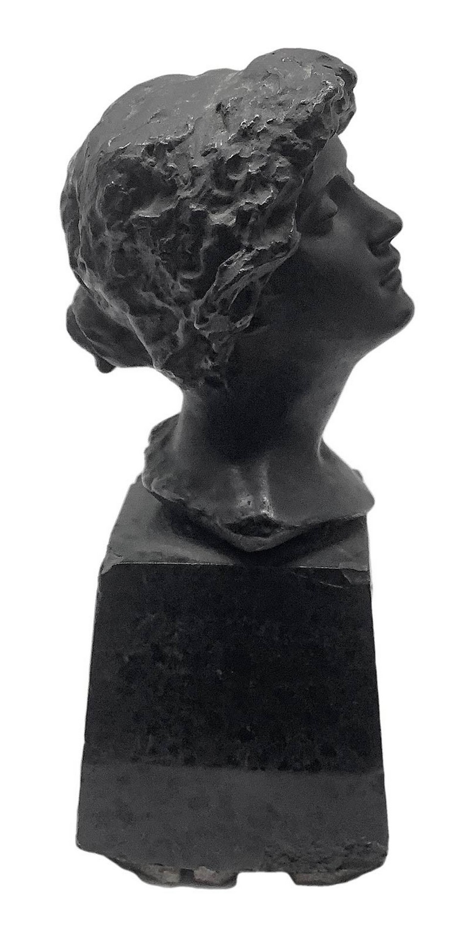 Bronzo a cera persa di testa di giovane donna H cm 9,5 con base H cm 17 Base troncopiramidale in marmo grigio-nero. Piccola sbeccatura alla base
