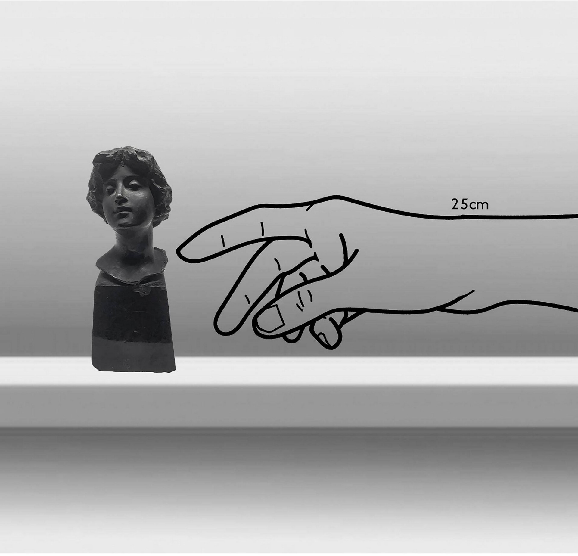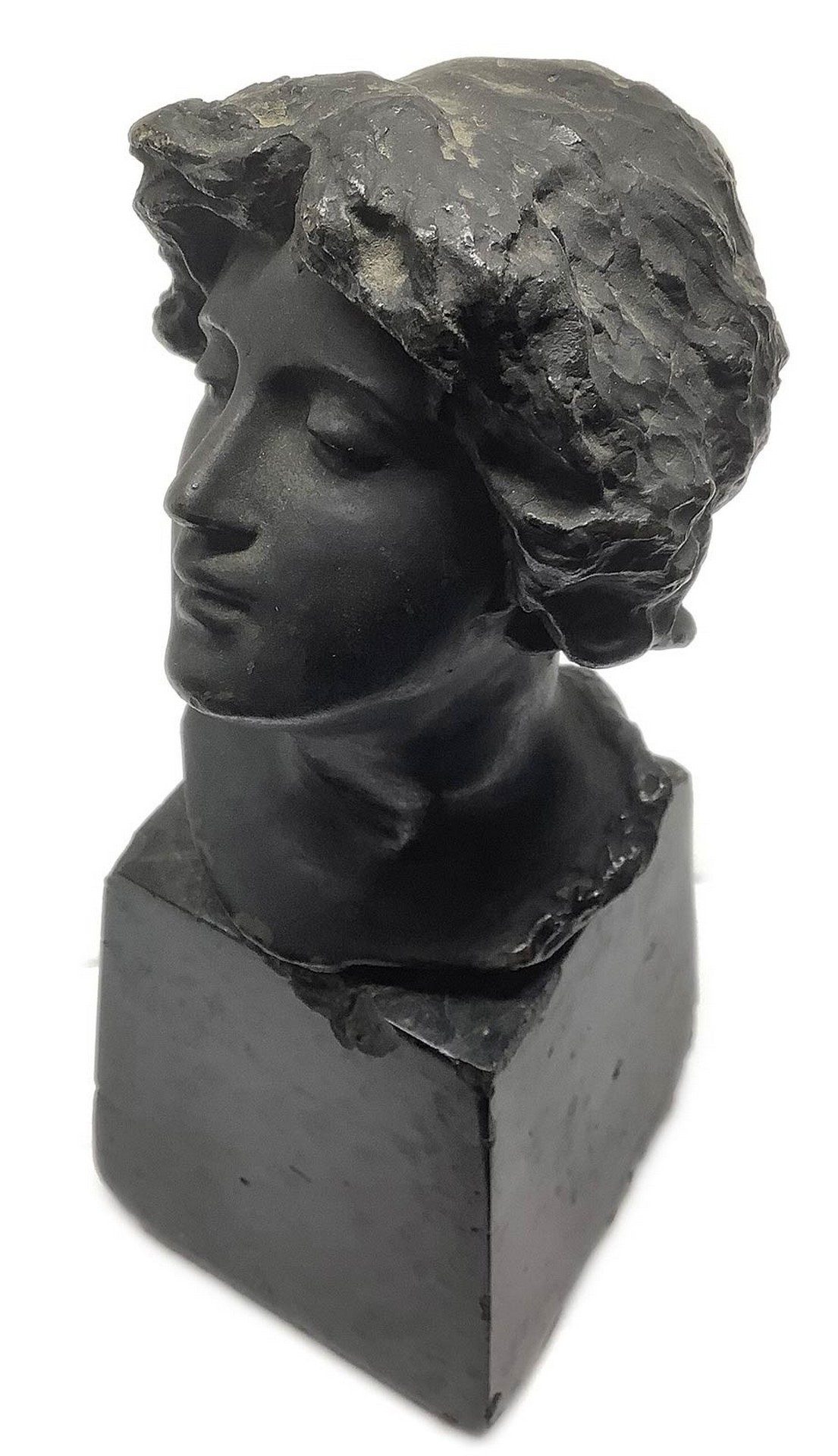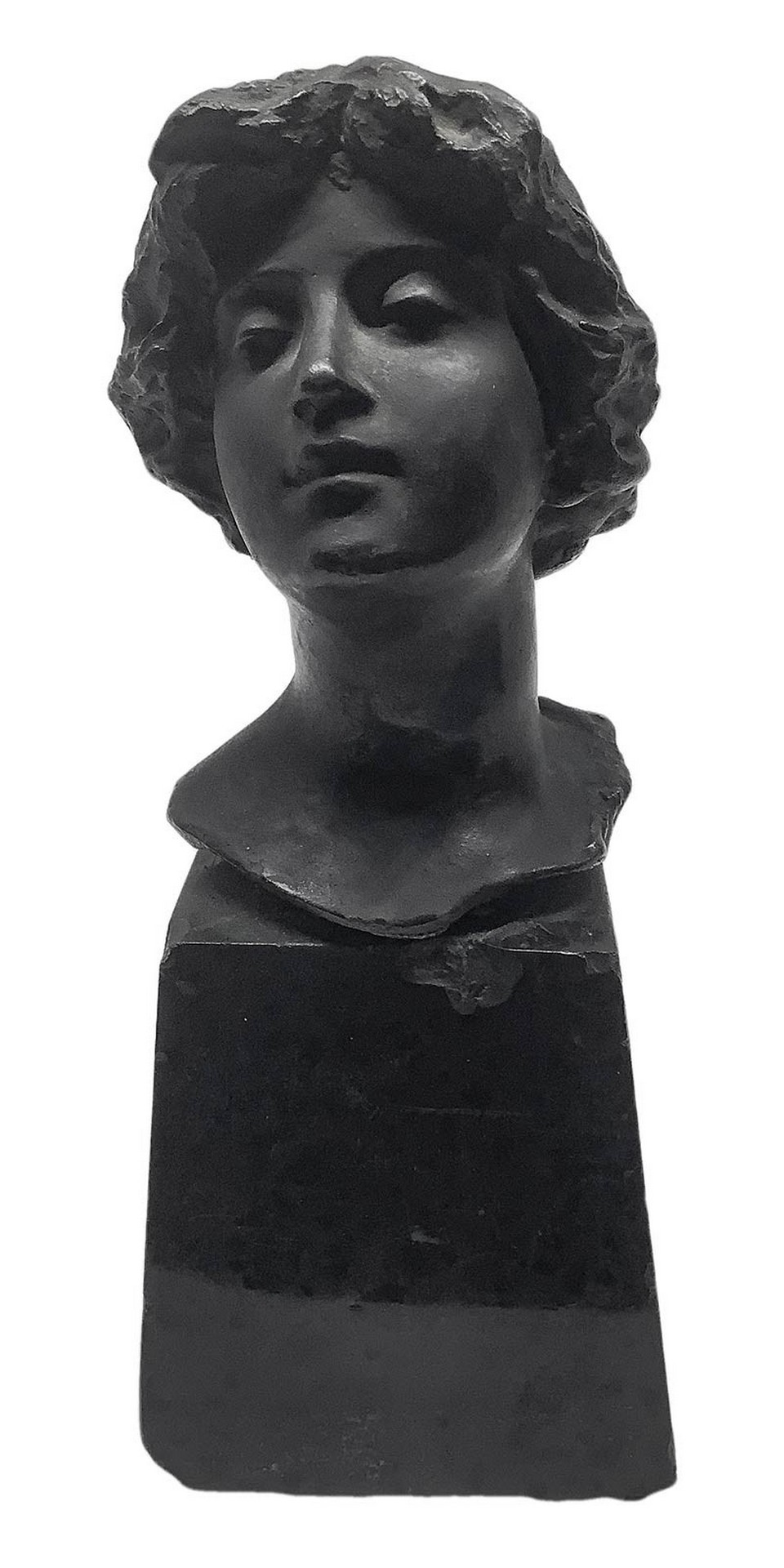 Bronzo a cera persa di testa di giovane donna H cm 9,5 con base H cm 17 Base troncopiramidale in marmo grigio-nero. Piccola sbeccatura alla base
