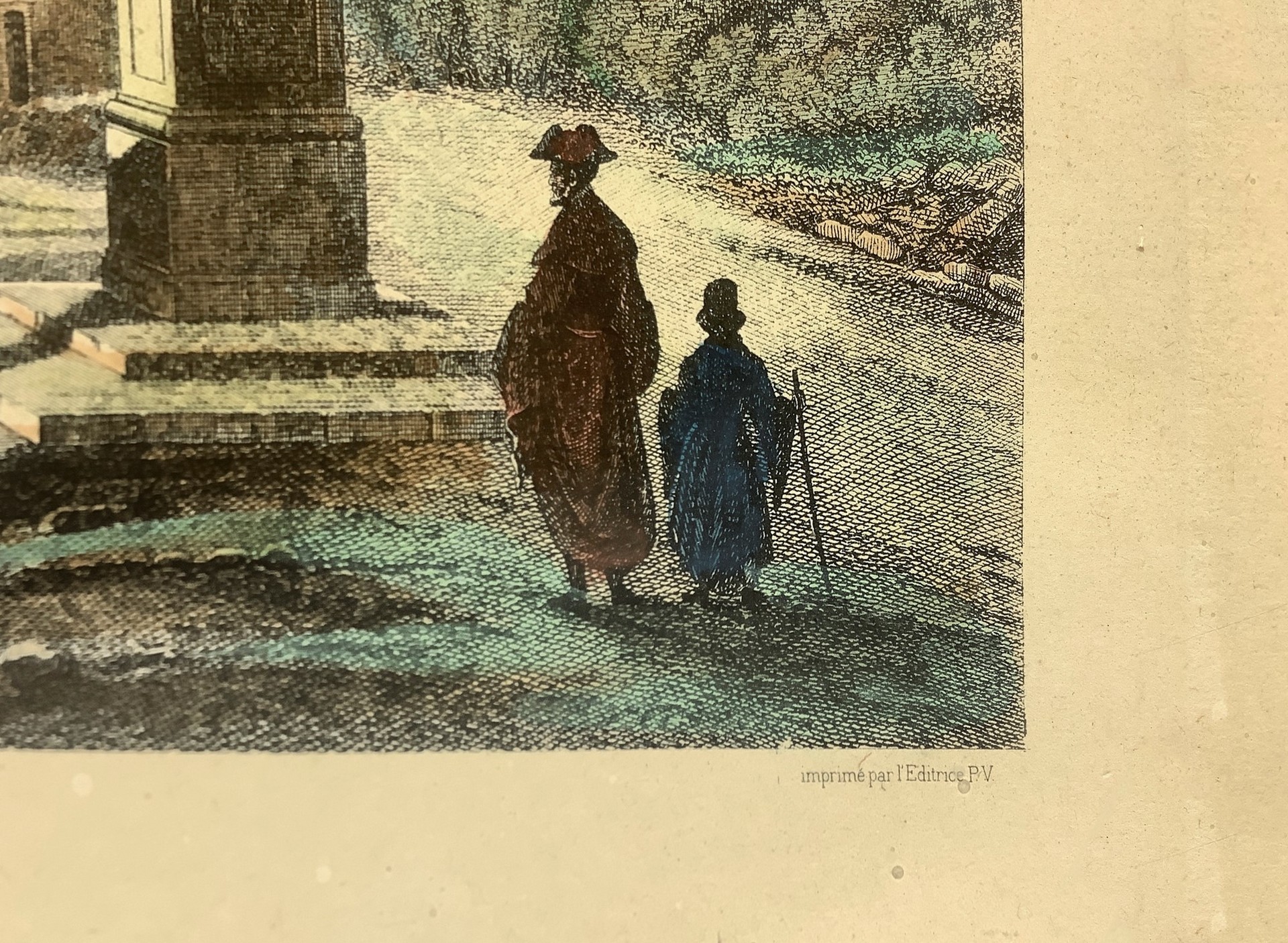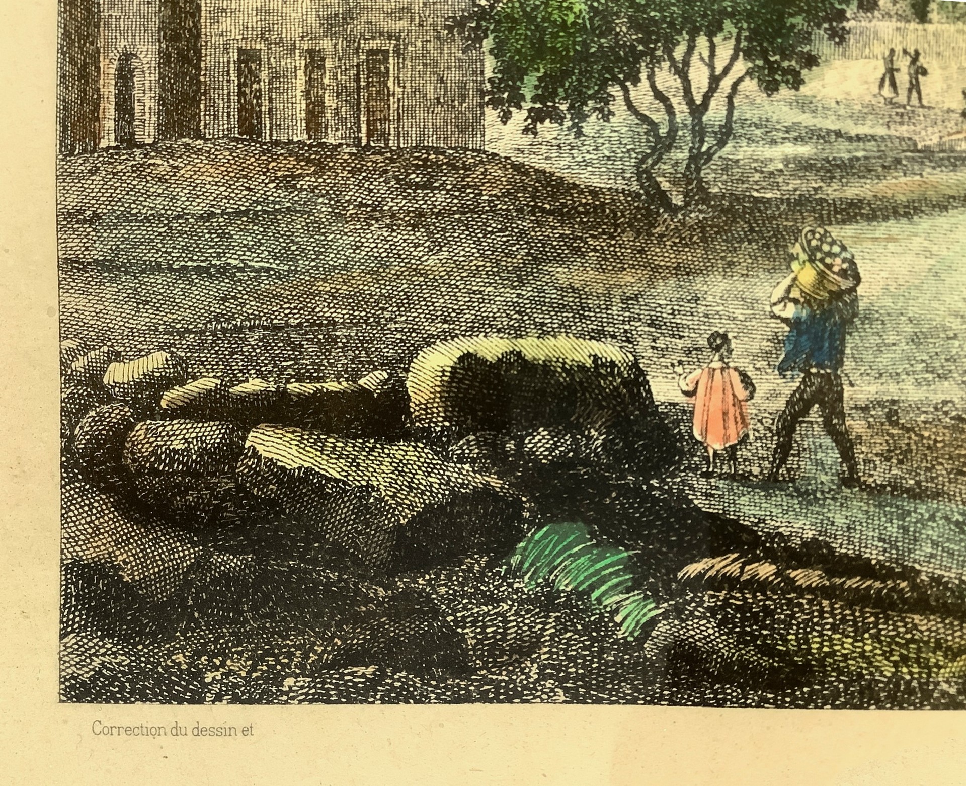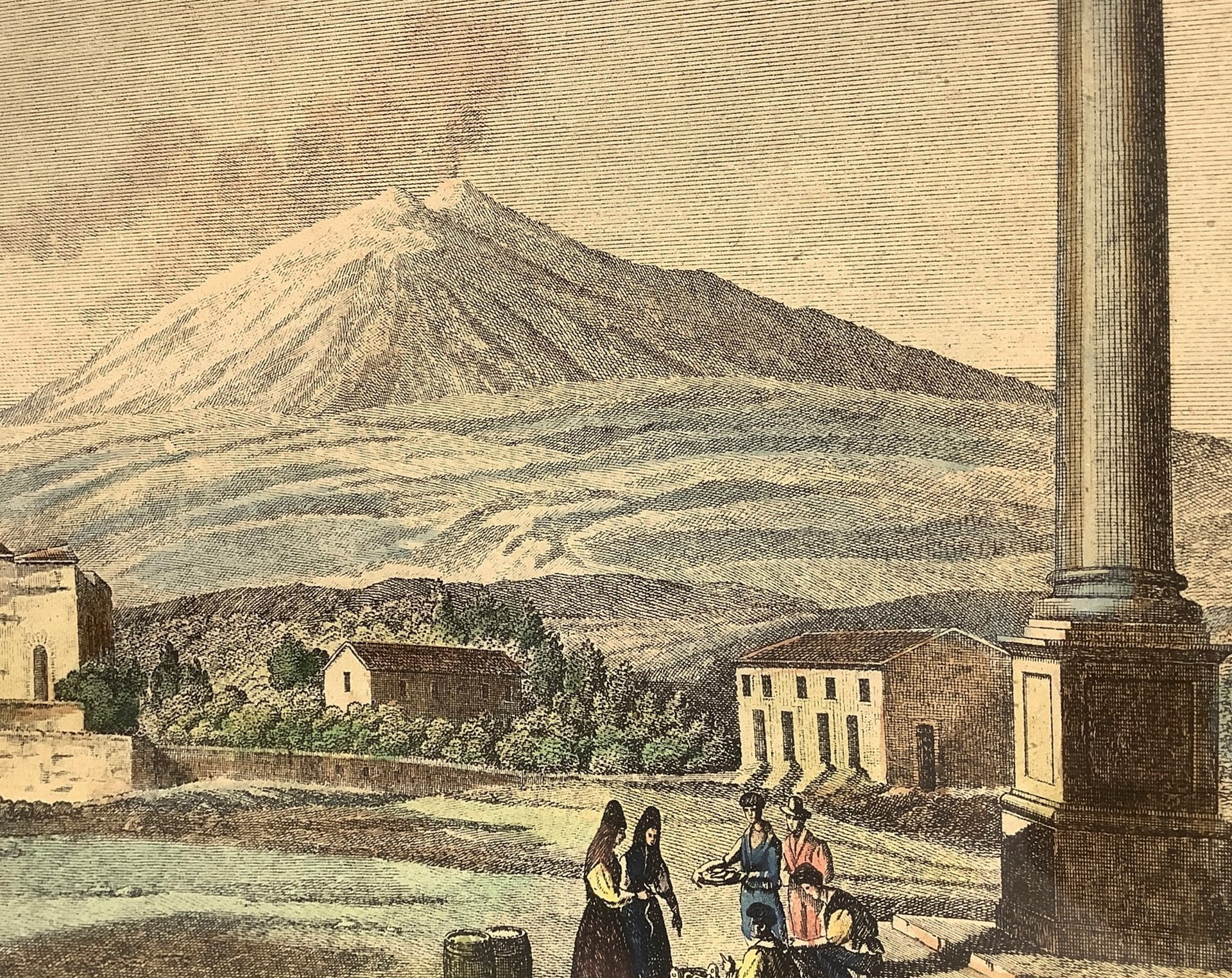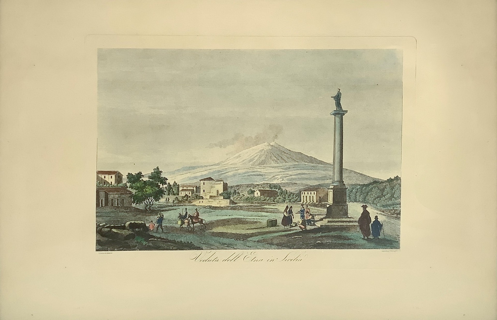 Veduta dell'Etna in Sicilia (Piazza dei Martiri, Catania) 42x58 cm Incisione acquerellata su carta seppiata In cornice di legno dorato