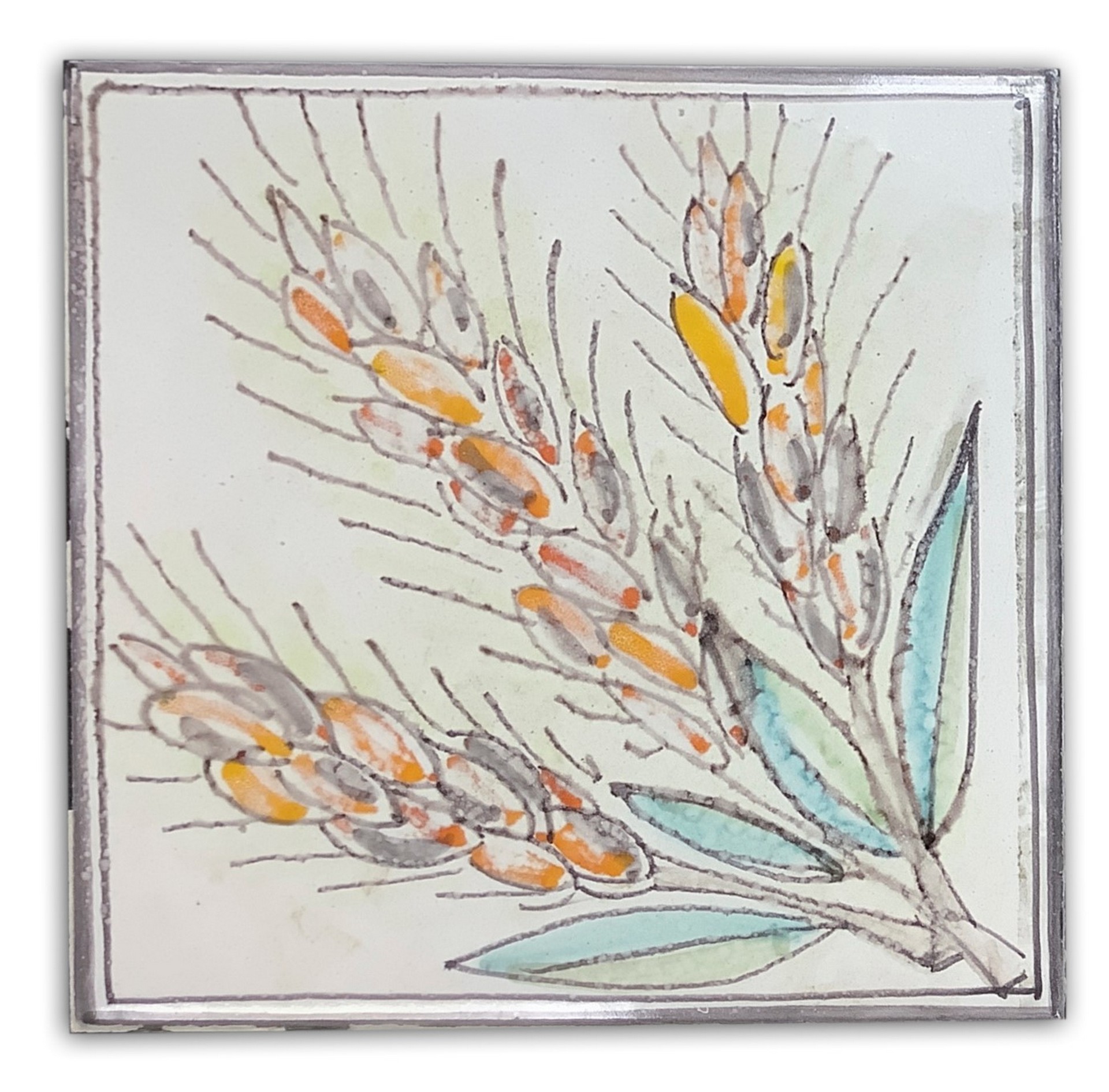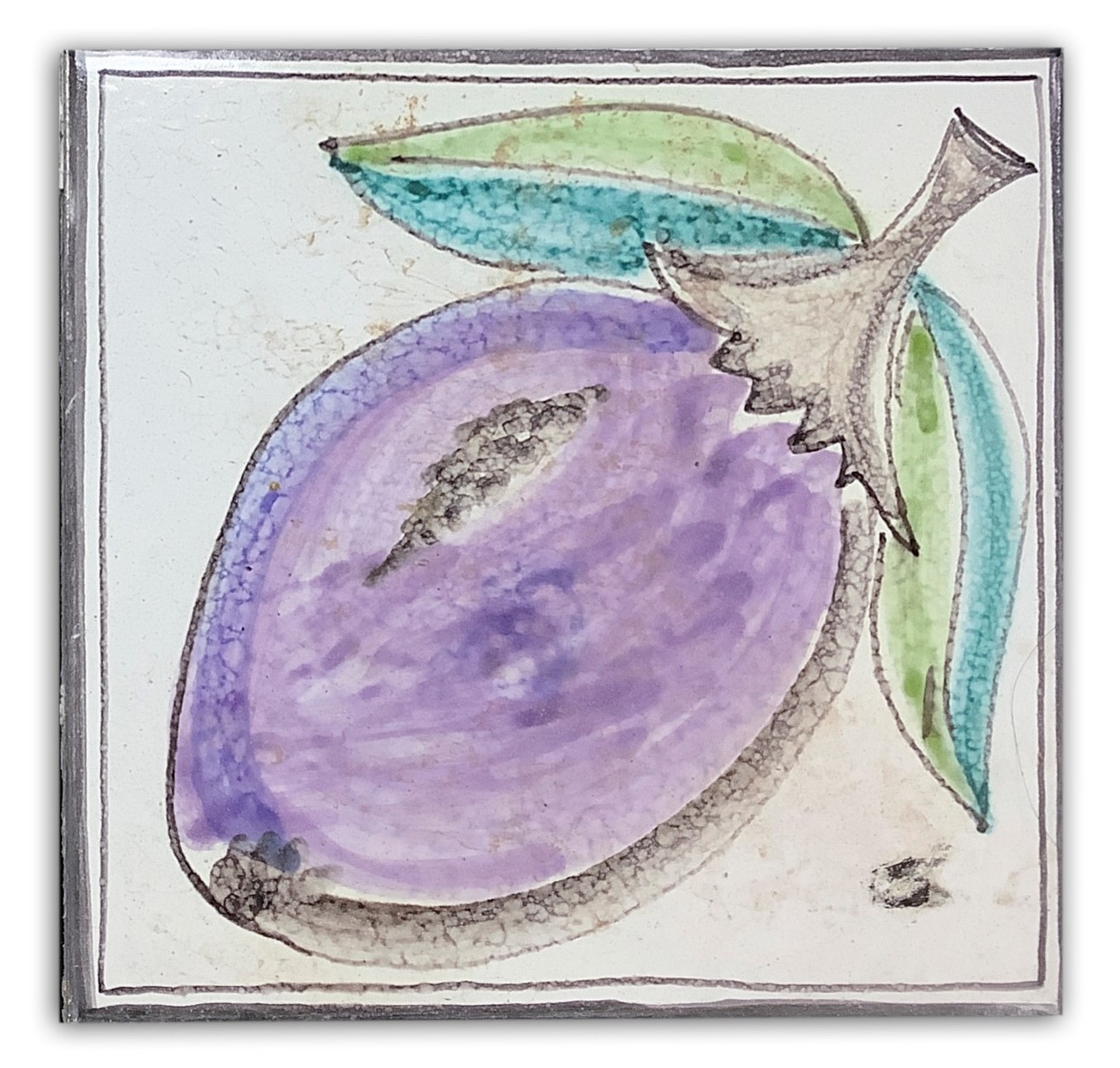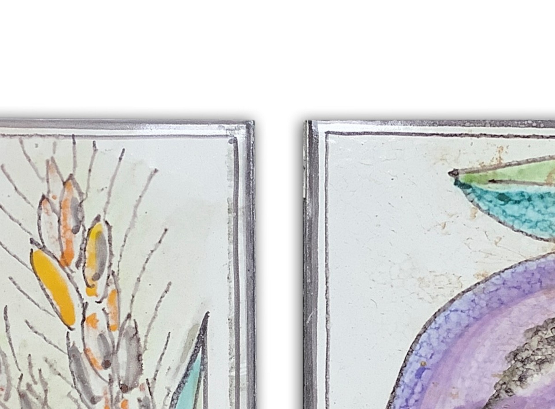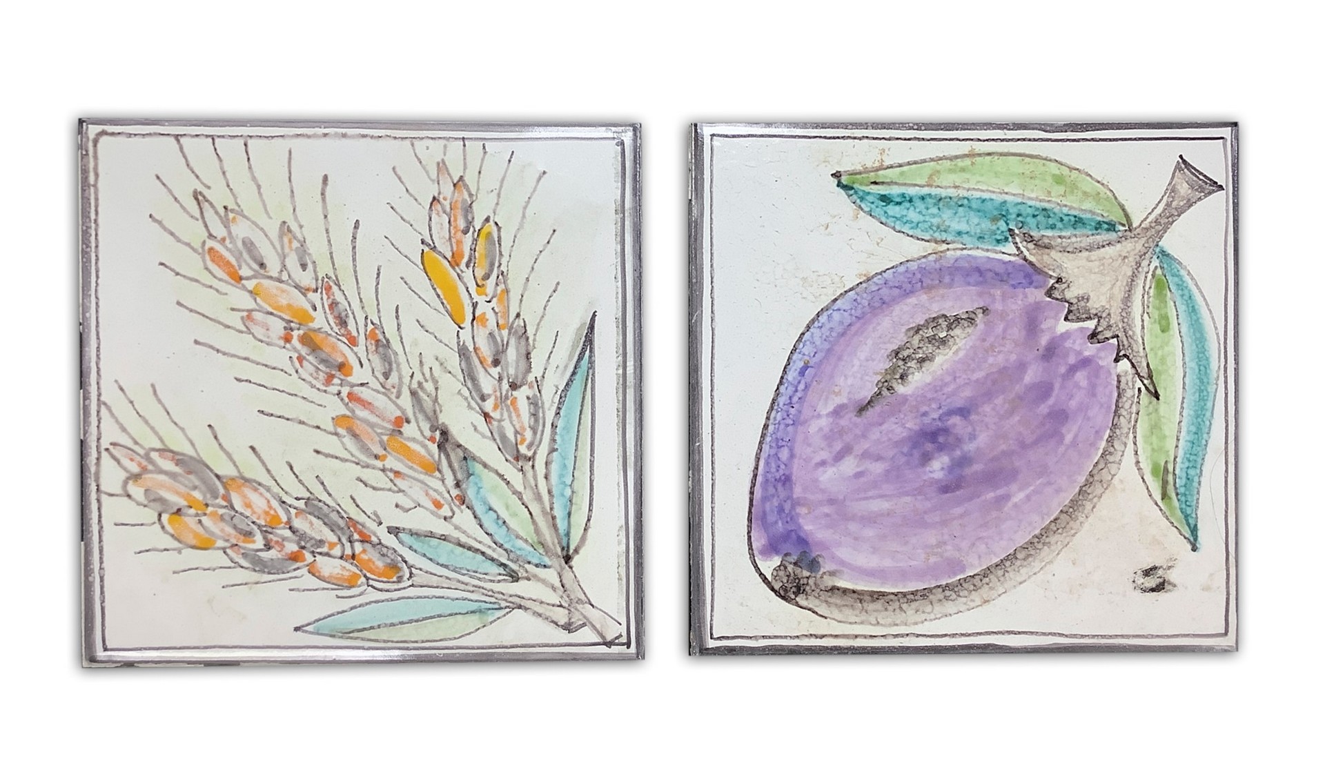 De Simone - Coppia di piastrelle in maiolica raffiguranti una spiga e una melanzana 20x20 cm
