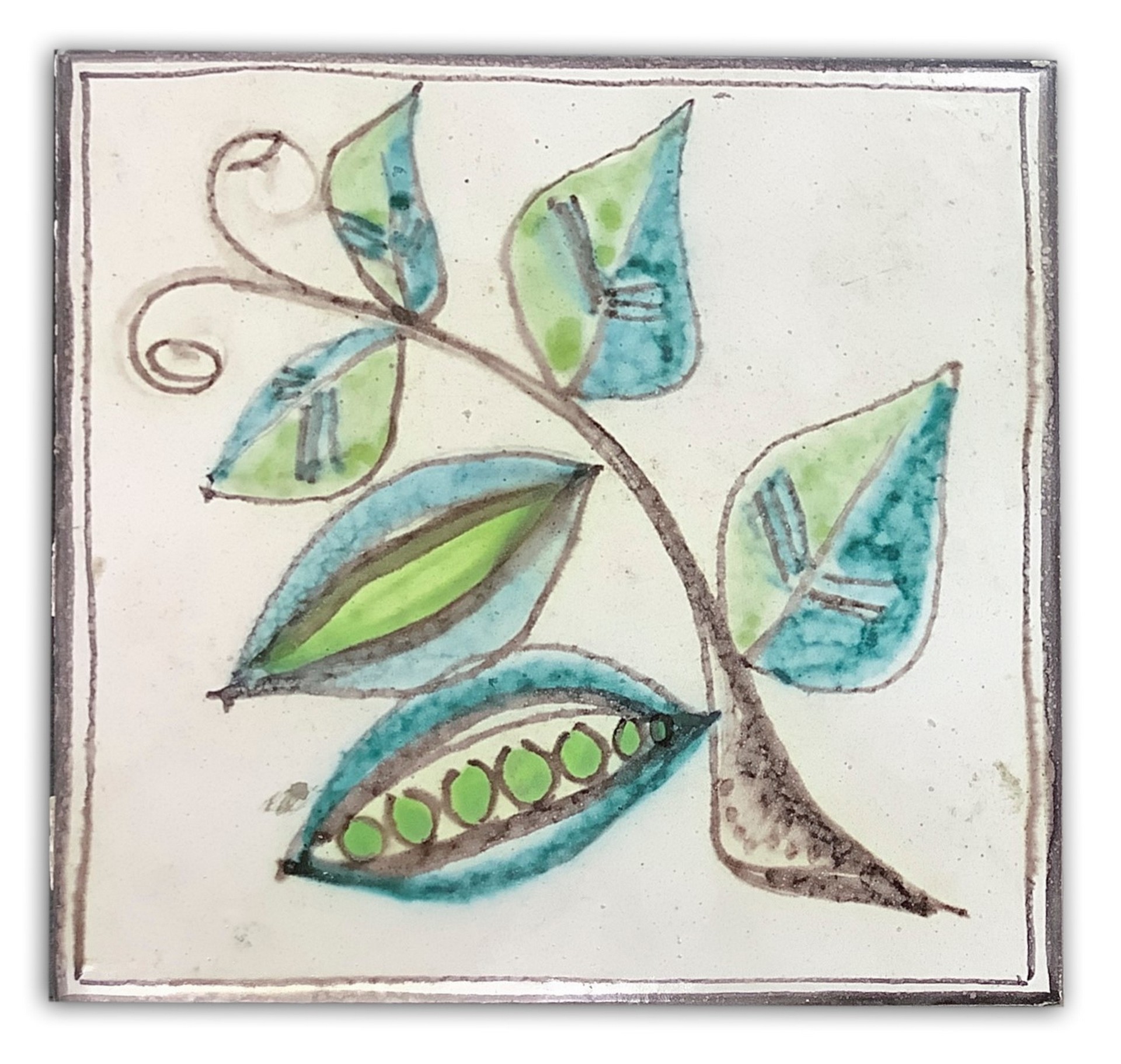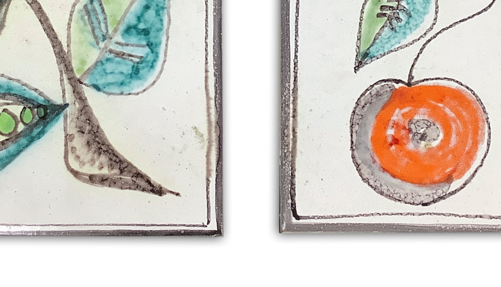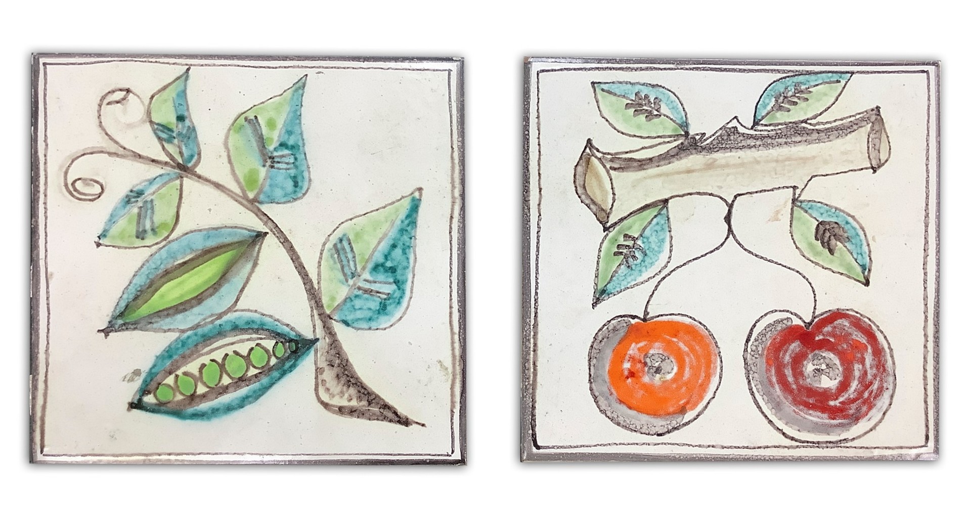 De Simone - Coppia di piastrelle in maiolica raffiguranti ciliegie e una pianta di piselli 20x20 cm