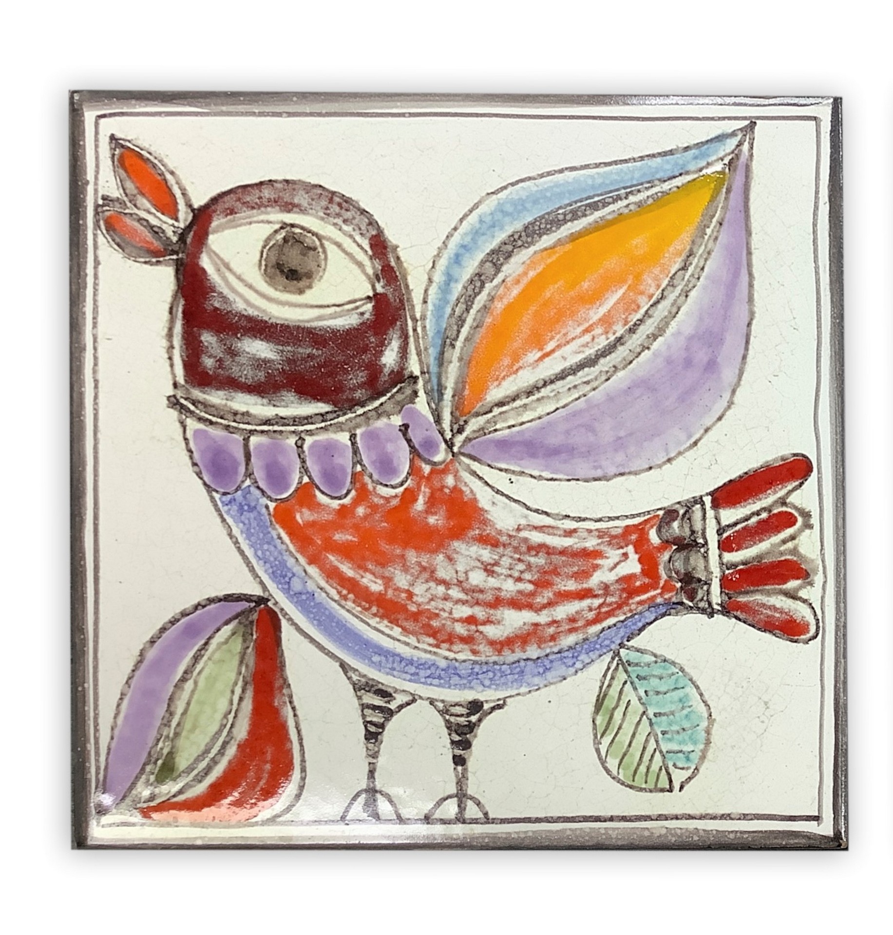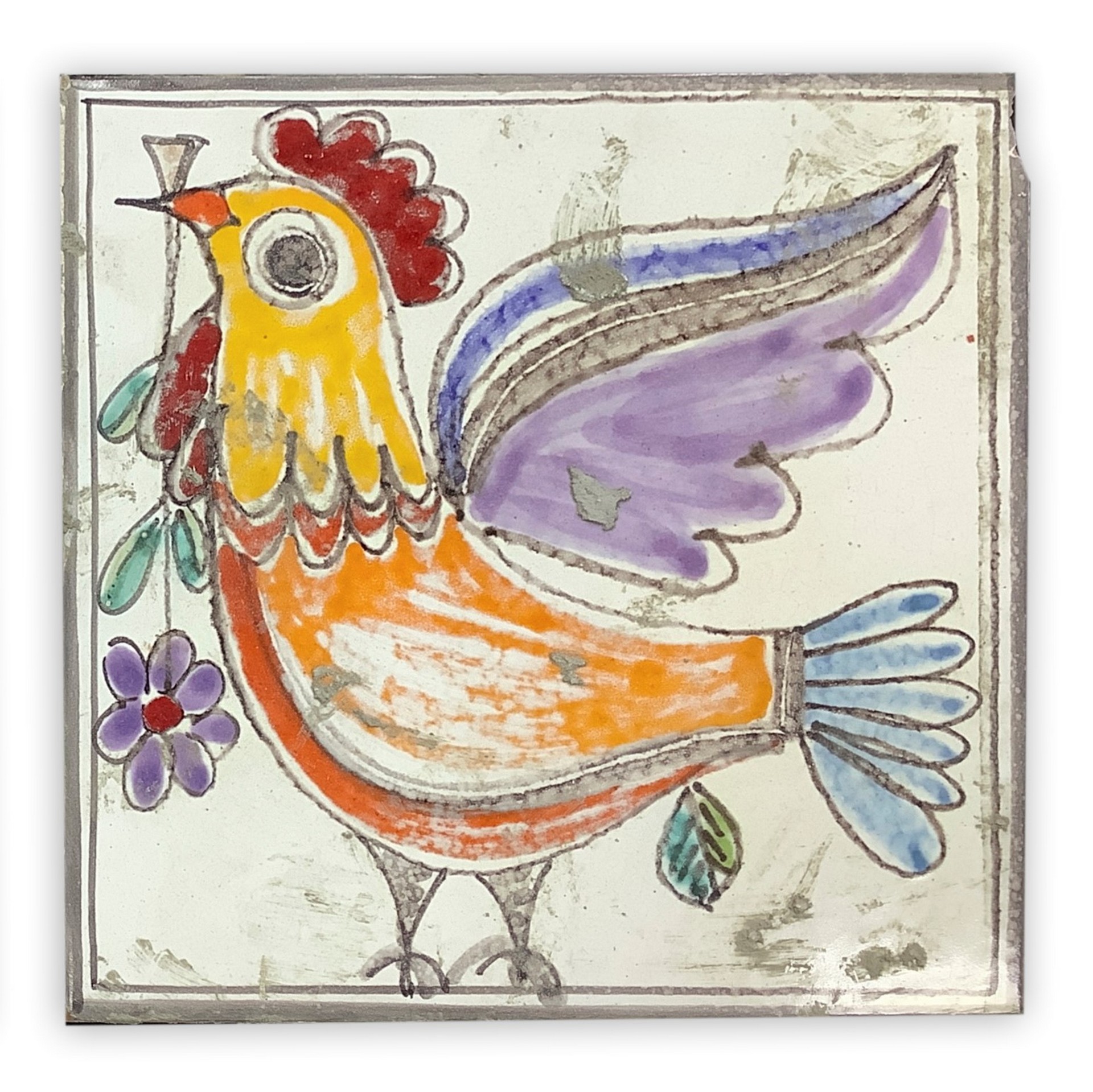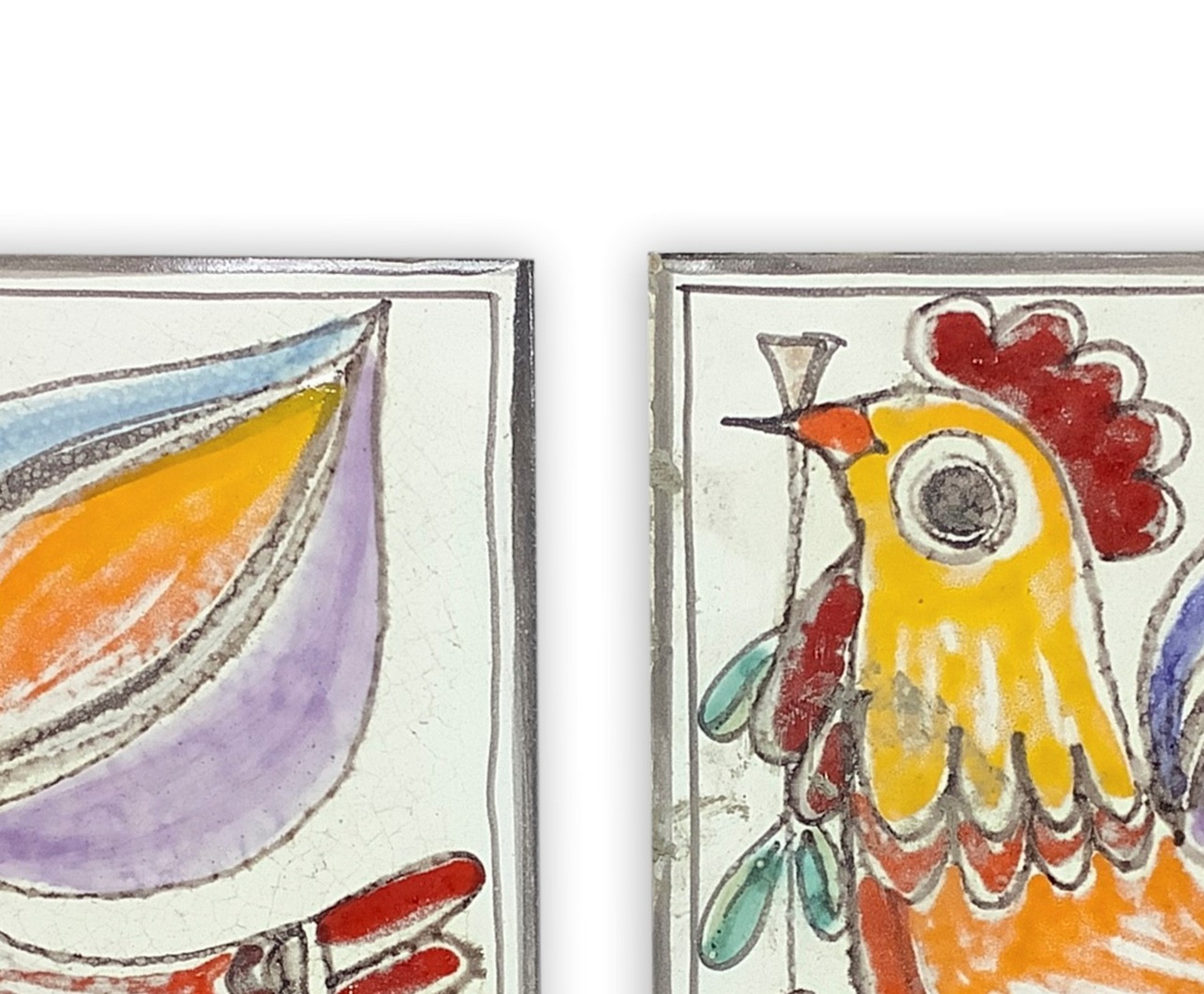 De Simone - Coppia di piastrelle in maiolica raffiguranti un uccello e un gallo 20x20 cm