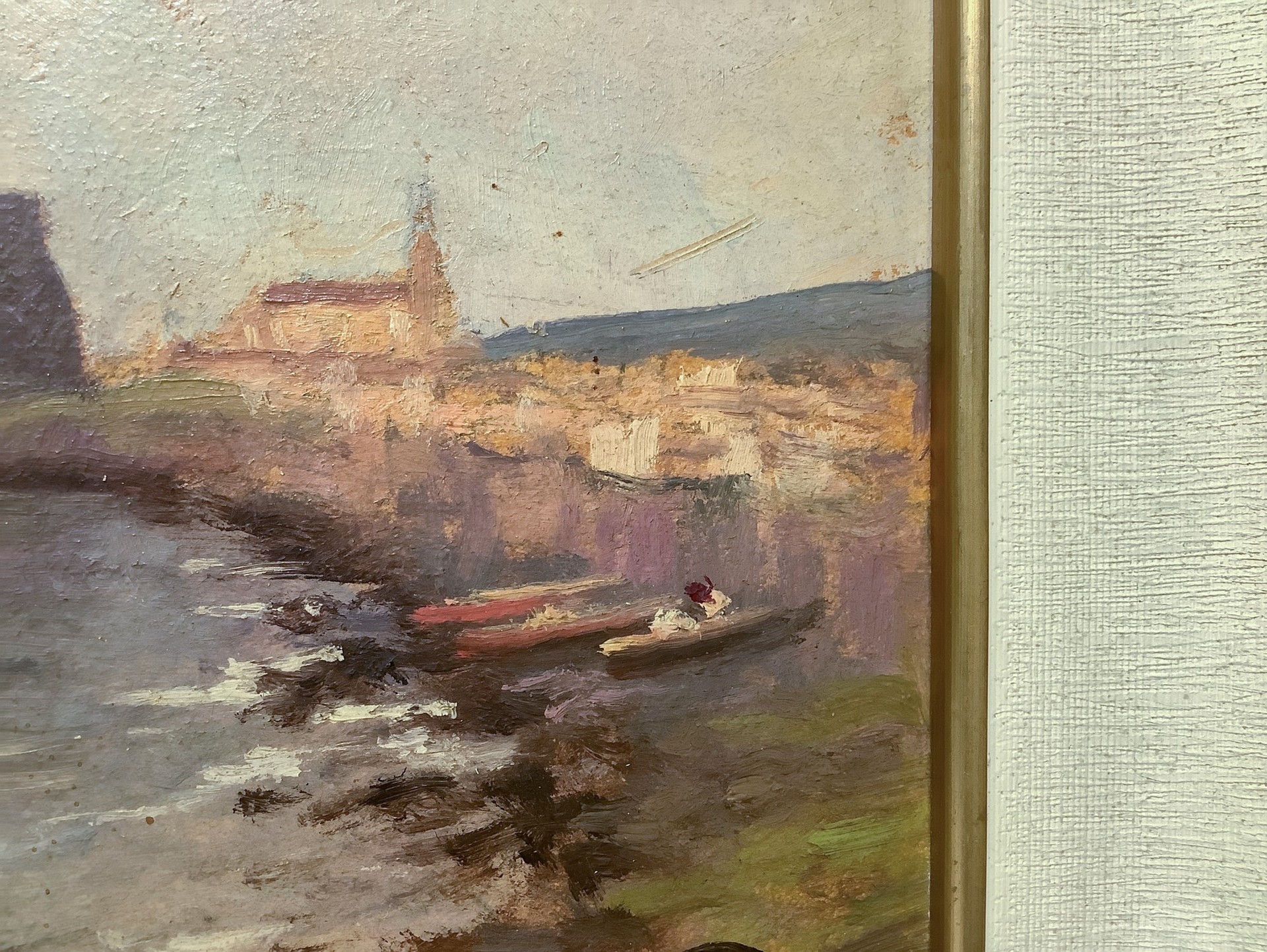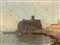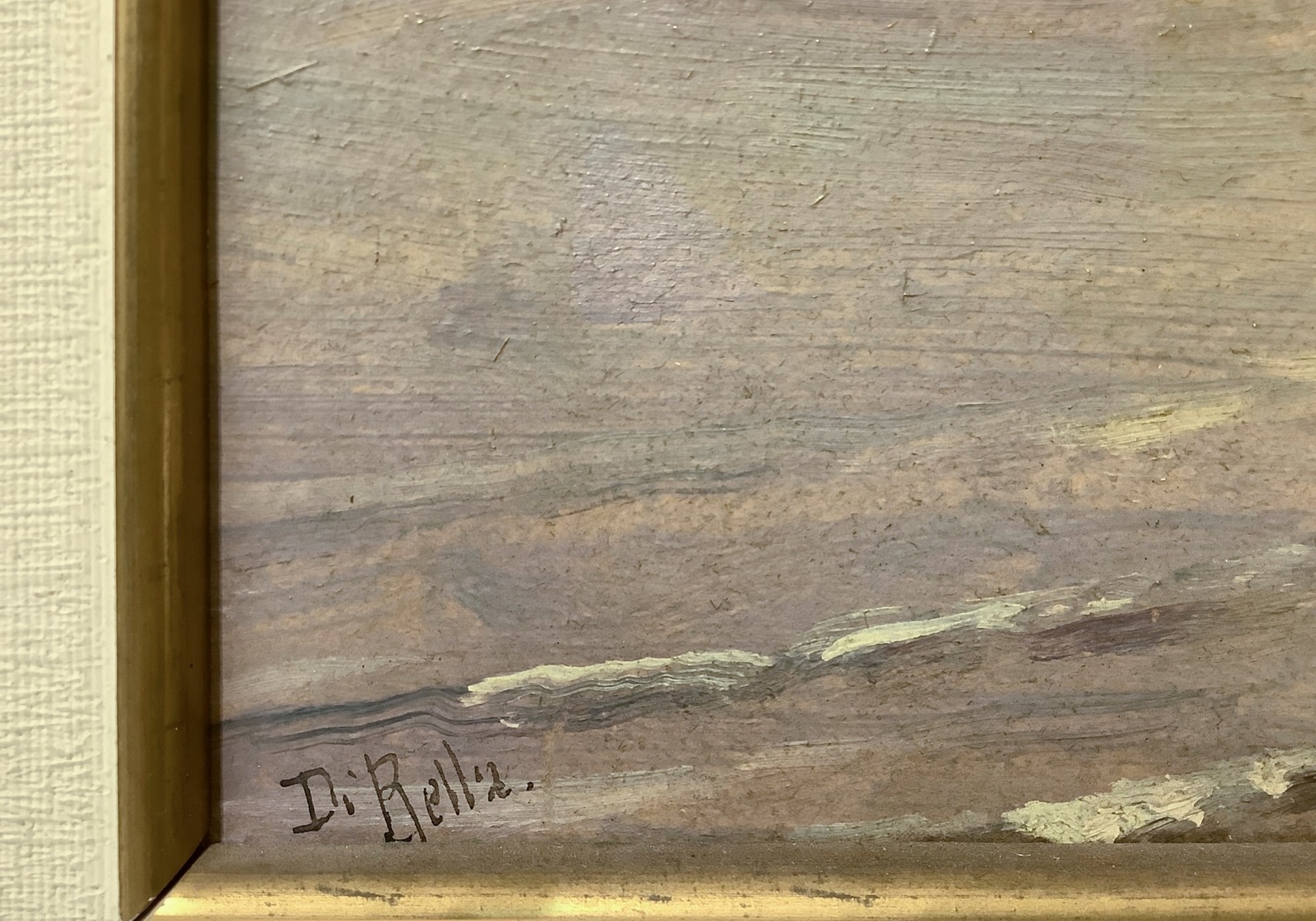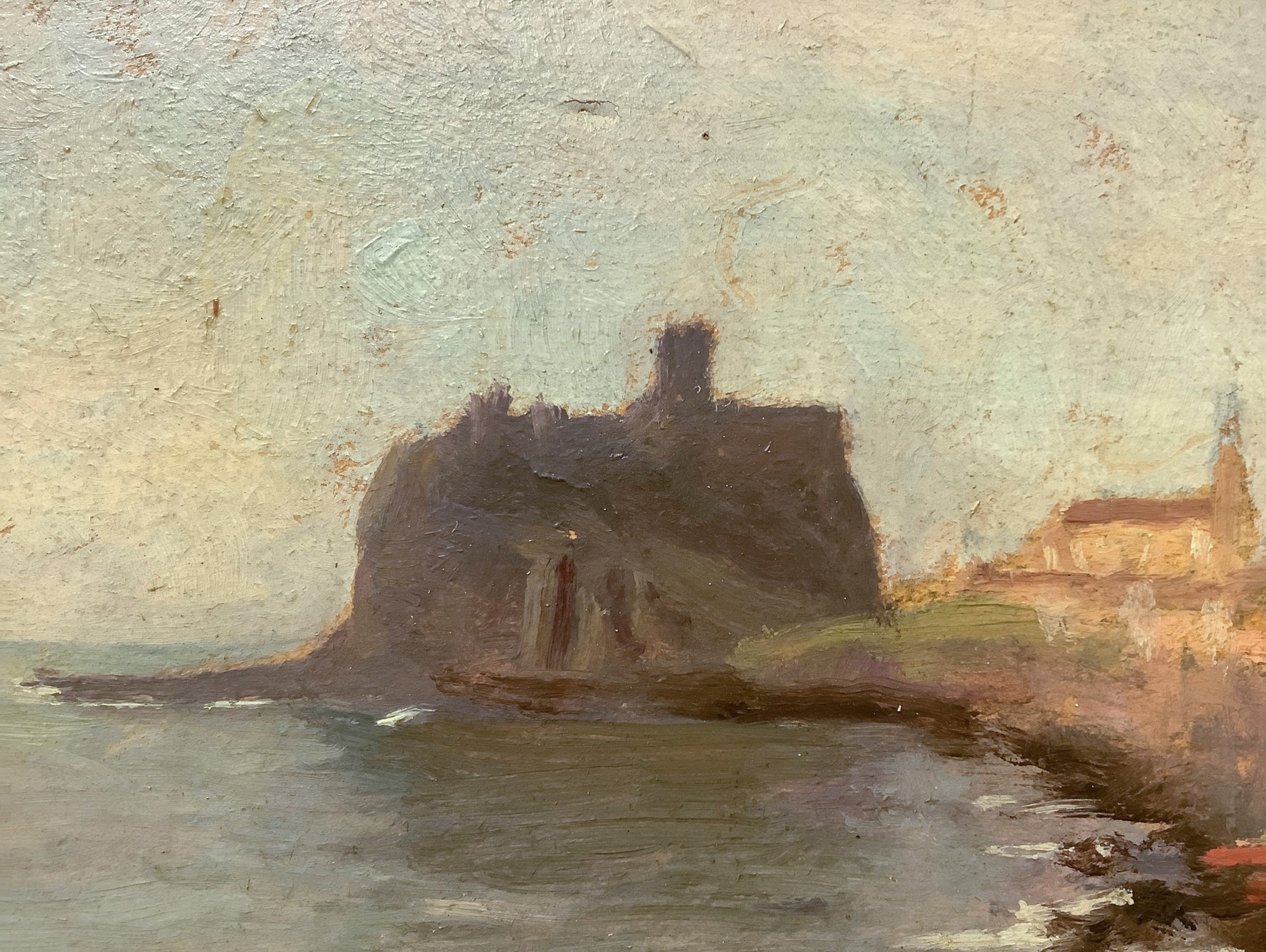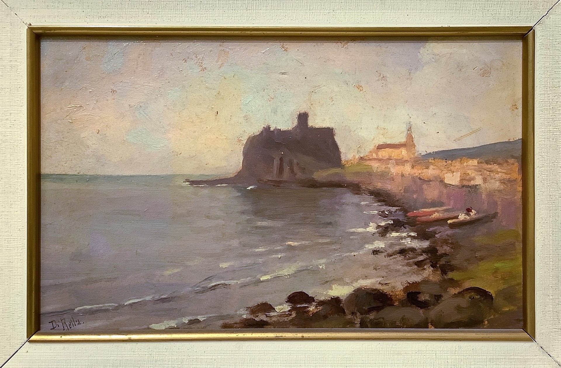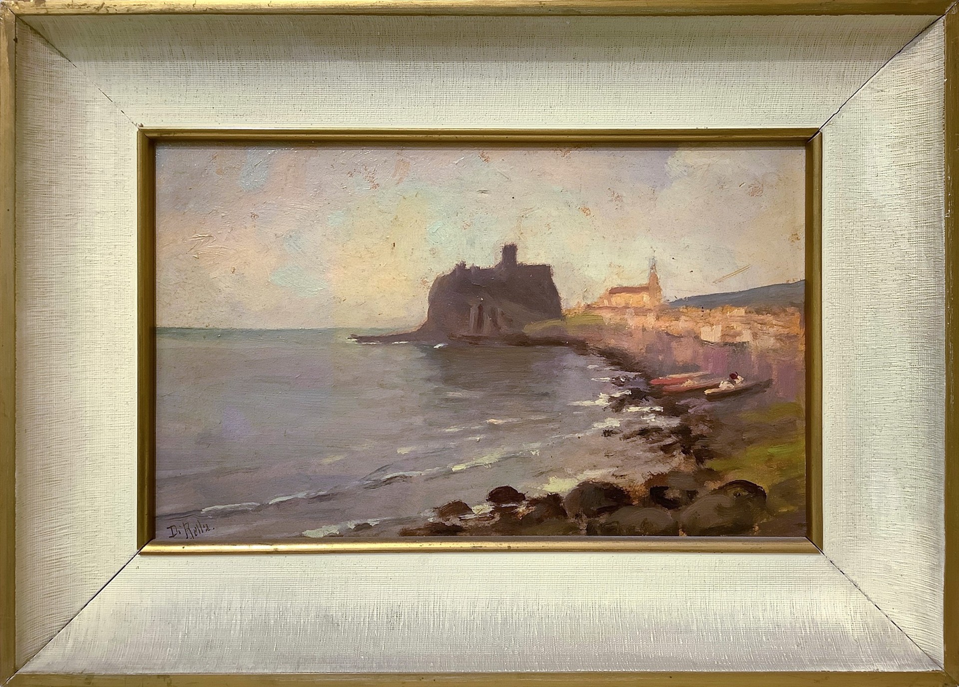 Marina con castello normanno di Acicastello 17x27 cm, in cornice 26x37 cm Dipinto a olio su cartoncino Firmato Di Bella