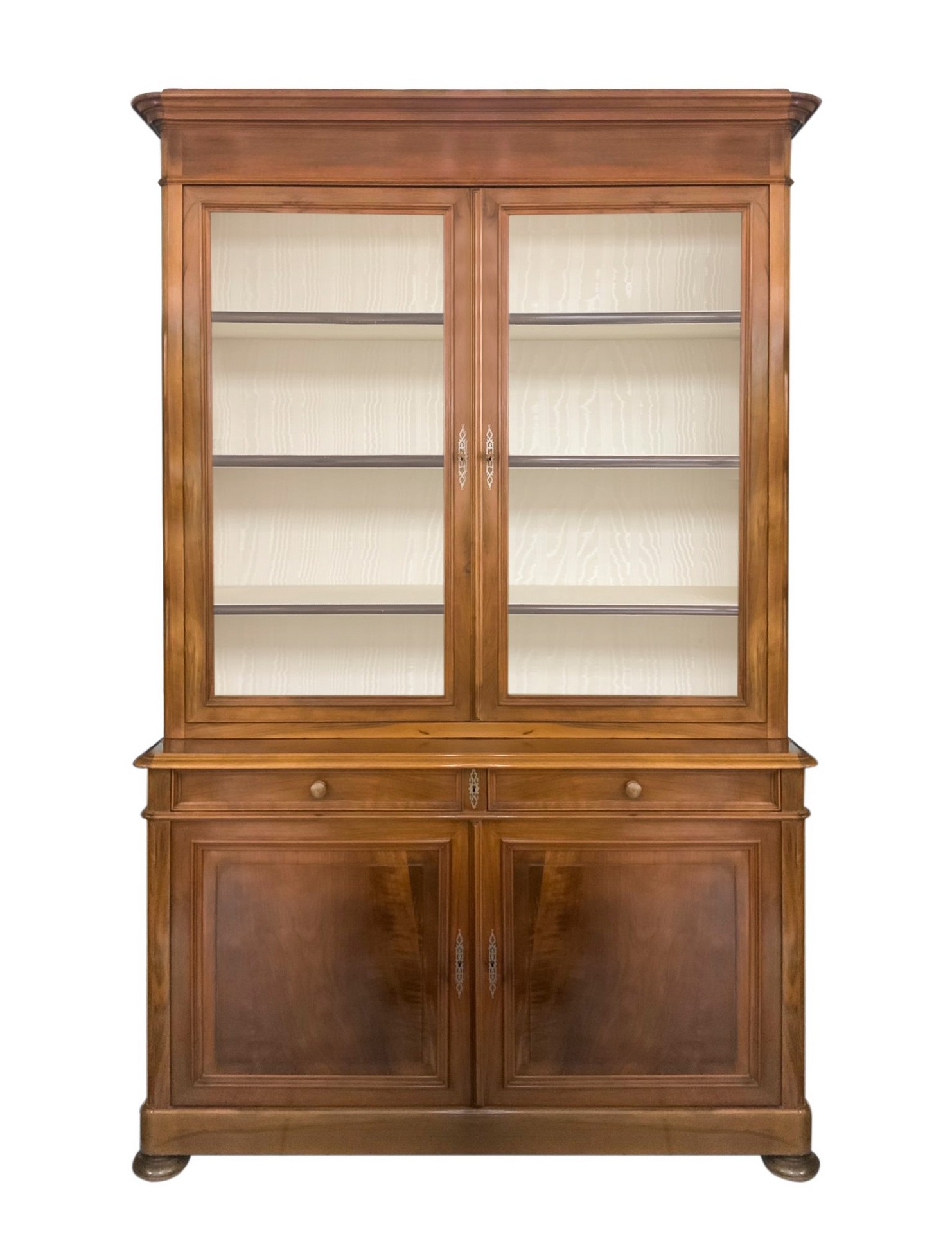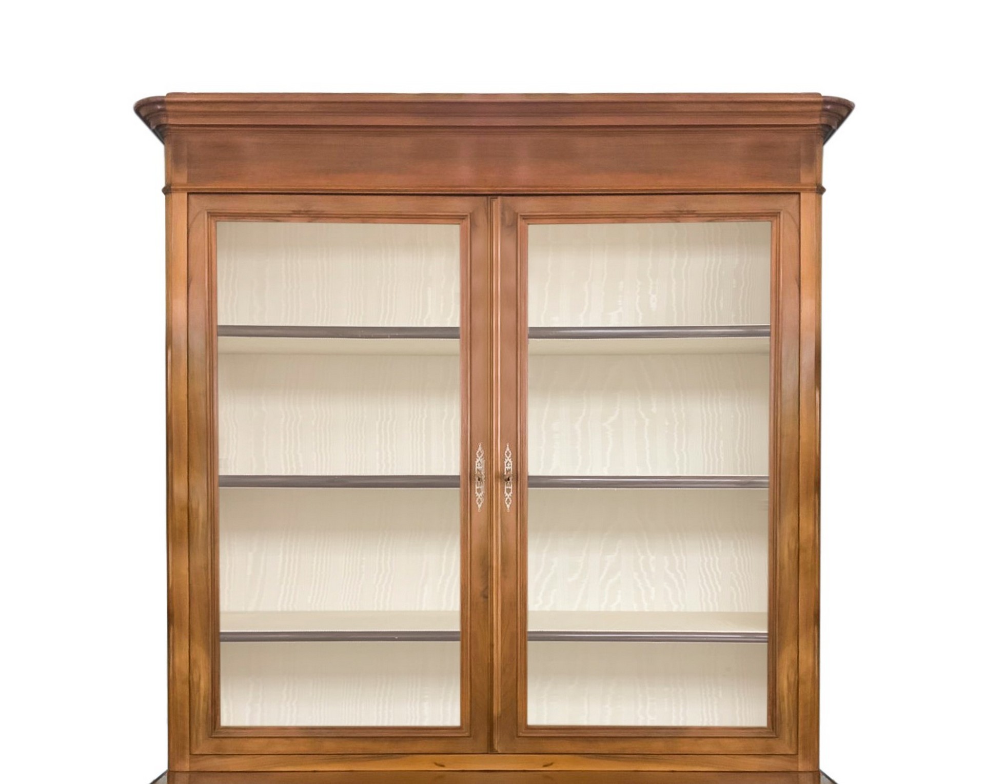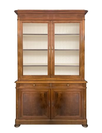 Elegante credenza a due corpi H cm 250, lunghezza cm 155, profondità cm 60 In legno di noce nazionale chiara, corpo superiore a due ante con vetri e corpo inferiore con due cassetti e sottostanti. 2 ante in legno.