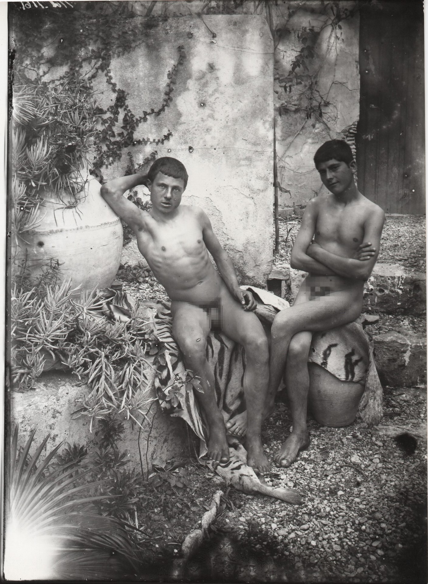 Von Gloeden, Wilhelm (Wismar 1856-Taormina 1931) - 2 ragazzi nudi, seduti. Cm 18x23,9 Fotografia N.1161. Stampa tarda su carta originale.