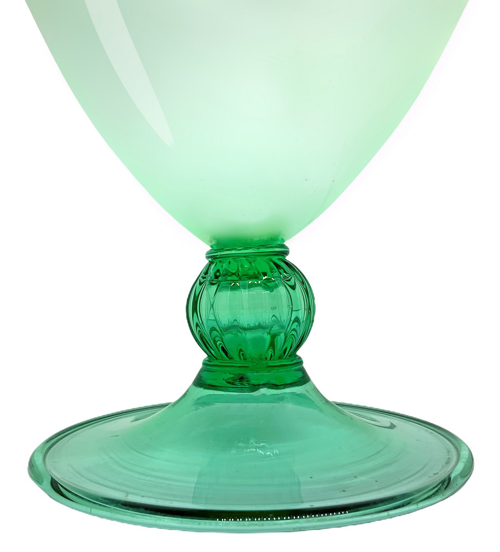 Vittorio Zecchin per Venini (1:Principale) - Bello e imponente vaso modello Veronese in vetro trasparente nei toni del verde acqua, 1992 Piede di forma circolare, raccordo in pasta vitrea, corpo globulare in vetro soffiato, piccolo collo estroflesso. Bordo della base-corpo realizzati in pasta vitrea. Firma della manifattura a punta di diamante.
