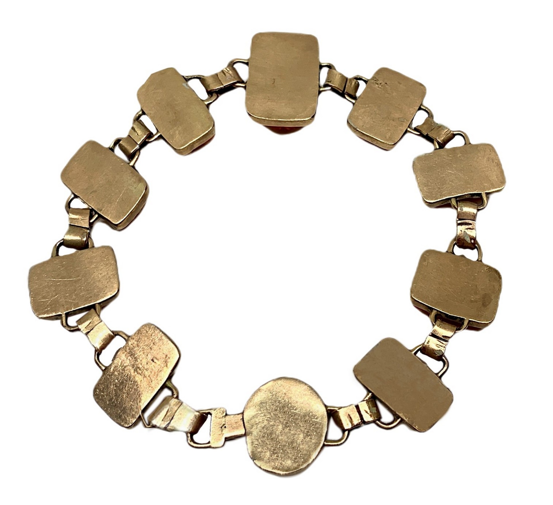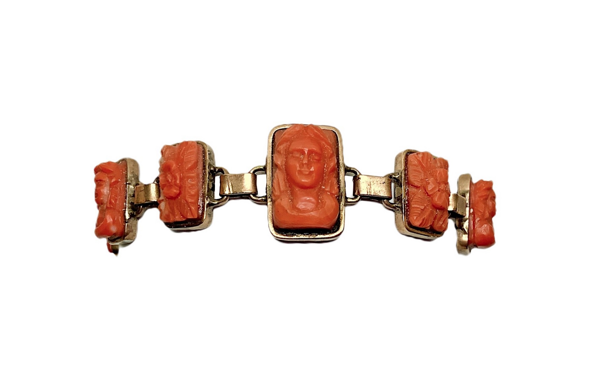 Bracciale in corallo di Sciacca Lunghezza complessiva cm 19,5 con 9 miniature raffiguranti volti e decorazioni floreali