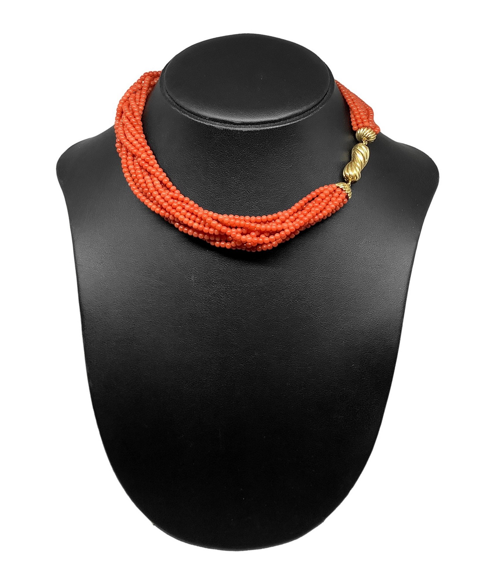 Collana in corallo rosso e susta in oro 80, 5 gr. 20 cm 11 fili di corallo rosso