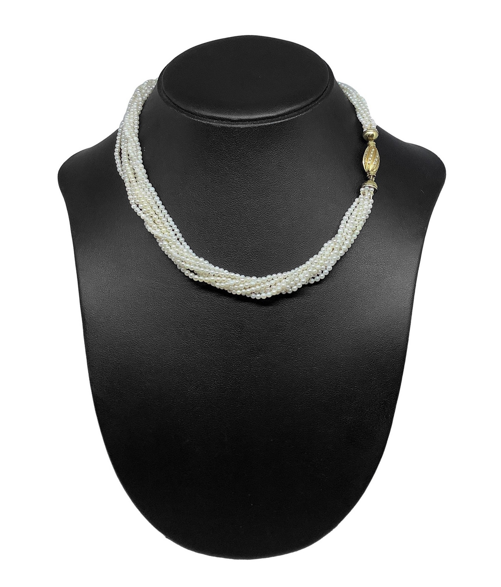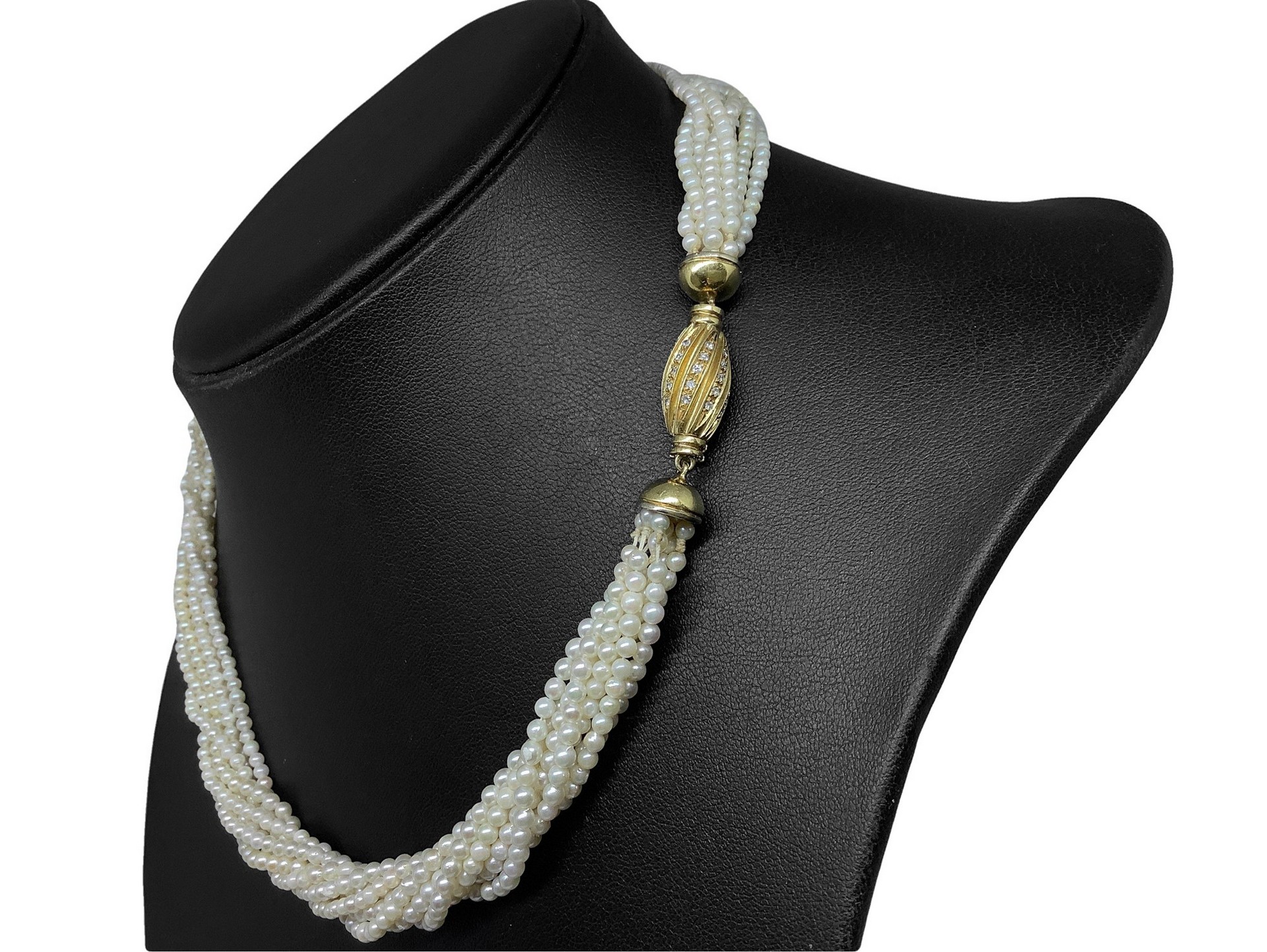 Collana con perline e susta in oro 49,2 gr, 22 cm Torchion a otto fili e chiusura in oro e scaglie di brillantini.