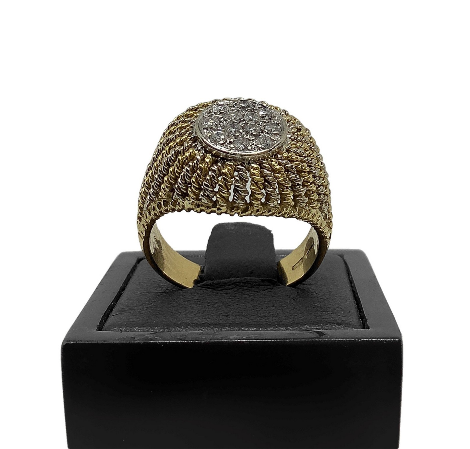 Anello in oro, 20th century 8,3 gr, misura 14 Lavorazione in oro bianco e giallo, maglia lavorazione a cestino in oro bianco e rosso. Nella parte centrale scagliette di brillanti.