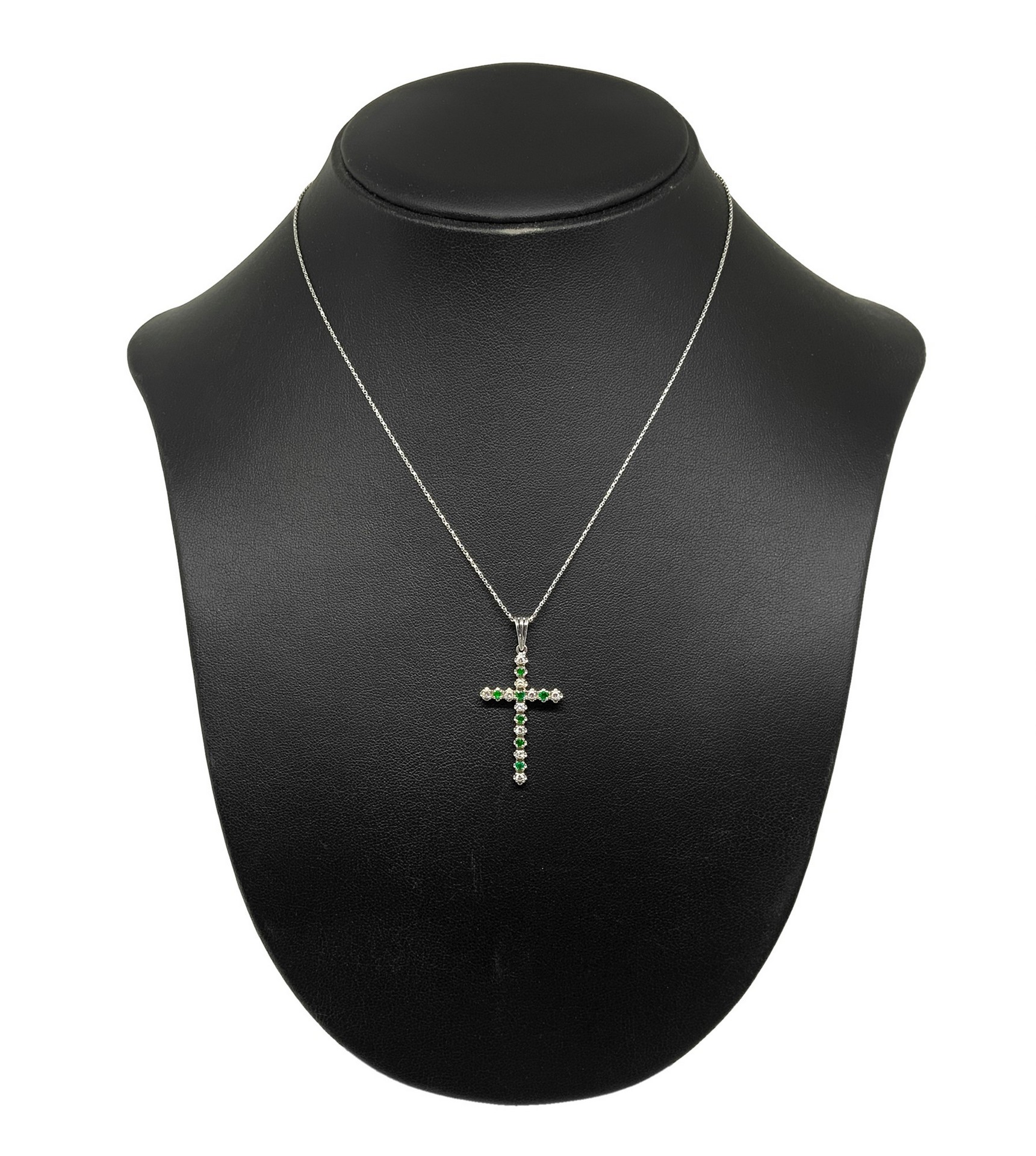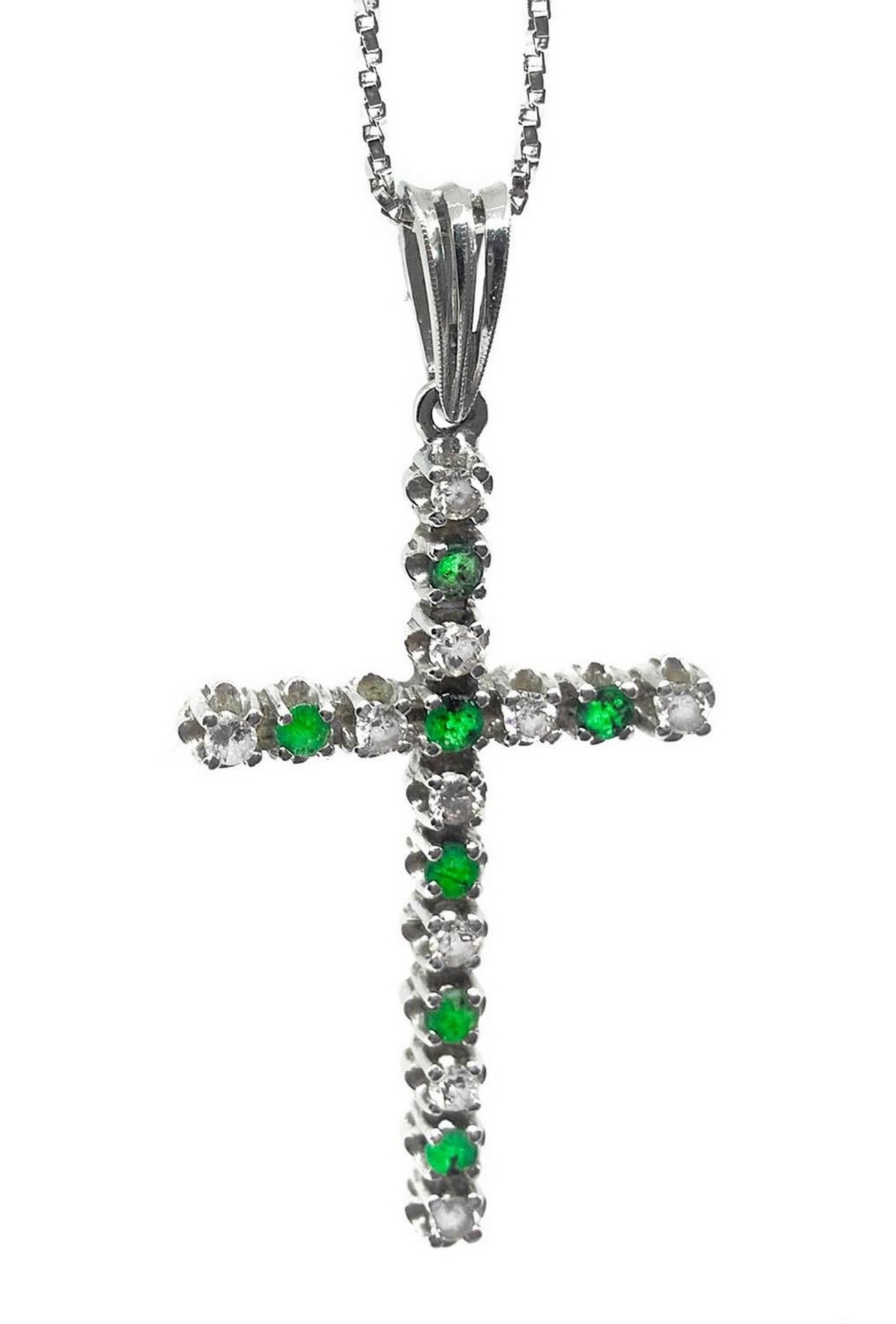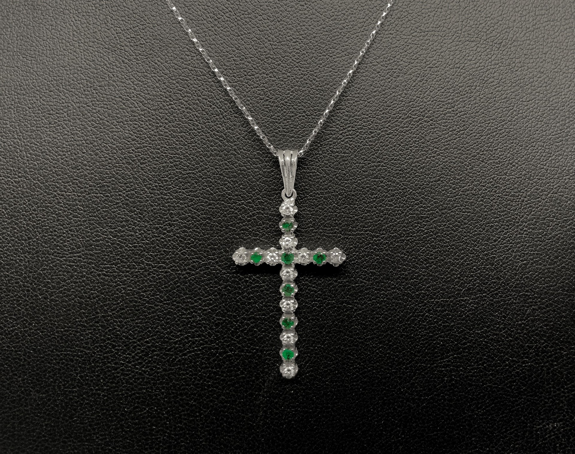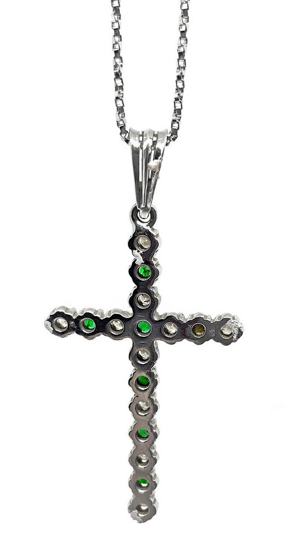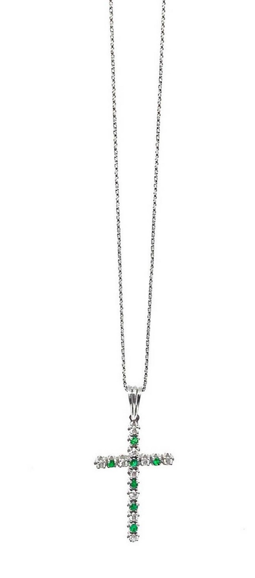 Collana in oro bianco e croce con smeraldi e brillanti Gr 5.1 Ciondolo a croce con piccoli smeraldi e brillantini
