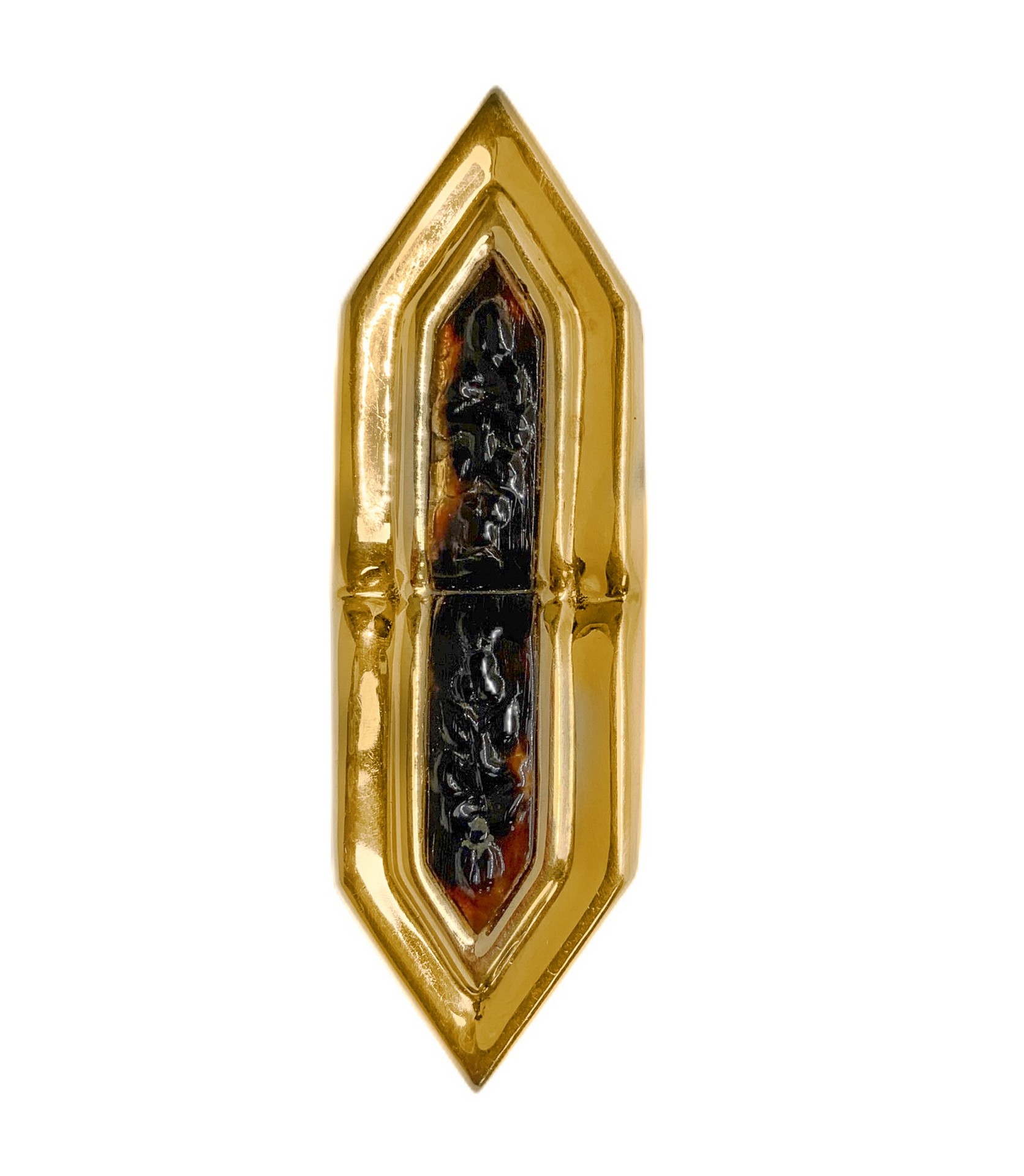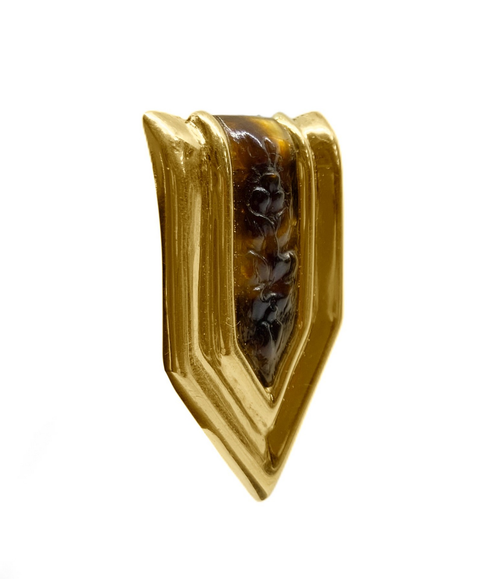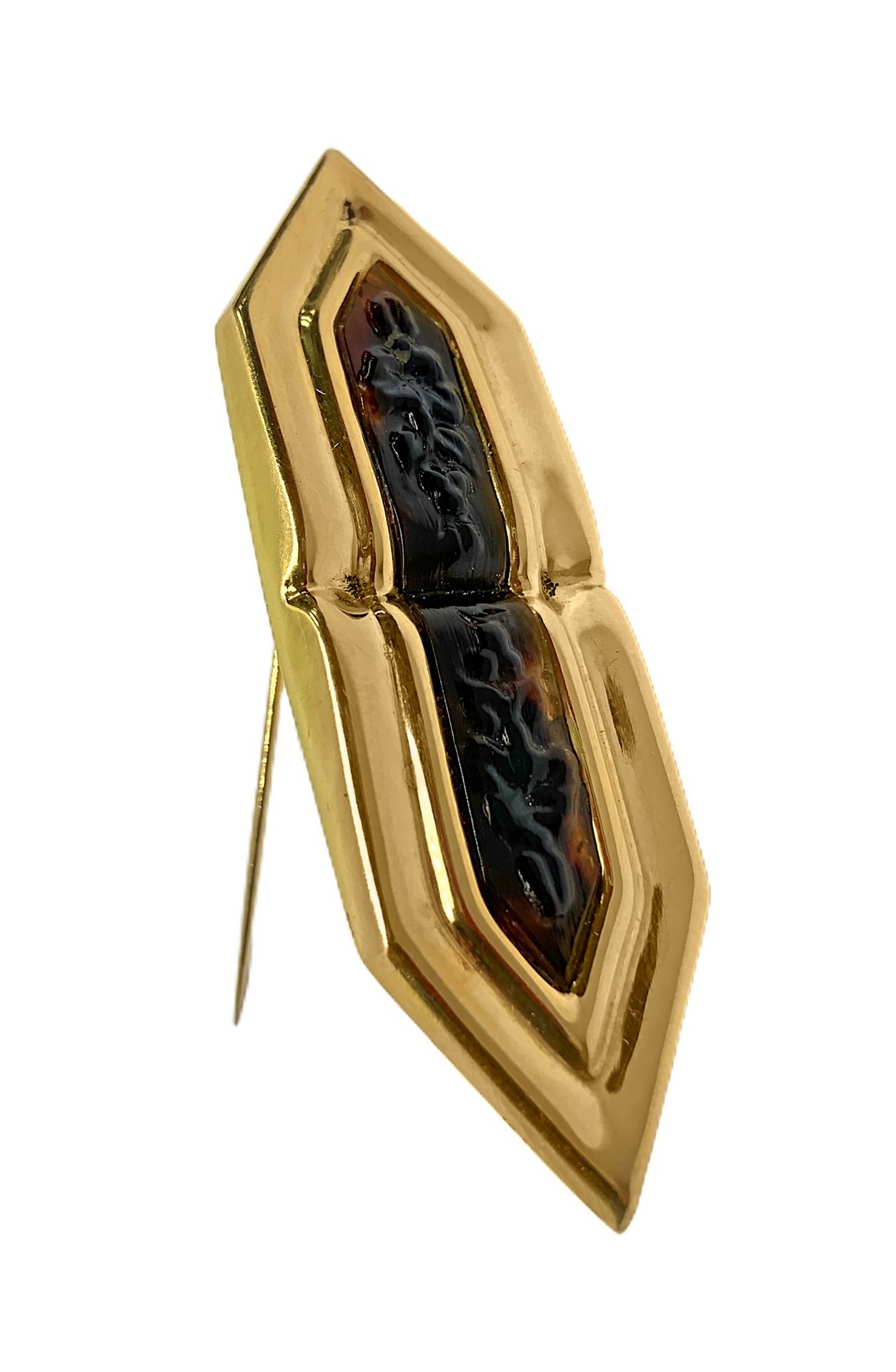 Spilla e orecchini stile Andrè Courrèges, 1960s / 1970s Lunghezza spilla 7 cm Spilla stile Andrè Courrèges anni ’60 in oro ed orecchini analoghi con decori in tartaruga anni ’70.