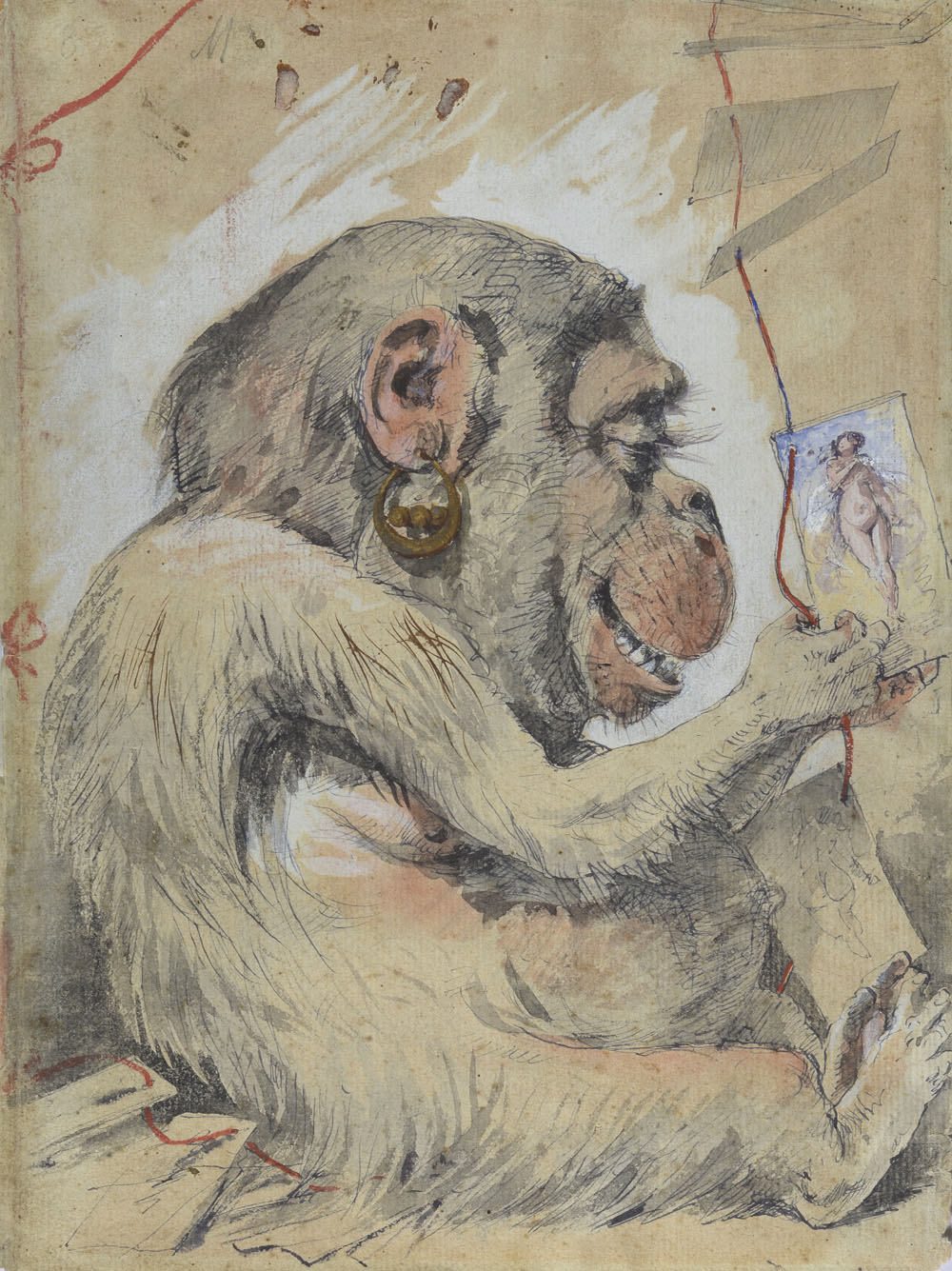 Scuola europea del XIV secolo "Scimmia" Matita di grafite e acquerello su...
