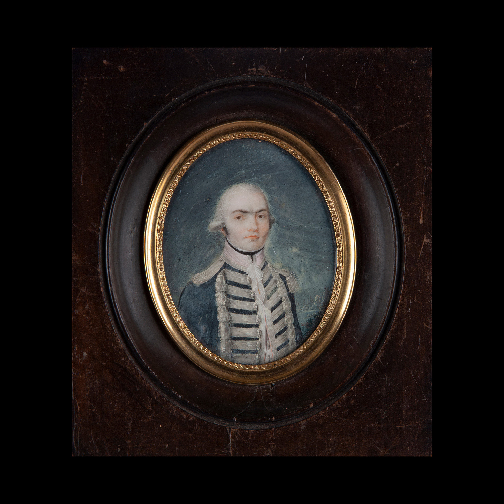 Miniatura con ritratto, Inghilterra fine XVIII inizi XIX secolo Miniatura raffigurante un ufficiale inglese Dimensioni ext. 16x14, int. 10x8 cm.