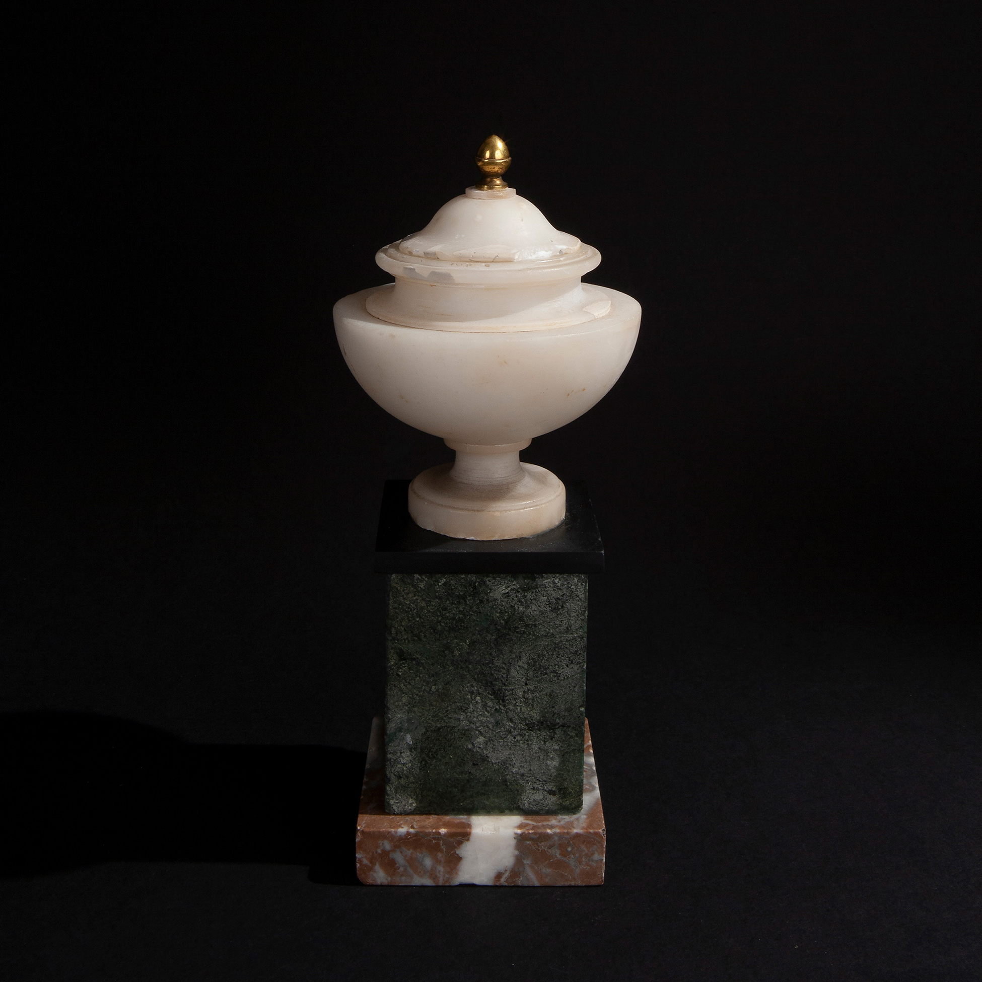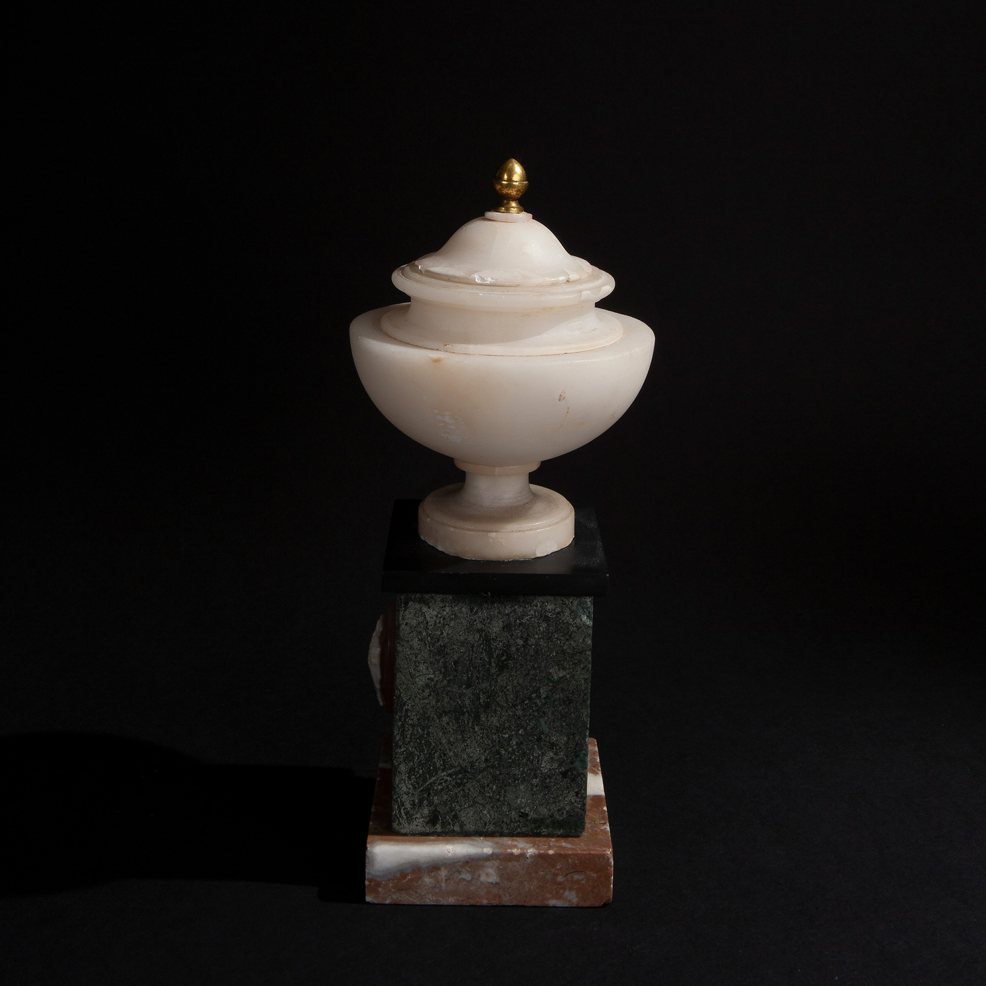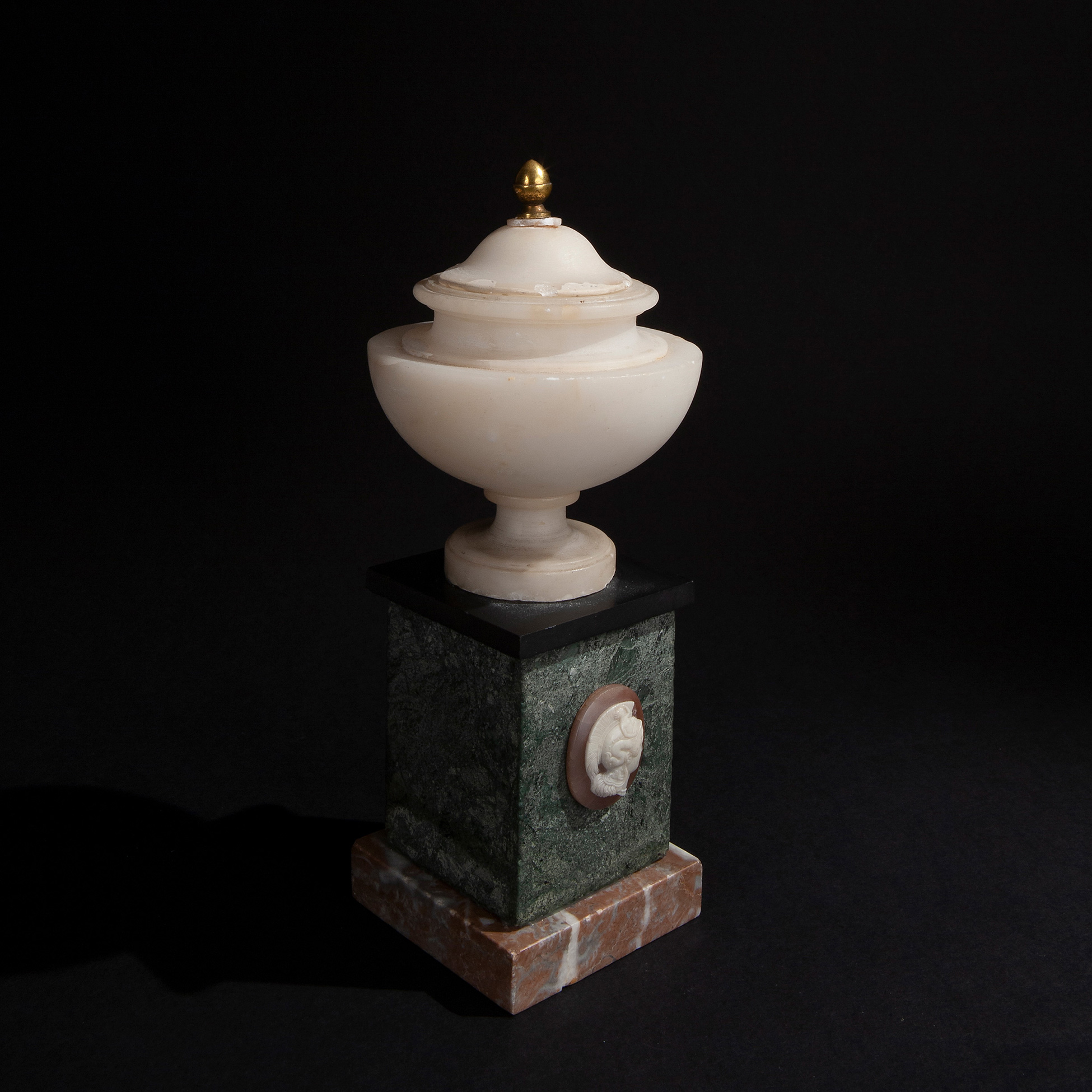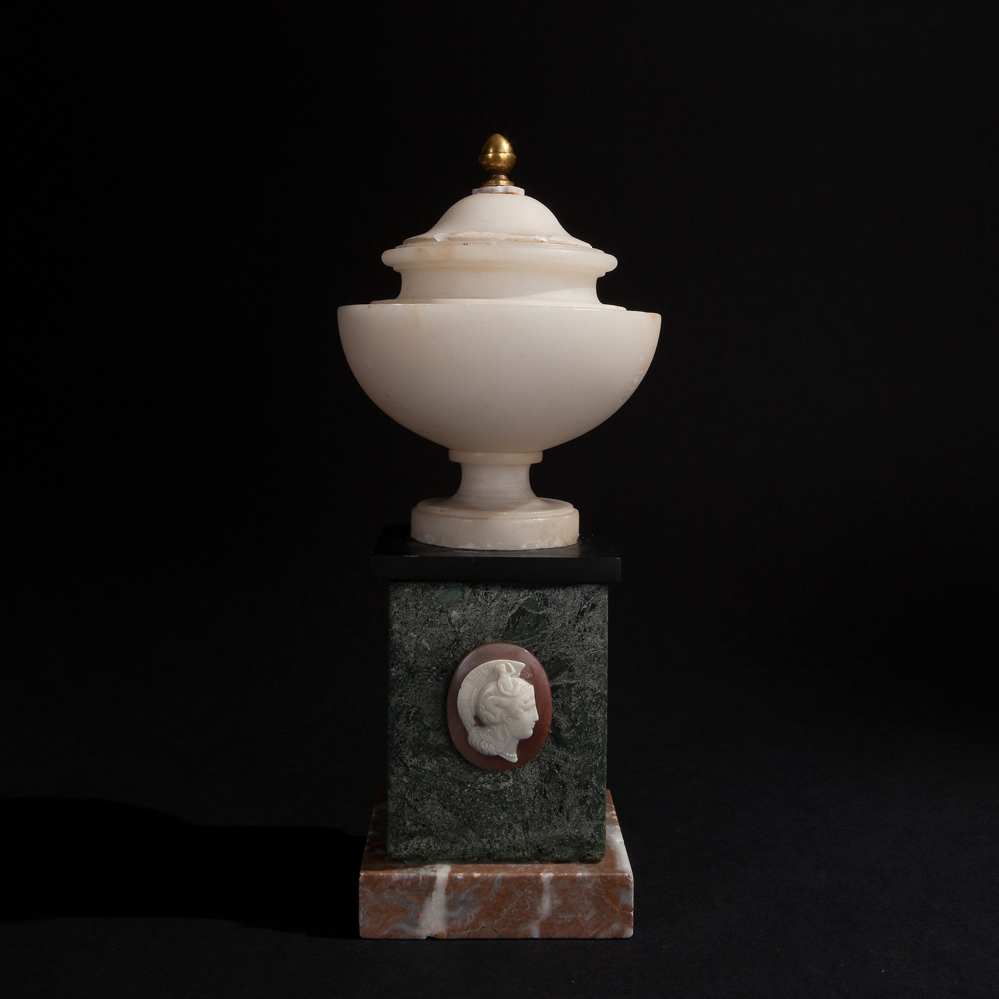 Vaso in alabastro, Italia prima metà XIX secolo Presa del coperchio in bronzo dorato. Base in marmi colorati con cammeo applicato in agata a due strati, raffigurante la dea Minerva Dimensioni 23,5x10x10 cm.