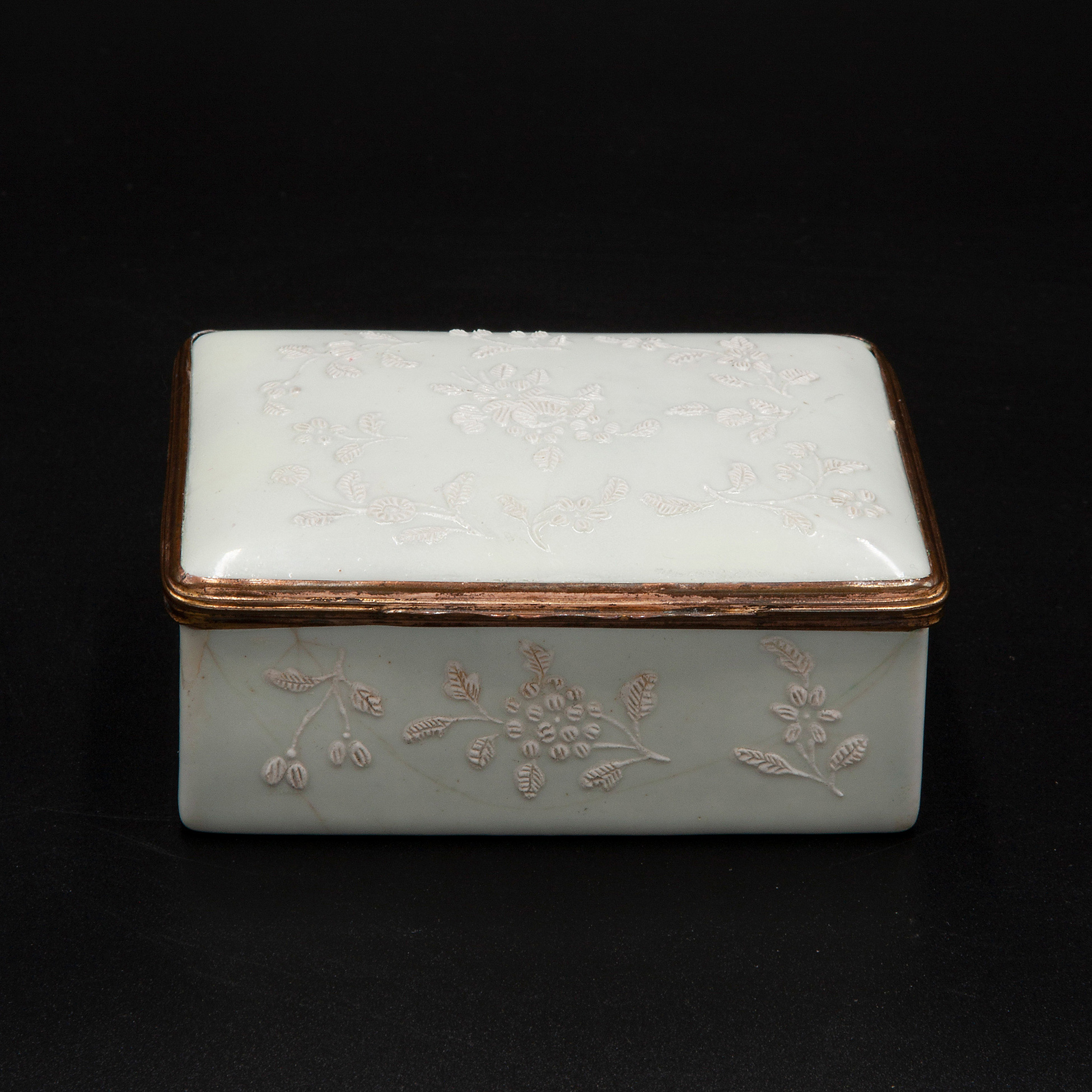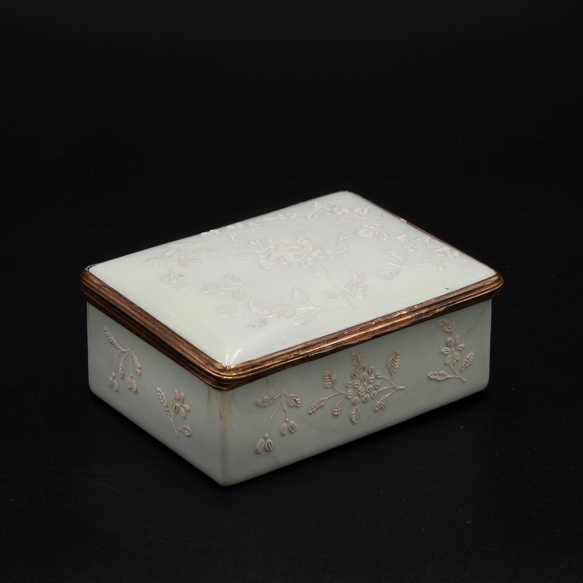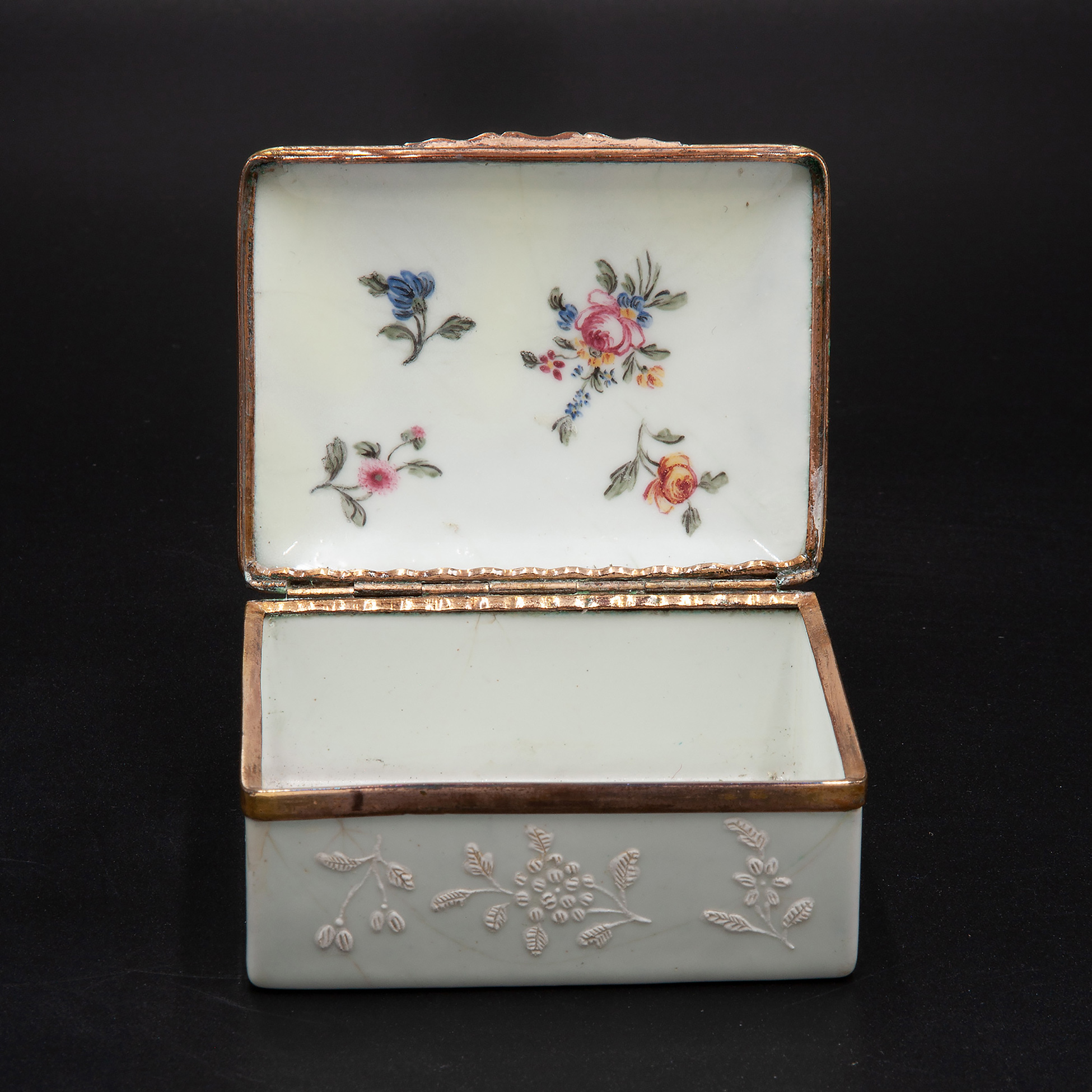 Scatola porta tabacco in porcellana, Germania XVIII secolo Con decorazioni bianco su bianco, manifattura Meissen Dimensioni 4x9x7 cm.
