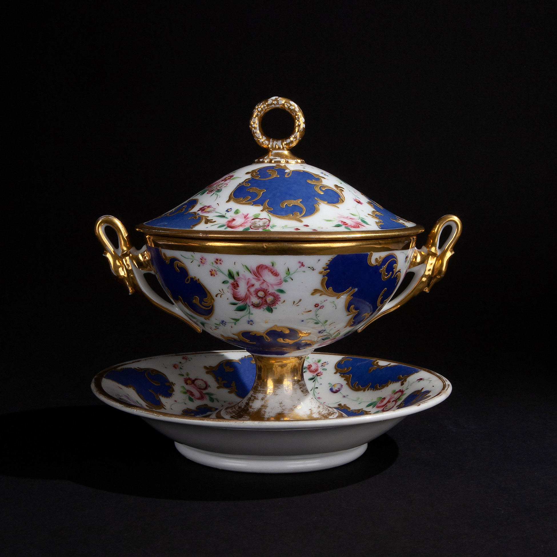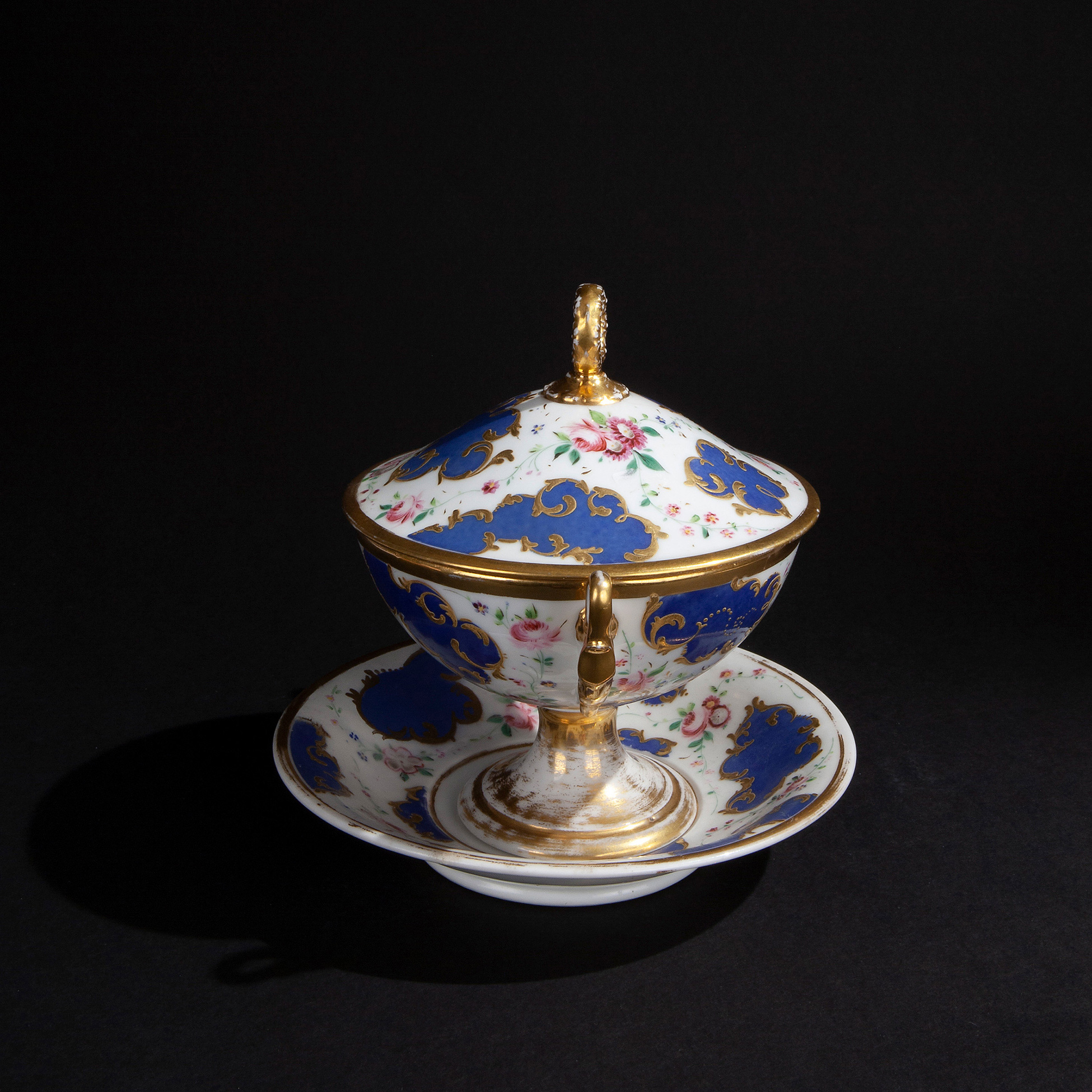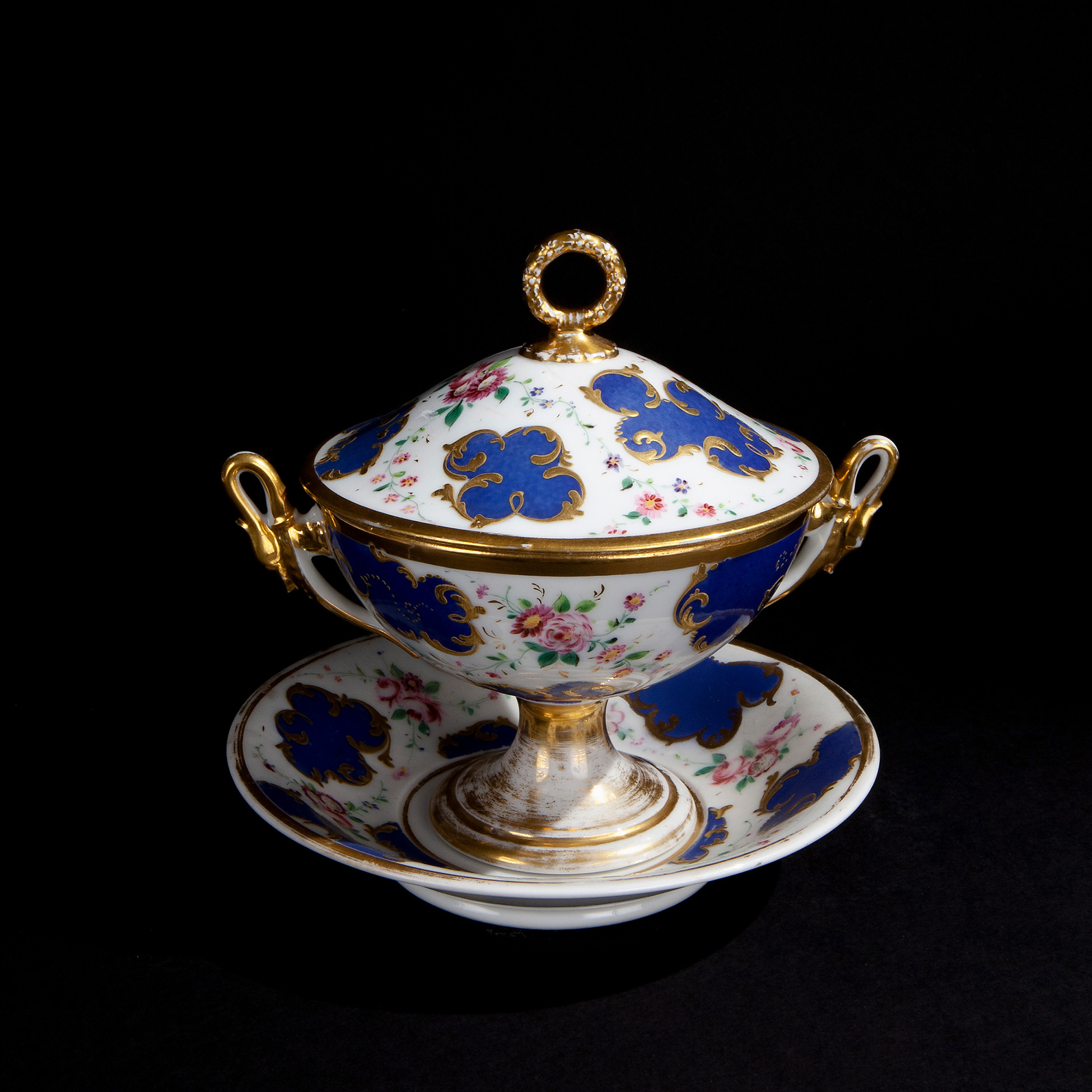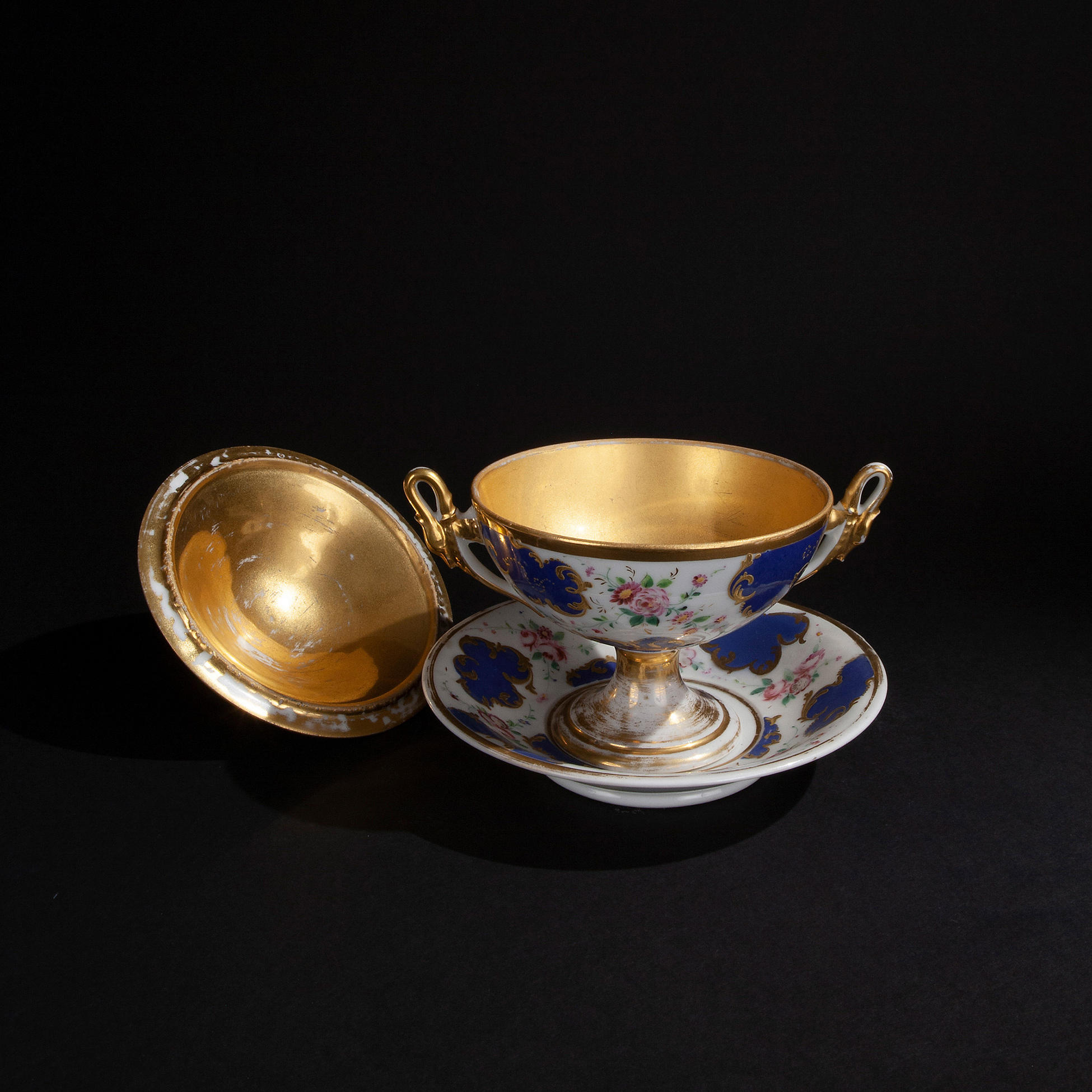 Tazza da puerpera, Francia XIX secolo Decorata a motivi astratti e vegetali blu e oro Dimensioni 17x17x17 cm.
