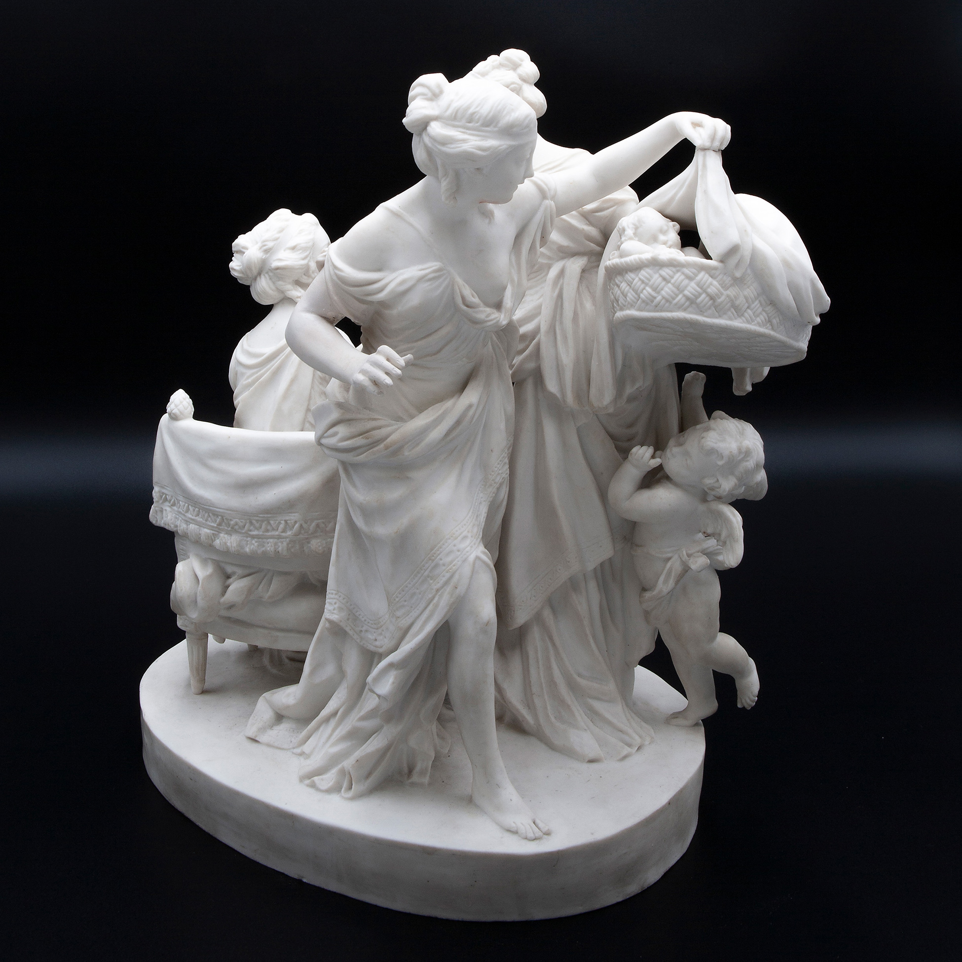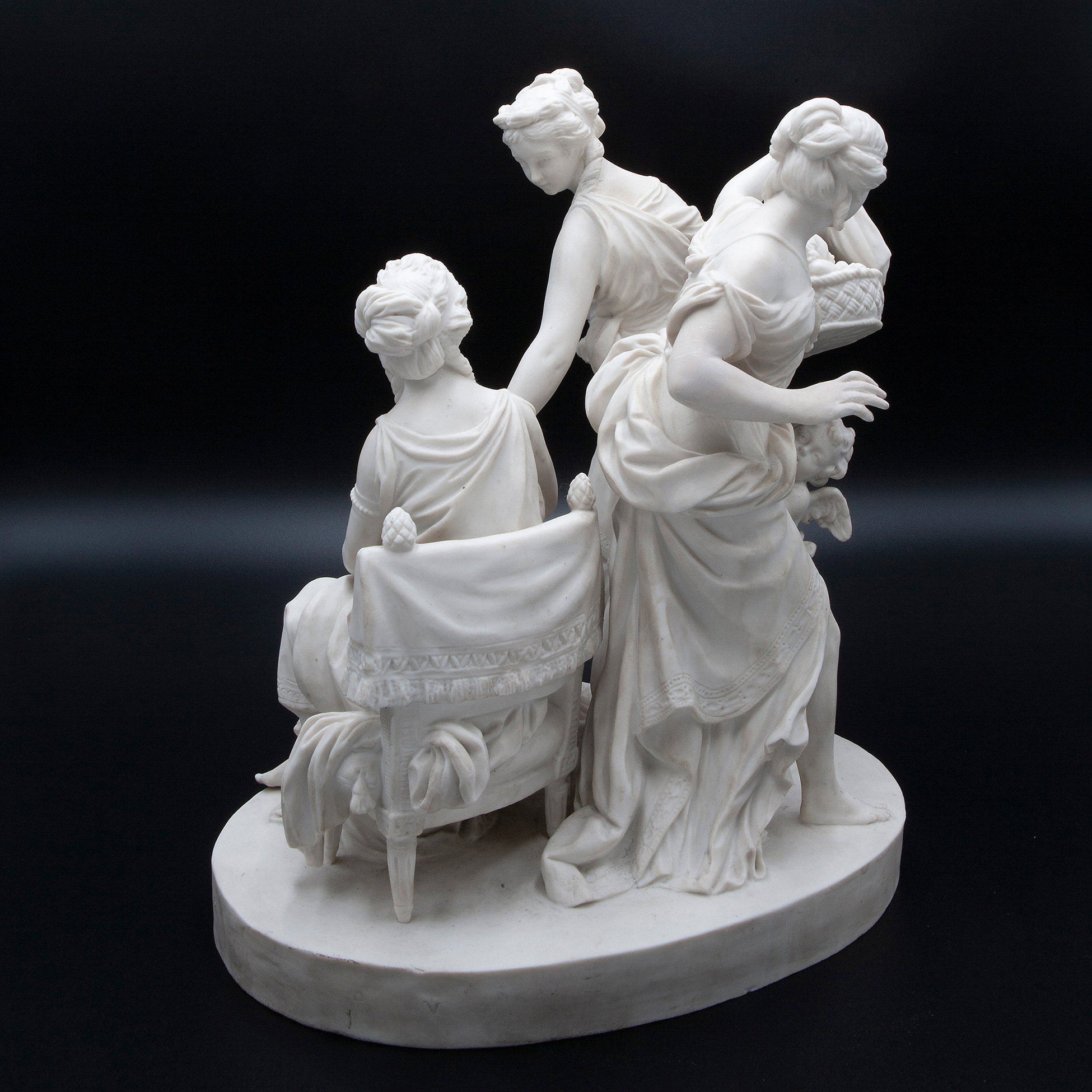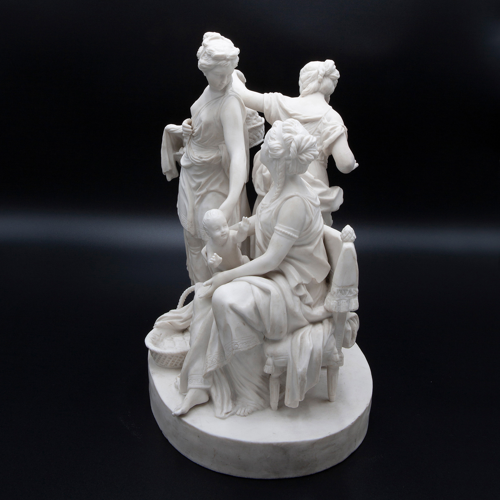 Grande gruppo in porcellana biscuit, Francia 1800 circa Scena di gusto classico raffigurante giovani donne con bambini Dimensioni 31x32x18 cm.
